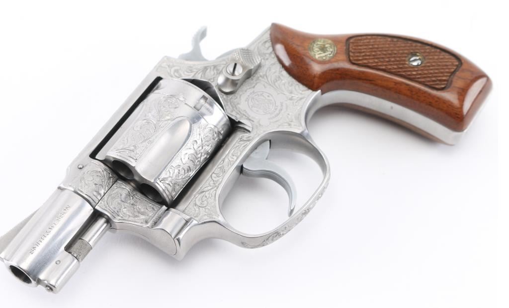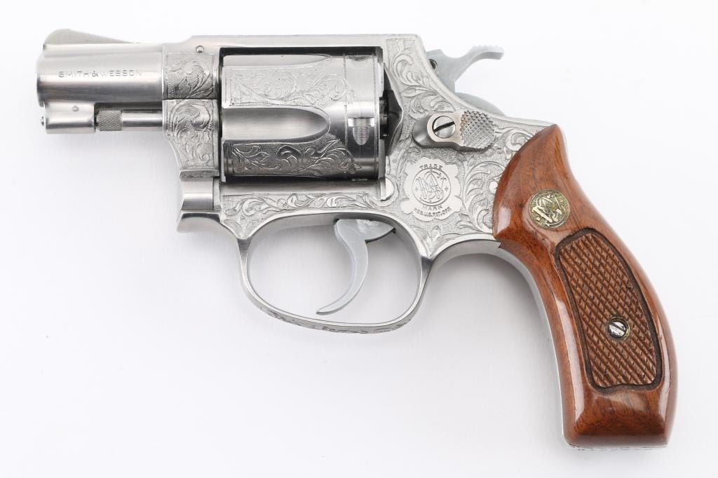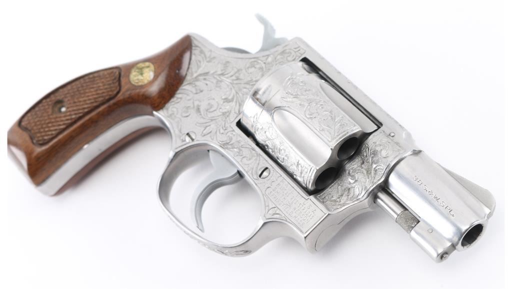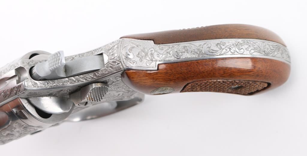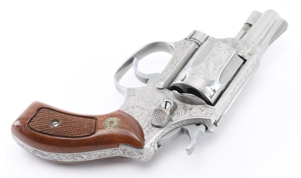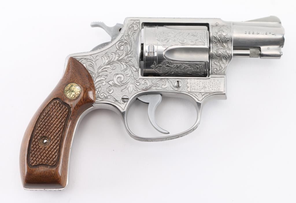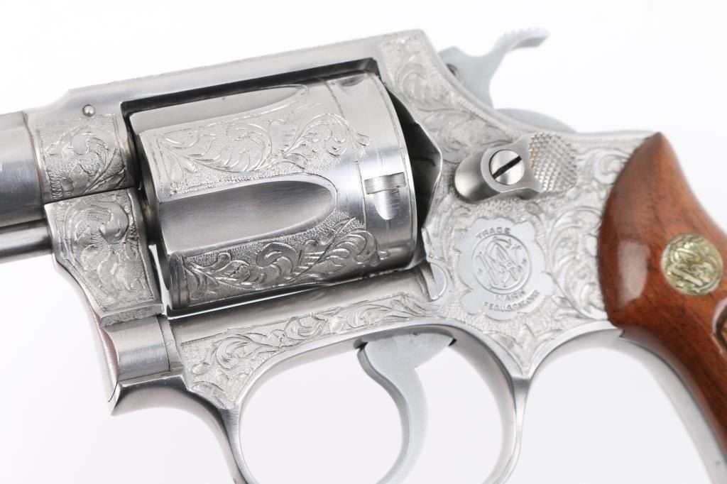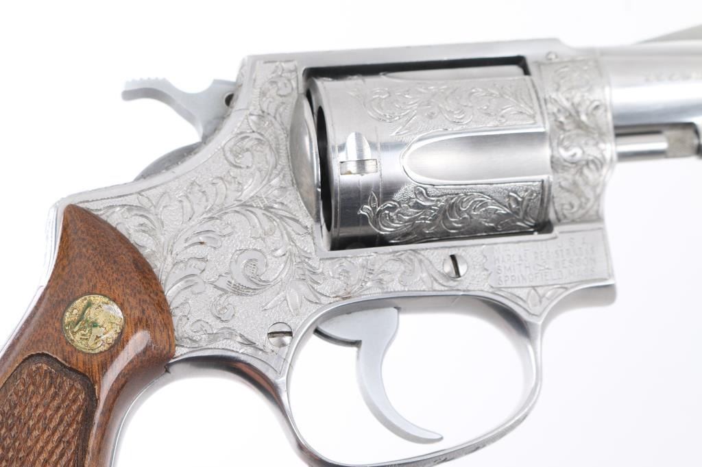 The '.38 Chiefs Special Stainless' Manufactured 1977-78. .Double action 5 shot revolver features stainless steel construction, checkered walnut Magna with S&W medallions grips, 2" pinned barrel, ramp front sight, fixed rear notch sight, "J" frame, smooth trigger, knurled hammer spur, and 5 shot fluted cylinder. The frame, cylinder, triggerguard, and backstrap has been floral/scroll engraved, professionally done. S&W Trade Mark/markings are visible. Bore and chare holes are excellent, grips & finish are excellent, revolver appears unfired. NRA Condition-Excellent+. Modern Firearm.