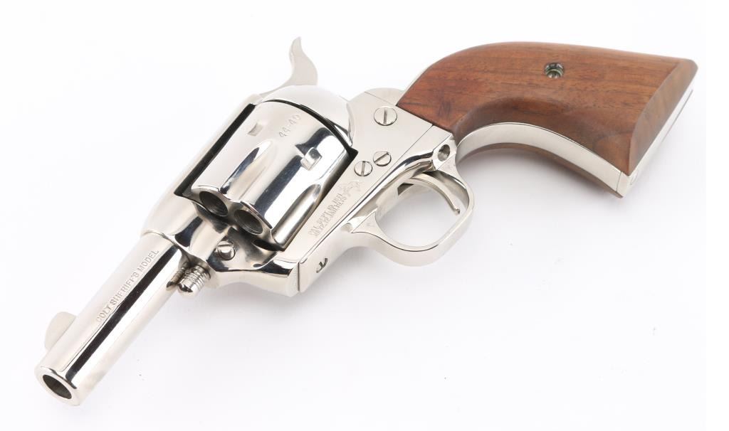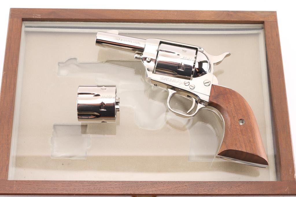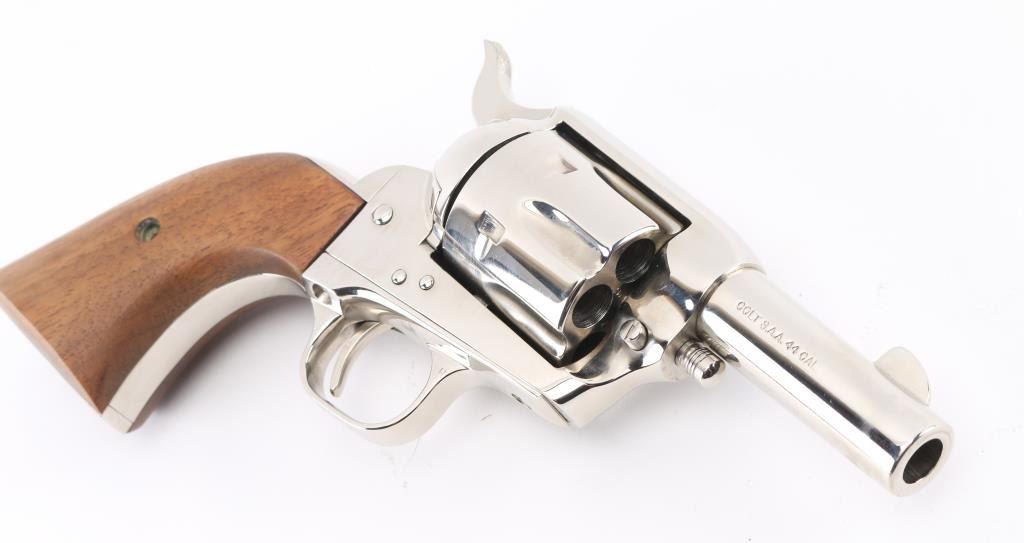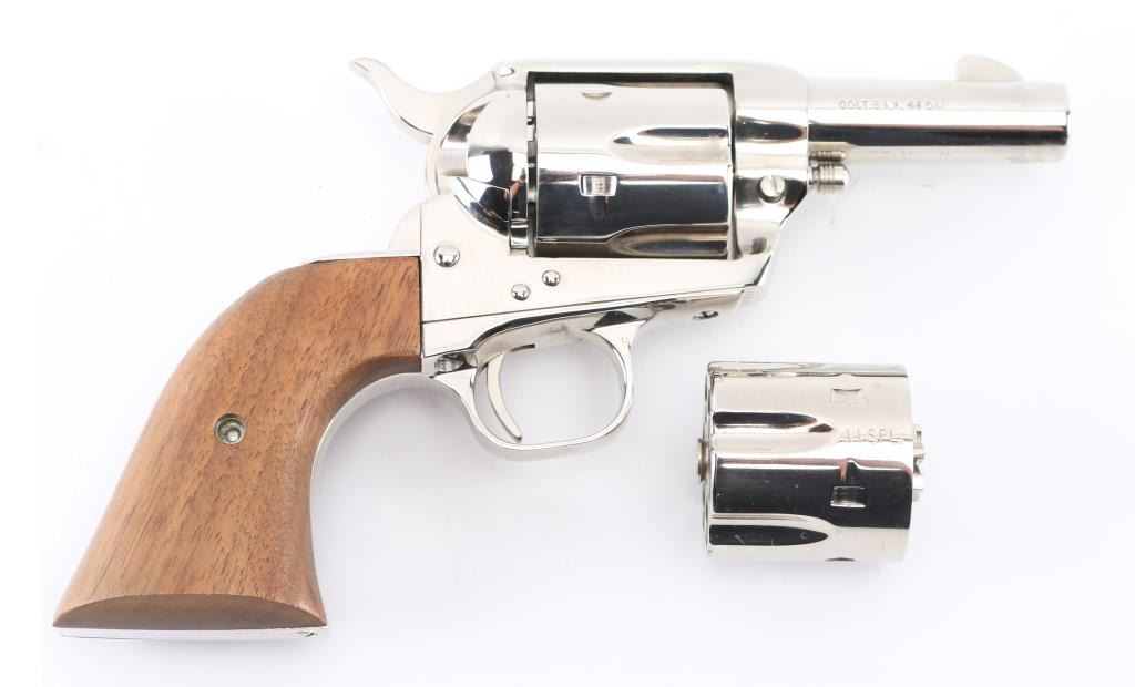 SN: SA41944 'Third Generation' Limited edition single action revolver chambered for .44-40 Winchester & .44 Special with convertible cylinders. Manufactured in Hartford, CT circa 1980. Feature a bright nickel plated finish, 3” round barrel, blade front sight, square notched rear sight, fluted six-shot cylinders, checkered hammer spur, smooth thin trigger, special frame without provision for an ejector rod, and two-piece smooth wood grip. Revolver exhibits little to no signs of use or wear. Action is mechanically sound, the bore is pristine and the wood grips are excellent. Includes a glass top presentation case with beige french fitted interior containing a .44 Special cylinder. Condition is near NRA Perfect. ***Modern Firearm***