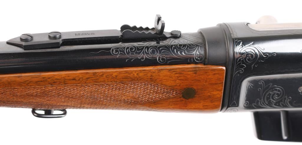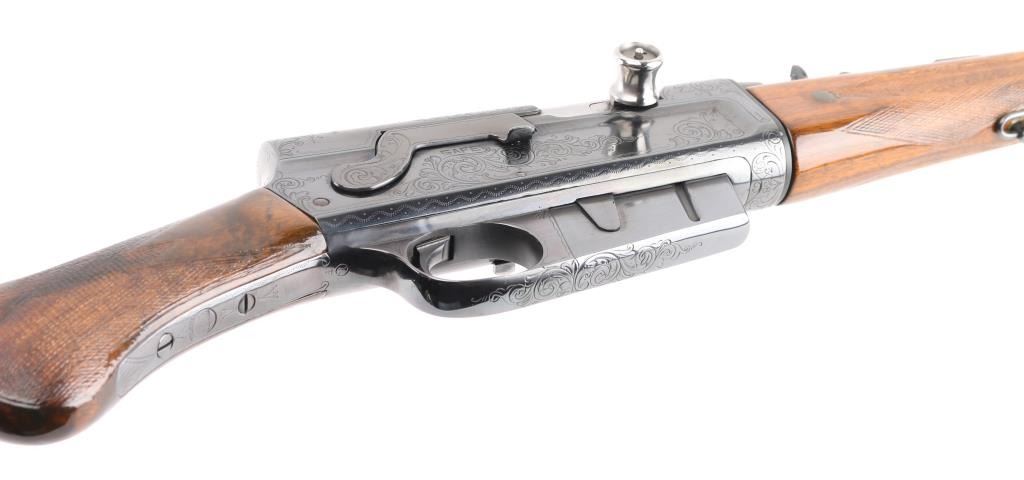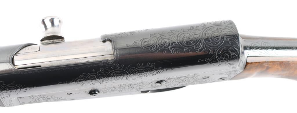 This rifle has been professionally restored Manufactured 1912, featuring the standard factory D-grade flowing foliate scrollwork with zigzag bordering along the action extending slightly onto the barrel jacket., magazine, & triggerguard. 22" barrel with blade/brass bead King sporting sights. The high polish reblued finish is about 99% with a couple of very minor scratches, all markings are crisp/clear, action is smooth, the bore is overall very good/bright with strong rifling, there is a small area of light pitting about midway. High gloss finished stocks are excellent, factory hard rubber buttplate, 'Prince of Wales' style grip, checkered panels at the wrist & forearm, sling swivel on the forearm. NRA Condition-Very Good as Restored, C&R Firearm.