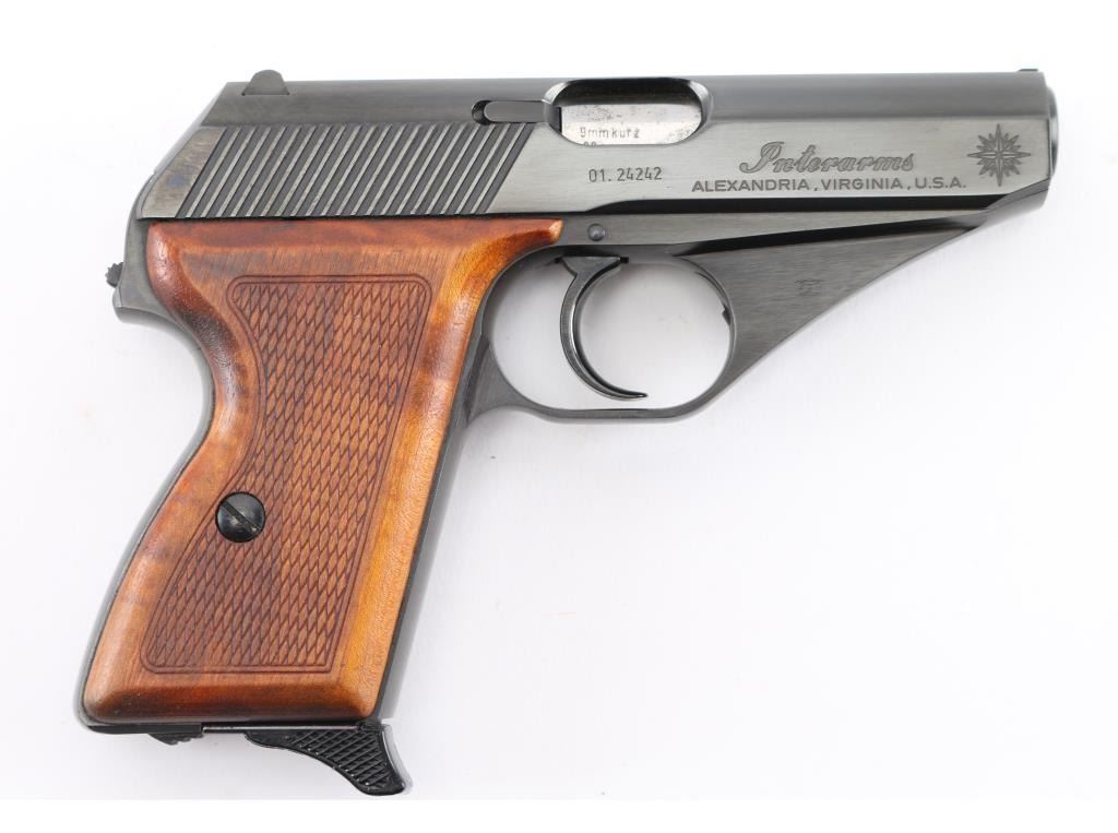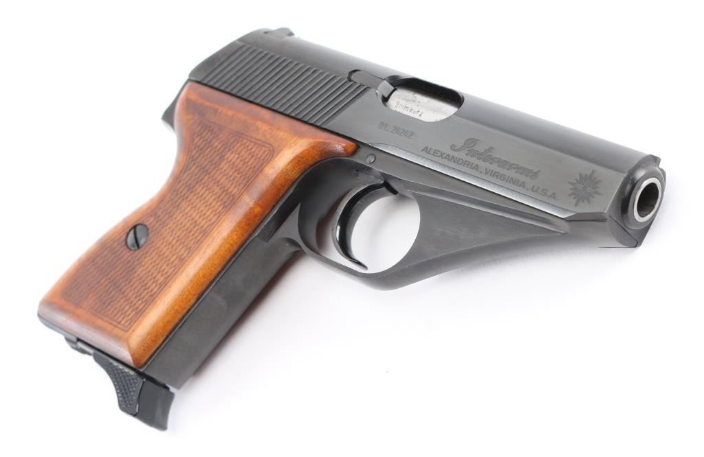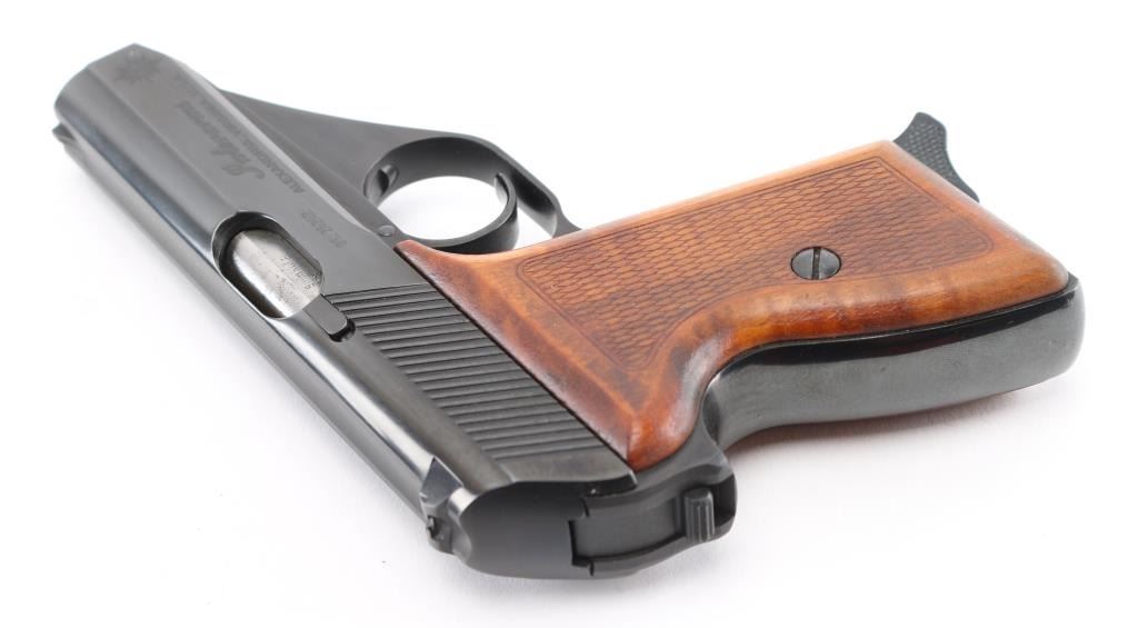 German made compact semi-automatic pistol, DA, also chambers the 9x17mm Browning Short, blowback operated, approximately 3 1/4" barrel, bore is bright, the barrel can be detached from the frame by the release of the lock, located inside of the triggerguard, the slide has serrations at the rear, front sight blade is concealed within longitudinal groove on the top of the slide, open notch rear sight, the hammer is concealed within the slide except for the small lip that protrudes from under the slide and allows for manual cocking, the safety switch is mounted on the slide and when engaged (lowered), moves the rear part of the firing pin out of the reach of hammer and locks it, smooth trigger, checkered wood grips, smooth frontstrap and backstrap, single stack magazine, The serial numbers on the frame and slide match. Includes a blue box inside the original cardboard sleeve with instruction manual cleaning rod,and extra magazine. **NRA Near Perfect** Modern Firearm