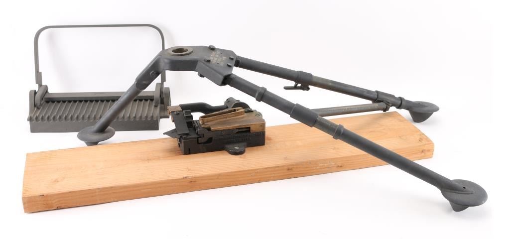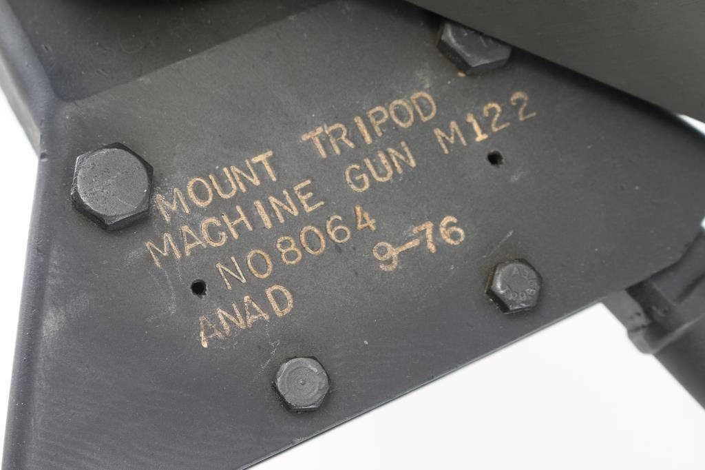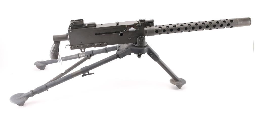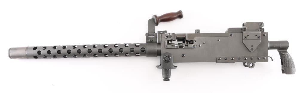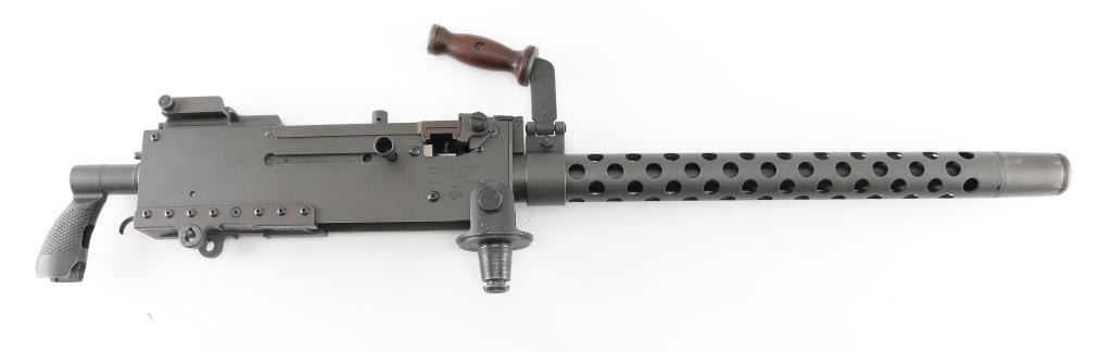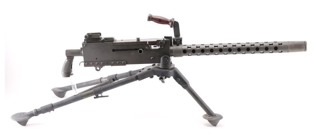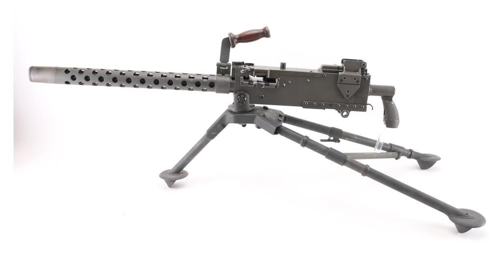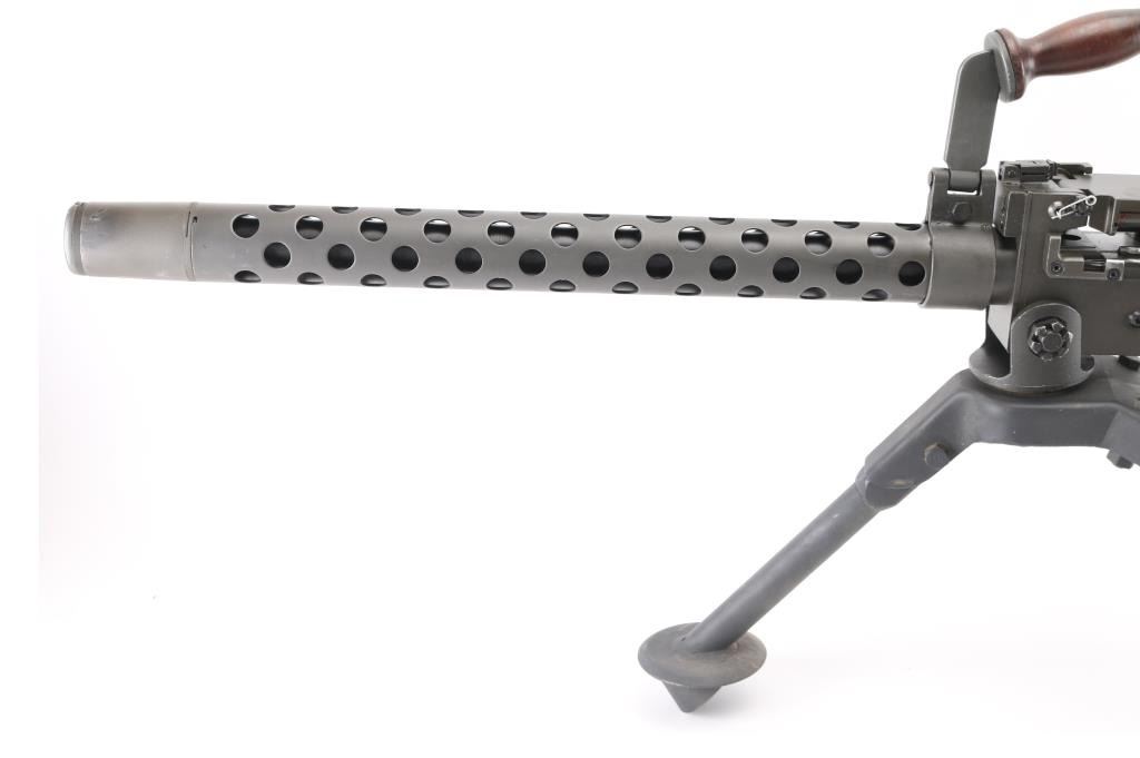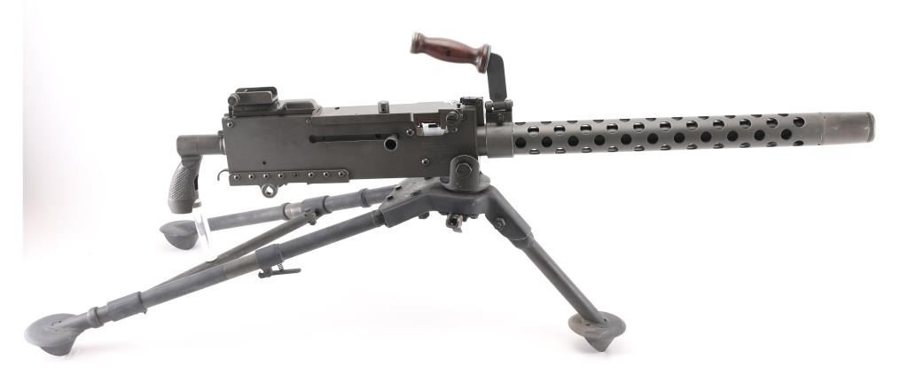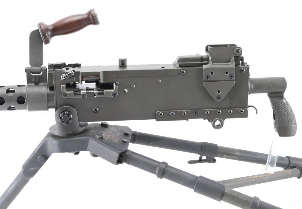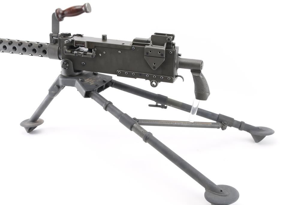 Fully transferable belt fed machinegun, made from original parts with a new side plate. This is identical to the medium machinegun used by US and other forces in WWII and after. This is the ground mount configuration. Features parkerized dark gray finish, 24" barrel, adjustable sights, rear pistol grip with trigger, walnut gripped carry handle. Bore is excellent bright condition. Excellent condition finish overall shows handling marks & edge losses. Includes excellent condition US M122 tripod (cradle is attached to machine gun), and linking tool for assembling ammunition belts. Condition is near NRA Excellent ***NFA Firearm*** ***Fully Transferable***