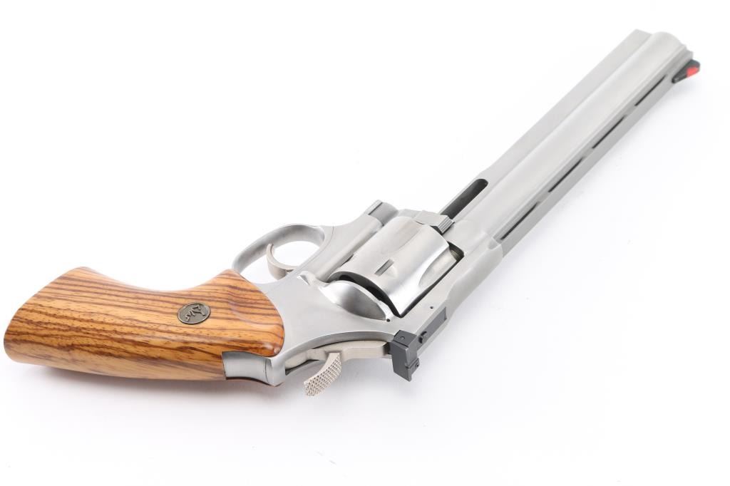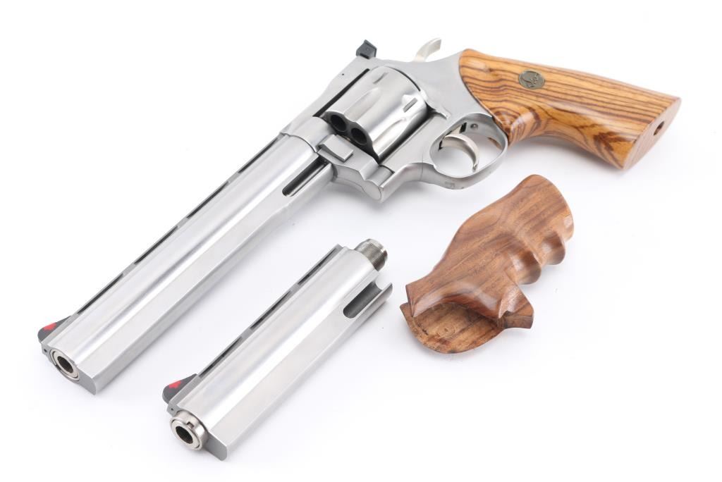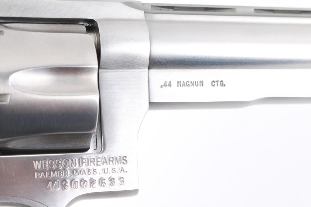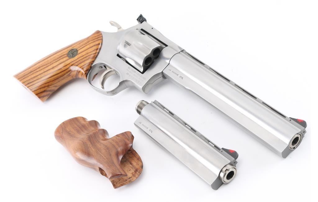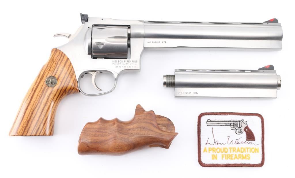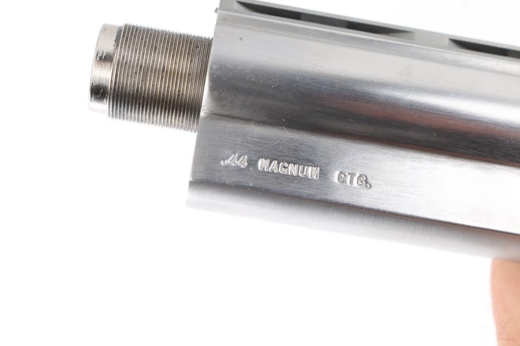 Stainless steel large frame double action revolver chambered in .44 Magnum, manufactured in Palmer, MA. Features a satin finish, interchangeable 8" barrel/shroud with ventilation sighting rib & full underlug, serrated ramp front sight with red insert. fully-adjustable rear sight, fluted six-shot cylinder, smooth trigger, checkered hammer spur, transfer bar safety, and one-piece smooth wood grip. Revolver exhibits few signs of use with no major wear observed. Action is smooth with very good lock-up, the bore is excellent, and striped wood grip is excellent. Includes a hard case with fitted foam interior containing an instruction manual, two spare front sights, a one-piece finger groove walnut grip, a 4" full-underlug vent rib barrel, and tools. Condition is NRA Excellent. ***Modern Firearm***