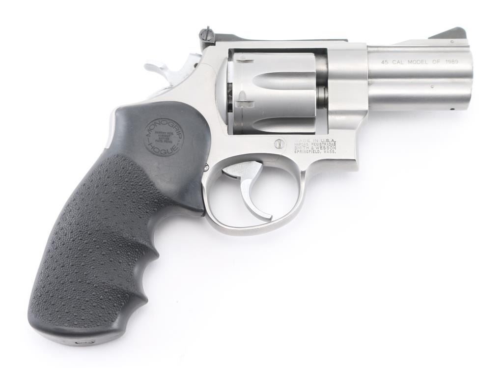 This S& W Model 625-3 is marked “.45 CAL MODEL OF 1989”. It is chambered for the .45 ACP Rimless cartridge commonly used in semi auto pistols. Built on the round butt N target frame with 3 screws, full lug 3" barrel, micro-click adjustable rear sight and serrated ramp blade front sight. .400 semi-target hammer, .312 smooth combat trigger, non-glare matte stainless finish. Hogue Monogrips. It is in excellent condition with the exception of the drag line and minor scratches Judging by the bolt face it appears to have been fired very little. Bore and charge holes are excellent, action is crisp/tight., grips are excellent. Comes with 2 6-rd speed loaders, and 4 half moon clips. NRA Condition-Excellent. Modern Firearm.