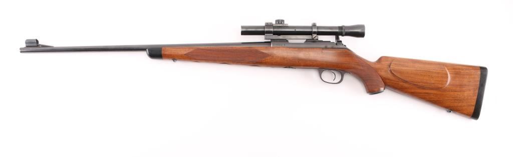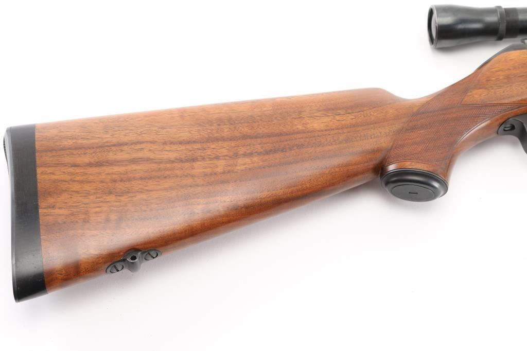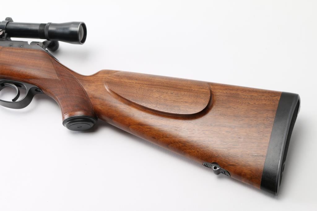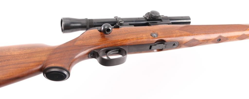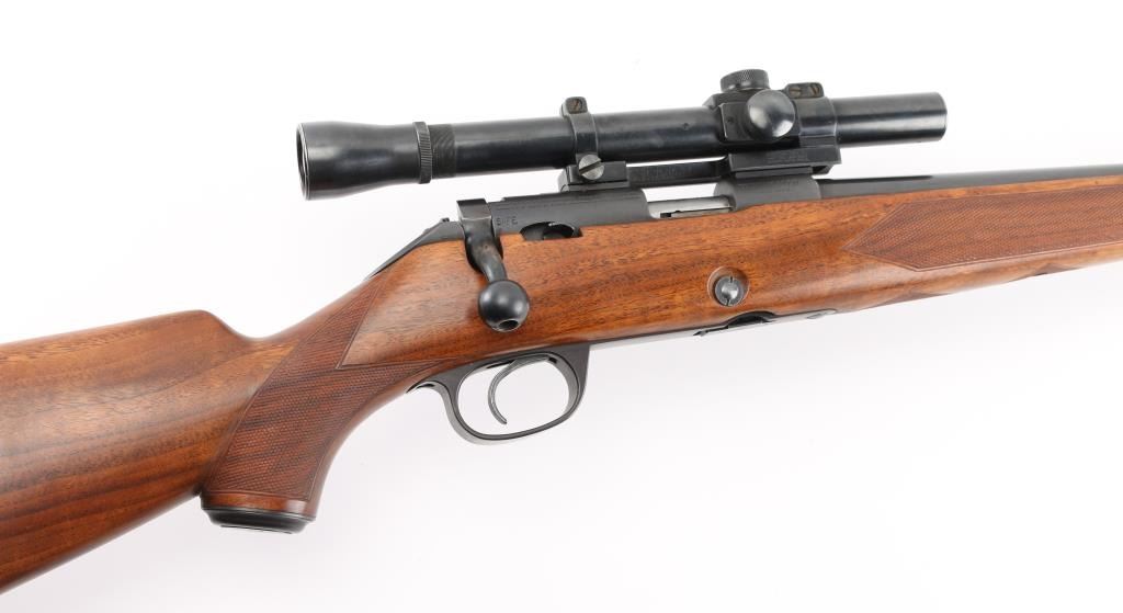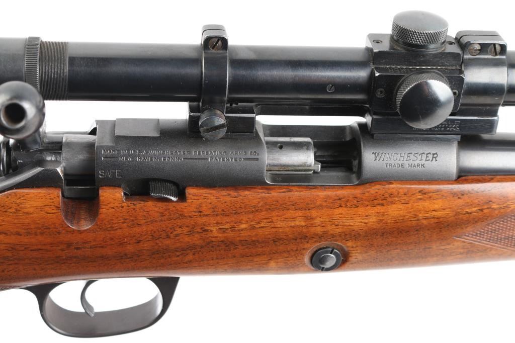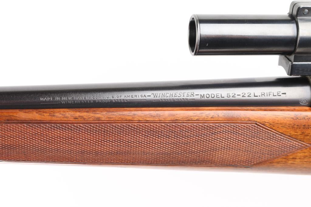 Vintage Model 52 manufactured in 1948. The left side of the barrel is marked " Made in Hew Haven Conn, U.S. of America". “Winchester / Proof Steel / Model 52 / Winchester / Trade Mark . .22 Long R.”. There is a Winchester Proof Mark on the left side of the barrel and the frame. The left side of the frame is marked “66319 B”. The right side of the receiver is marked “Made In U.S.A. Winchester Repeating Arms Co. / New Haven, Conn. – Patented -” and “Winchester / Trade Mark”. 24" tapered barrel with hooded post/bead front sight, provisions for a receiver mounted peep sight, left receiver drilled/tapped, manual safety, push-button mag release inletted in right stock, beautiful oil finished walnut stock with fine point checkering at the wrist & forearm, blued steel grip cap. factory checkered hard rubber butt plate with wide ebony spacer, ebony forearm tip, sling swivel studs cheek piece for right handed shooting. One piece Redfield scope base installed on receiver and fitted with a vintage Lyman 2 1/2 power scope, clear optics. Bore is excellent/bright, action is smooth, original blue is about 97% with slight muzzle wear, and handling loss on the bolt handle, stock is excellent with some very minor scratches. Considering this 52 is 75 years old, you would be hard pressed to find one in better condition. Comes with original "W" marked 5-rd Magazine. NRA Condition-Excellent. C&R Firearm.