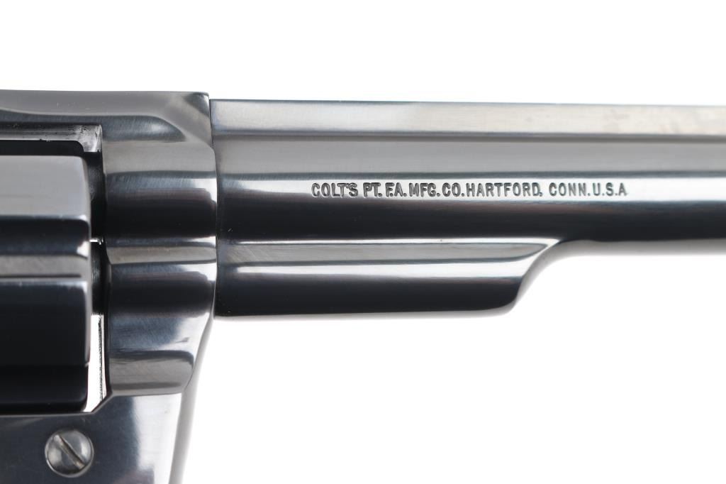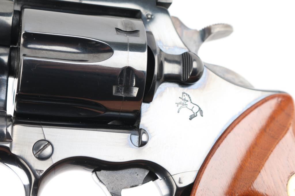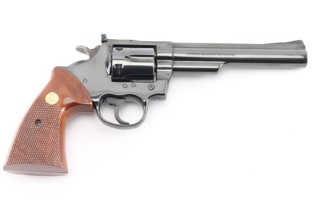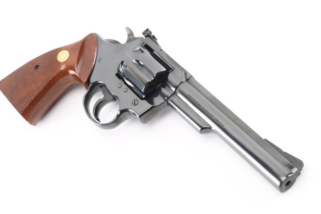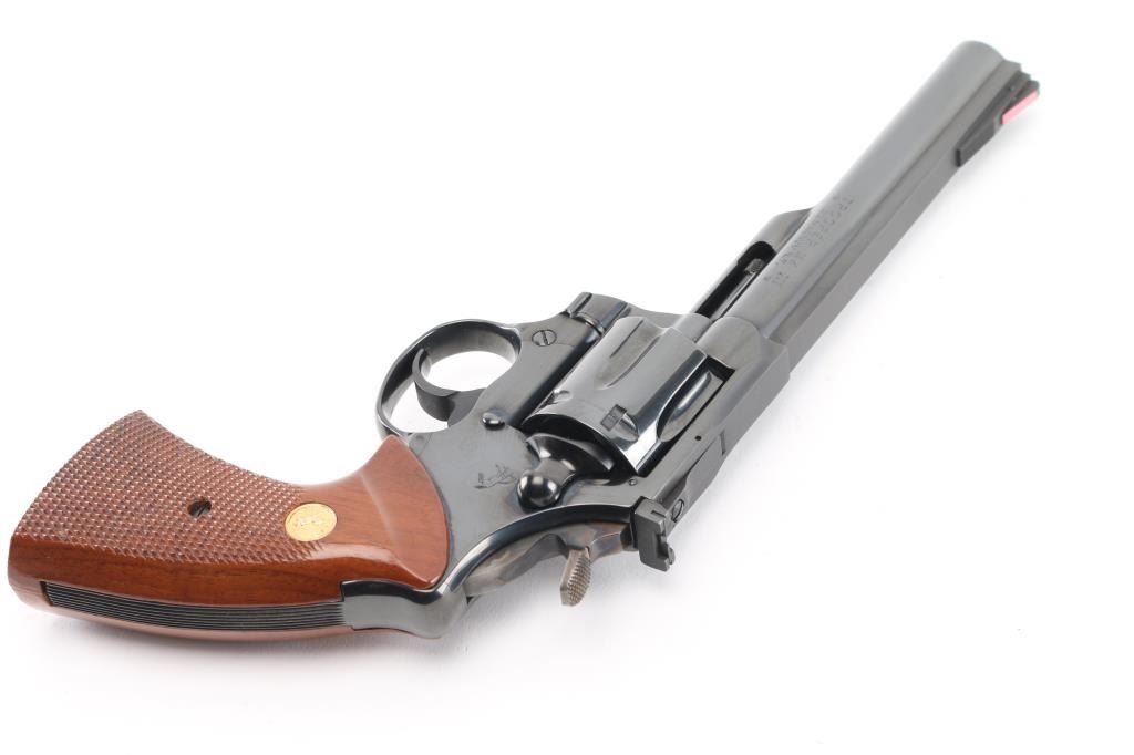 Double-action 6-shot revolver circa 1980, 6" ribbed heavy barrel with red accent serrated ramp front sight and adjustable square notched rear sight, wide smooth trigger, checkered wide spur case-colored hammer and checkered wood medallion grips with serrations on grip frame. Retains 99% of polished blue finish with cylinder drag line. Bore and chambers are excellent/pristine. Action is smooth with slight play in the lock-up. Grips are excellent. Condition is NRA Excellent. Modern Firearm.