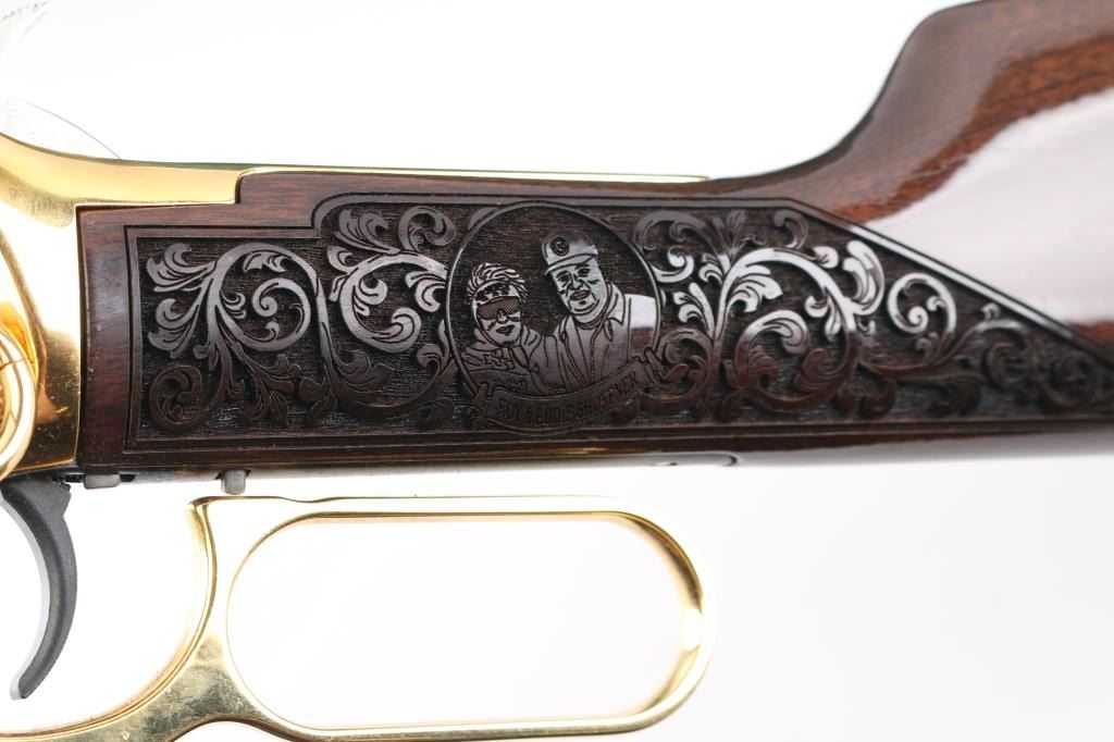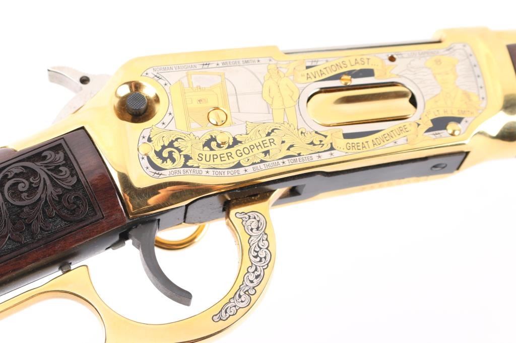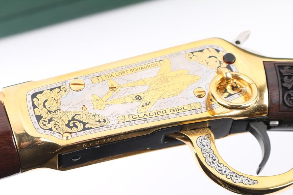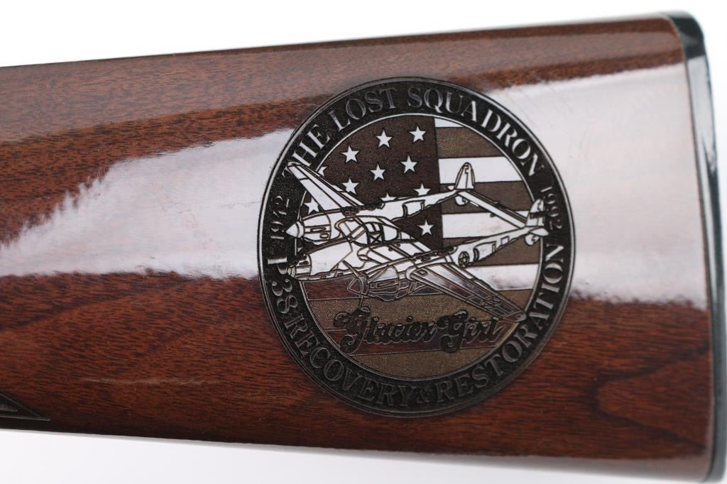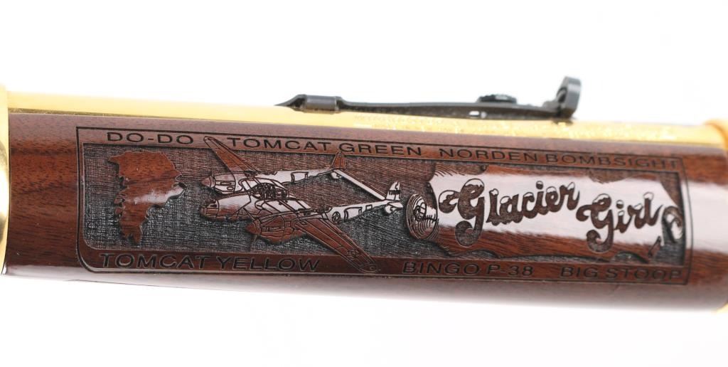 Sn: INV00952 This is a Winchester Model 94AE SRC that has been customized by Investment Arms Inc. 24 karat gold plated. Engraved by S.B.R. engraving,2004 (Marked on underside of receiver) The theme of this rifle is the "Lost Squadron". A fascinating story of 94th Fighter Squadron consisting of six P-38's and two B-17 Bombers that were forced to land on ice in Greenland in 1942. one of the P-38's "Glacier Girl" , after a massive recovery operation in 1992, was restored to flying condition. Just beautiful engravings of Pilots, P-38, B-17, Men involved in the recovery,on the metal, and wood stocks. Too much to list here. Front blade and semi-buckhorn rear sights. Plated saddle ring. Black plastic Winchester buttplate. Rifle is in almost new condition, Bore appears very good, strong rifling, but a little dirty. Comes in a nice green felt/leather case from Investment Arms. Investment Arms makes limited Edition 94AE's, but this could be one of a kind as I could not find any reference to it . NRA Condition-Excellent. Modern Firearm.