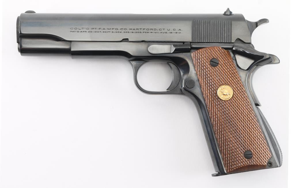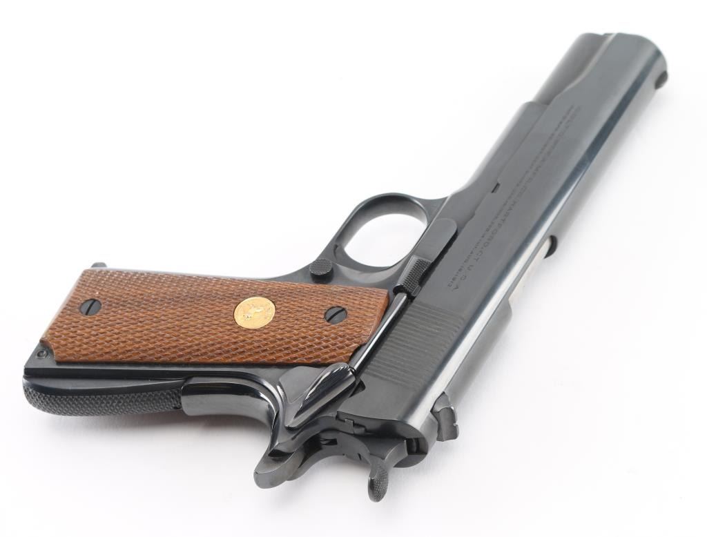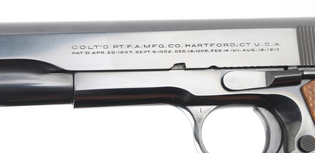 1911A1 pattern single action semi-automatic pistol manufactured circa 1929. Gun has been reblued. It features a 5" barrel, a tiny fixed blade front sight, a dovetailed notch rear sight, serrated trigger, knurled hammer spur, and checkered wood grips with gold Colt medallions. Reblued looks great. Bore looks okay but needs cleaned. Slide is a little sticky, again needs cleaned. Wood grips are fine. Condition is NRA Very Good as reblued. *C&R Firearm*