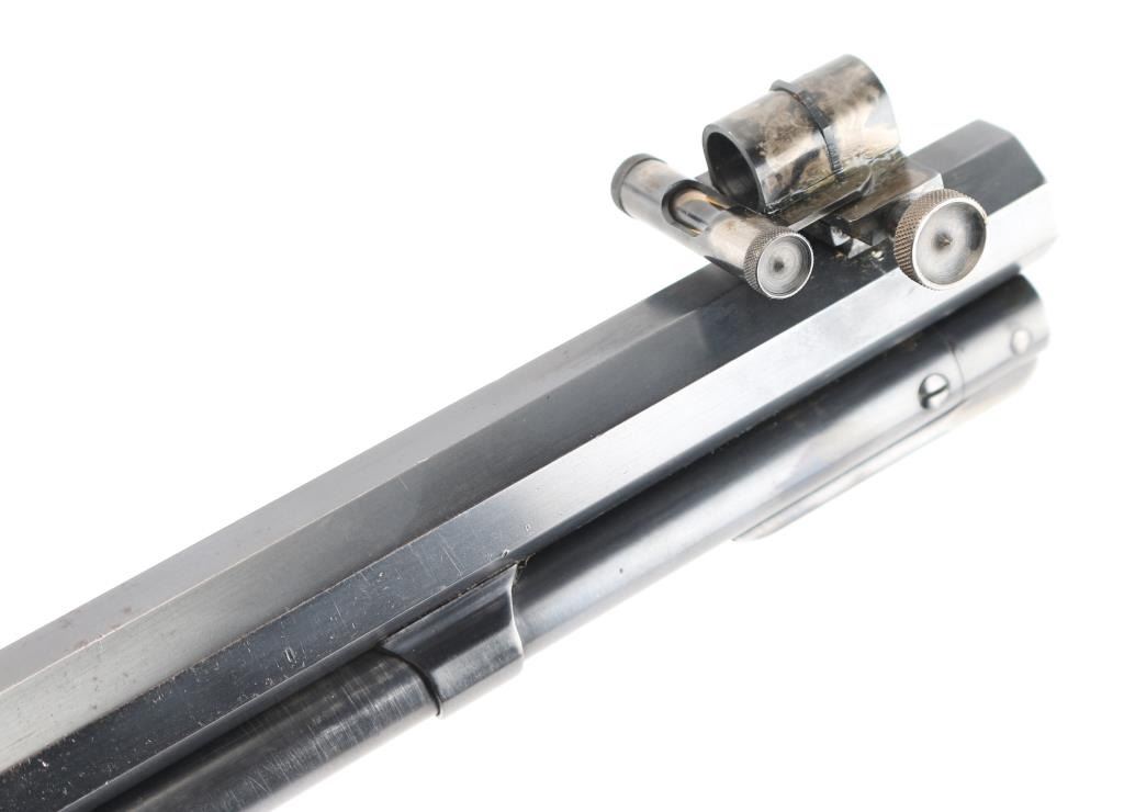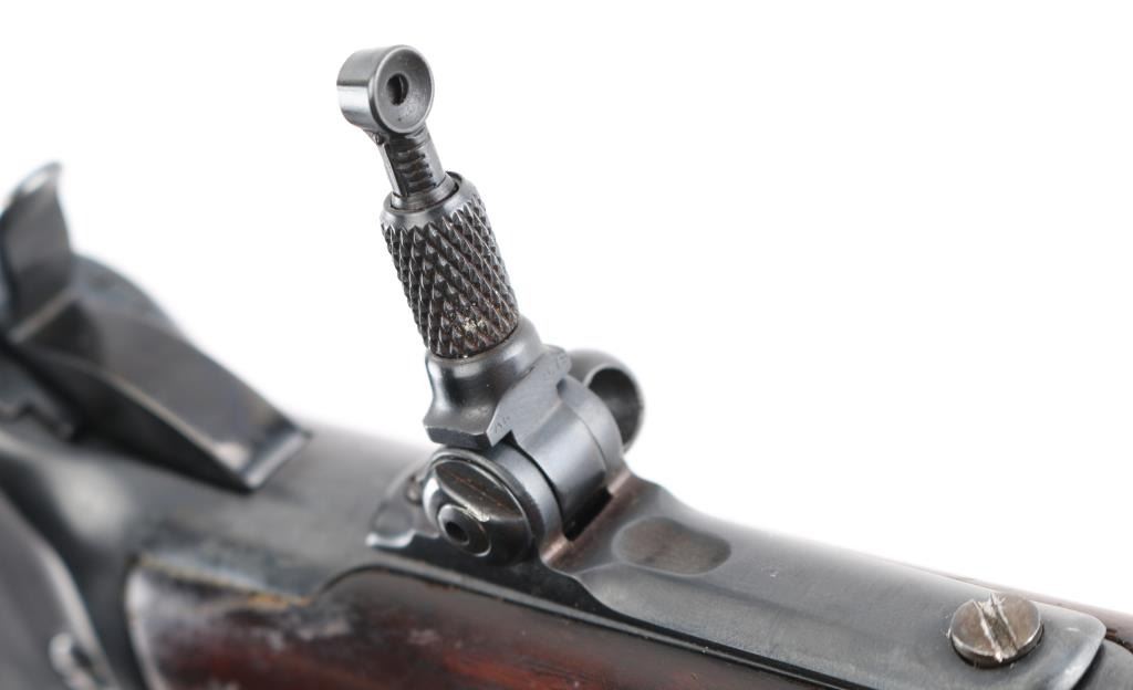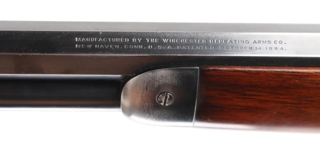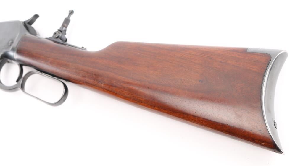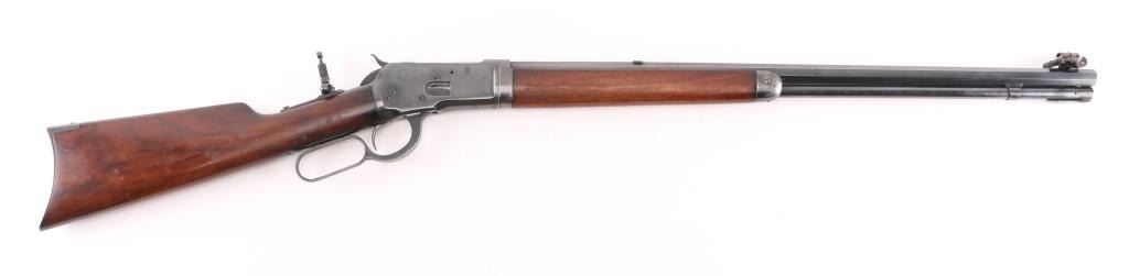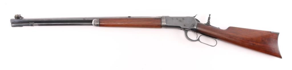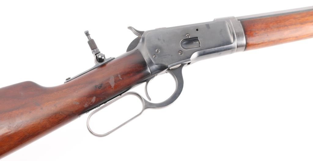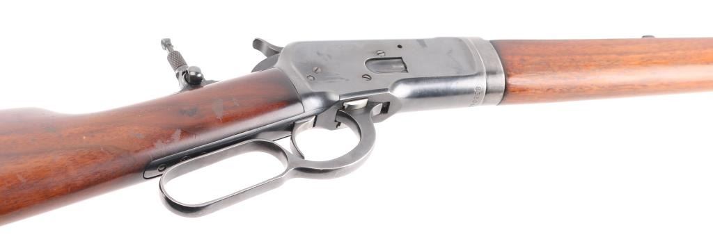 Lever action rifle chambered for .32 Winchester Center Fire ammunition circa 1917. It has a 24" octagon barrel, full length magazine tube, hood post bubble level front sight, rear sights removed with metal insert in the dovetail, tang mounted peep sight installed, smooth trigger and knurled hammer spur. Two piece smooth wood stocks have a metal forend cap and a crescent steel butt plate. Sling swivels attached. Sling swivels removed with wood plug in the buttstock. Rifle has an old reblued finish that is about 80% with handling wear on the lower barrel/scratches. Wood stocks are very good with a small repaired chip by the upper left tang, some finish loss on the right wrist. Bore is very good, bright with strong rifling. NRA Condition-Very Good as Refinished, C&R Firearm