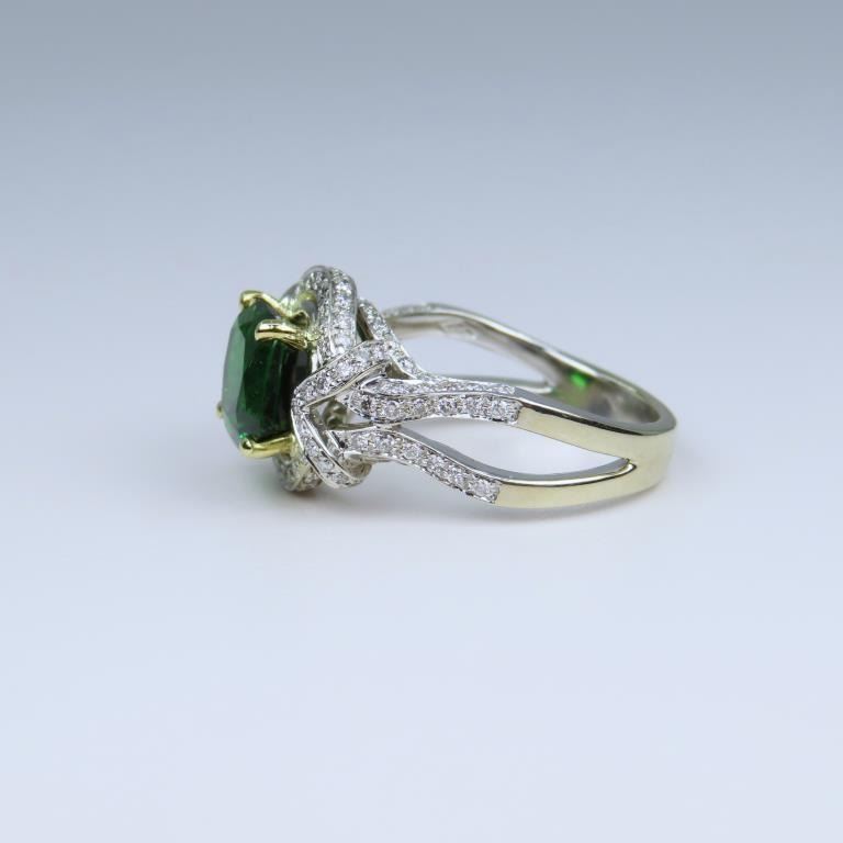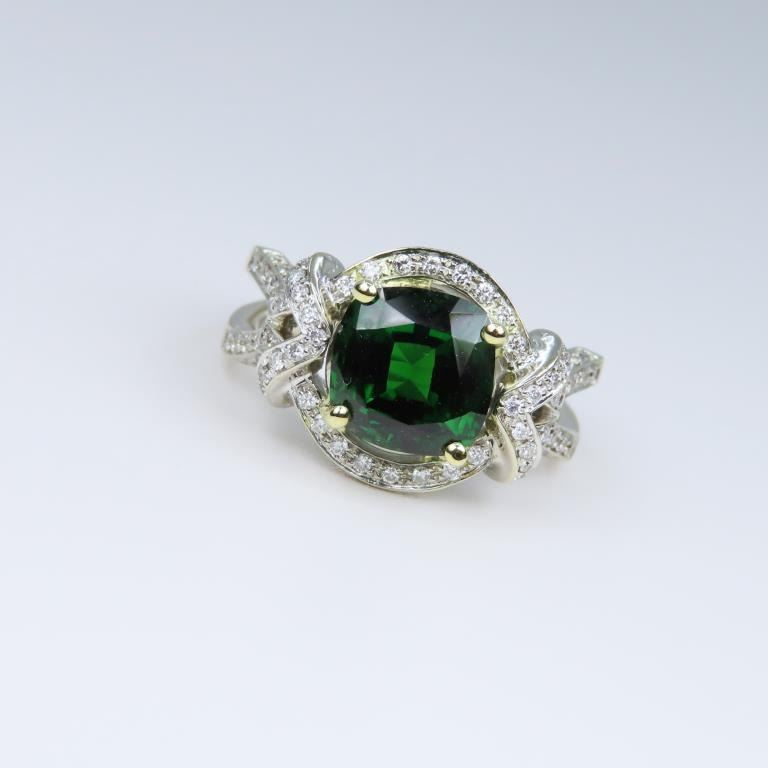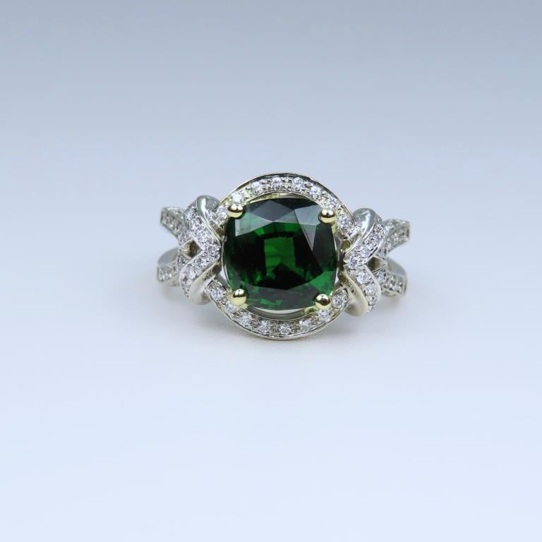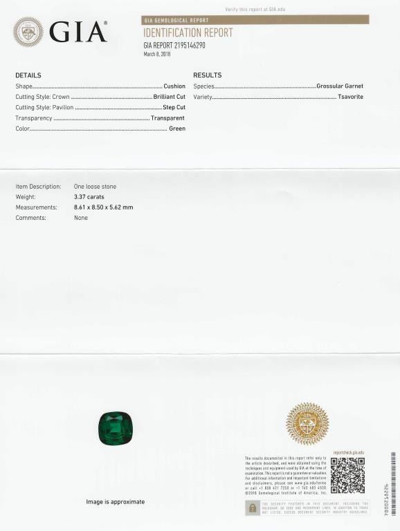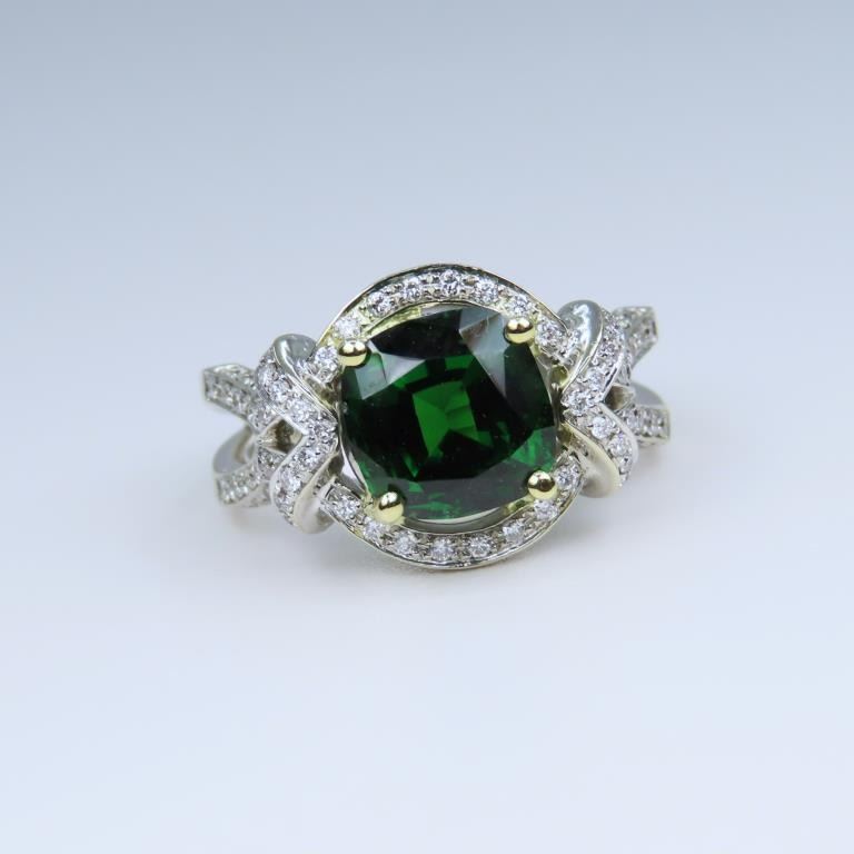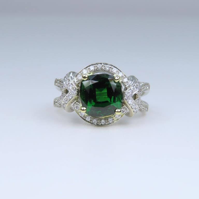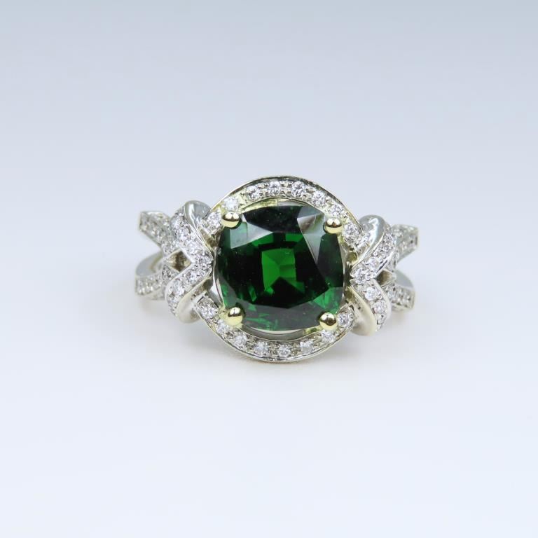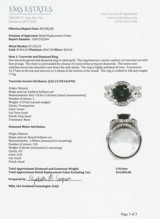 Green Tsavorite Garnet and Diamond Ring with Extra Fine vivid Green color and size this cushion cut Tsavorite is Rare as most Fine Quality Green Tsavorites are 2.00 carats or less, at 3.37 carats this gem is exceptionally large and beautiful. This elegantly detailed 18 karat white gold setting is accented with over 118 round ‘IDEAL cut’ Diamonds weighing approx. 0.56 carats with G-H colors and VS/SI clarity. Custom crafted setting is Hallmarked B.S.H. Size 6 3/4. Full Retail Appraisal - $34,000.00