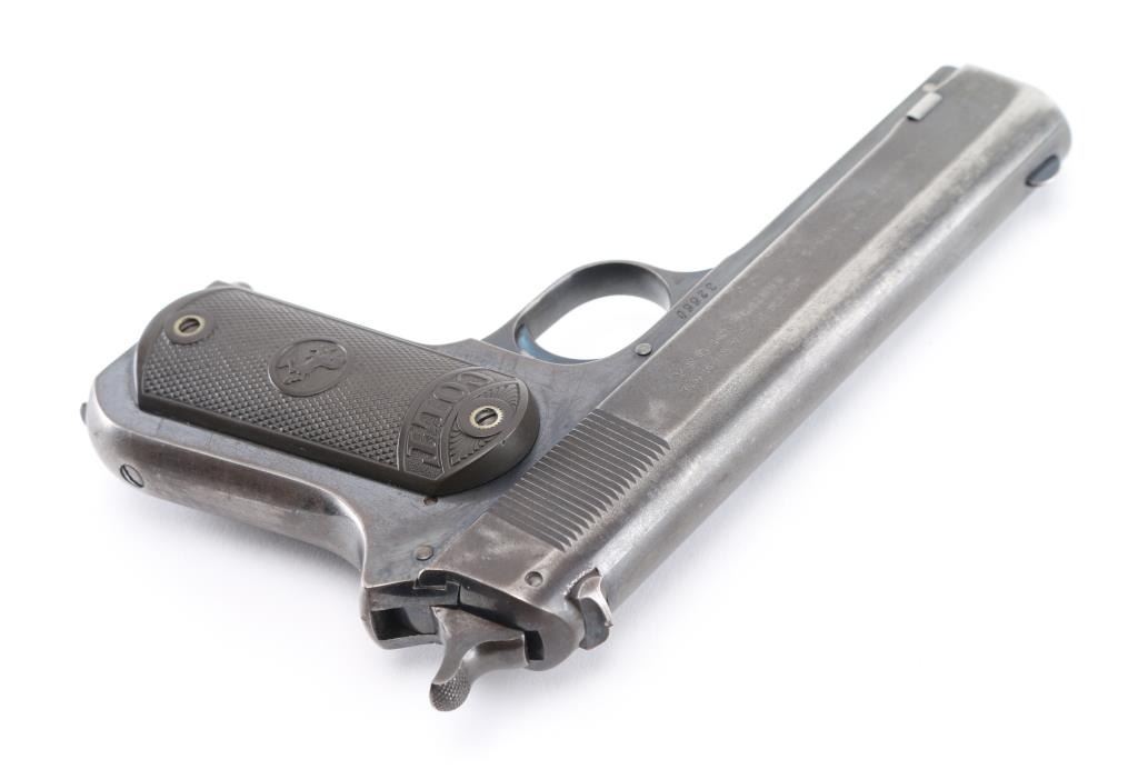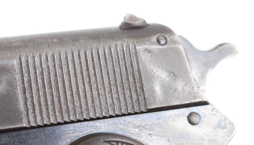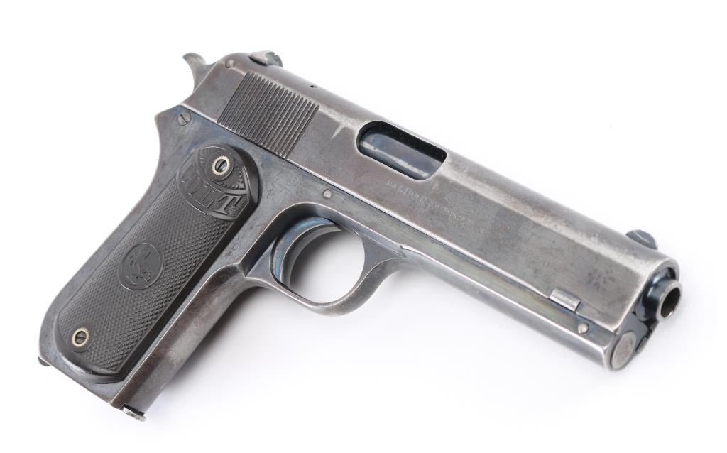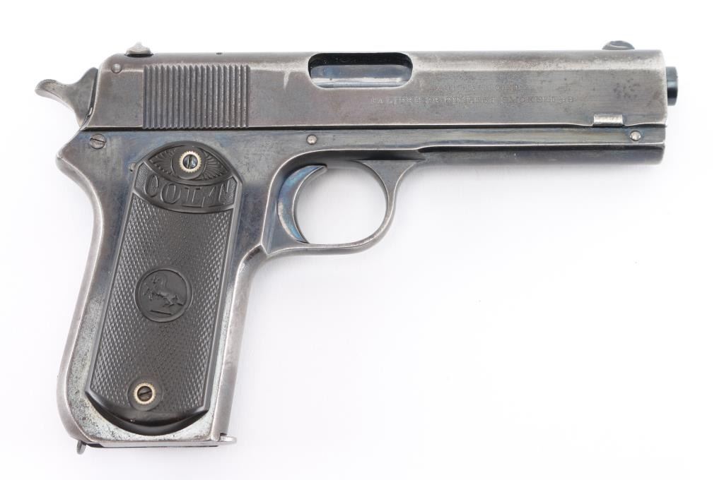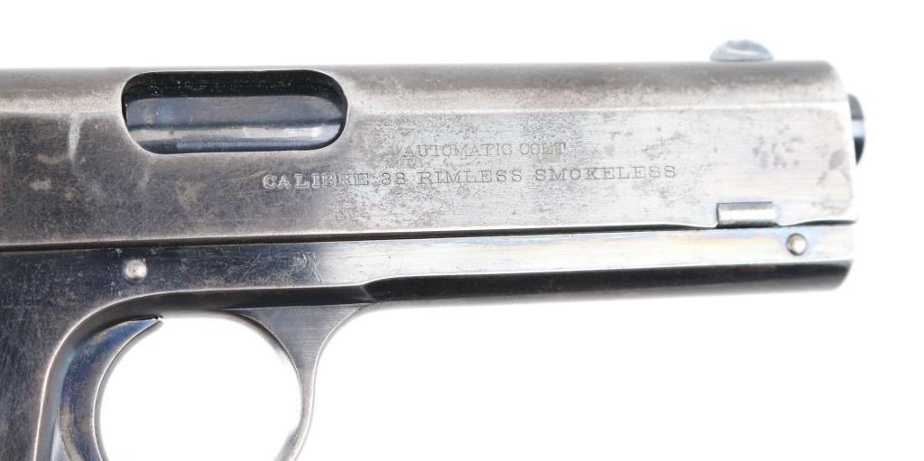 American made semi-automatic pistol, manufactured circa 1914, designed by John Browning, blued finish, no manual safety, no grip safety, approximately 4 3/8" barrel, serrations on the rear of the slide that appear to be plunge milled, bore is bright, blade front sight, open notch rear sight, checked low-profile hammer, smooth trigger, black hard rubber grips with "Colt" and their logo, metal 7-round single stack magazine, approximately 70% of finish remains. It is a compact version of the Colt Model 1902 Sporting Model pistol derived from the original Colt M1900. The .38 ACP (aka .38 Auto) and the .38 Super use cases with identical dimensions, the only difference being the maximum operating pressures of each. It would be unwise to use new, factory .38 Super ammunition in any pistol based on the M1900 series Colts. (1900, 1902, 1903.) **NRA Very Good** Modern Firearm C&R Eligible