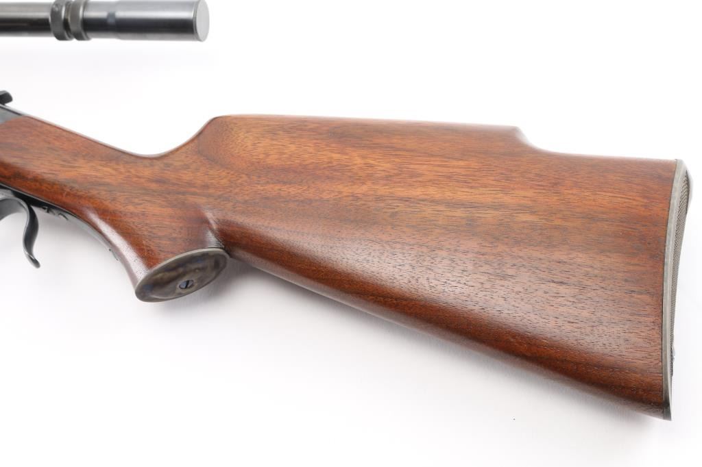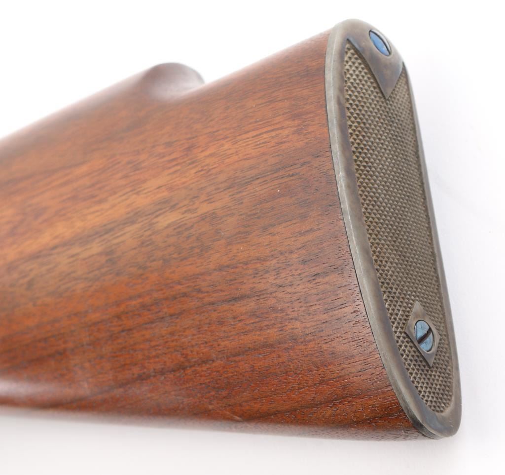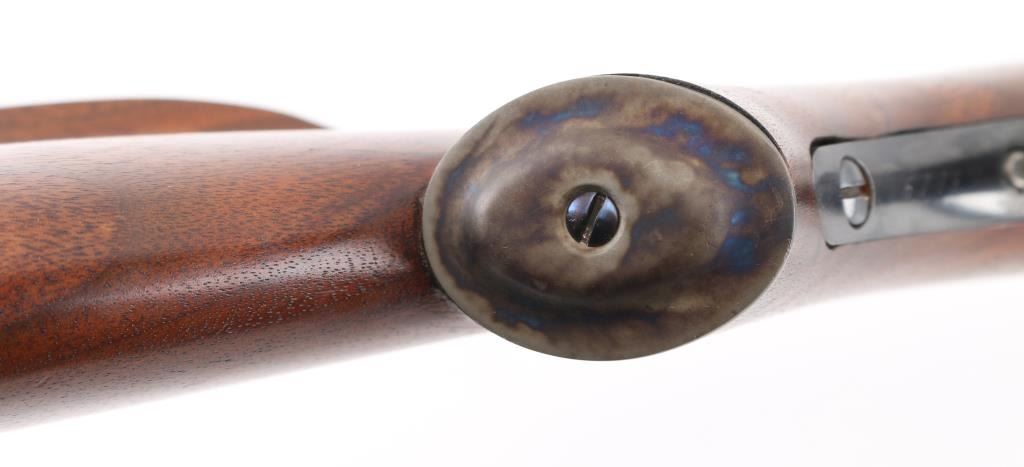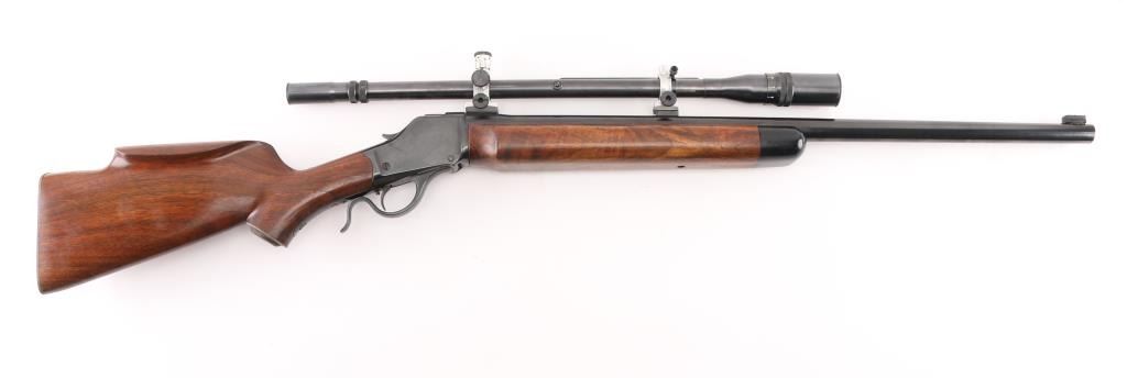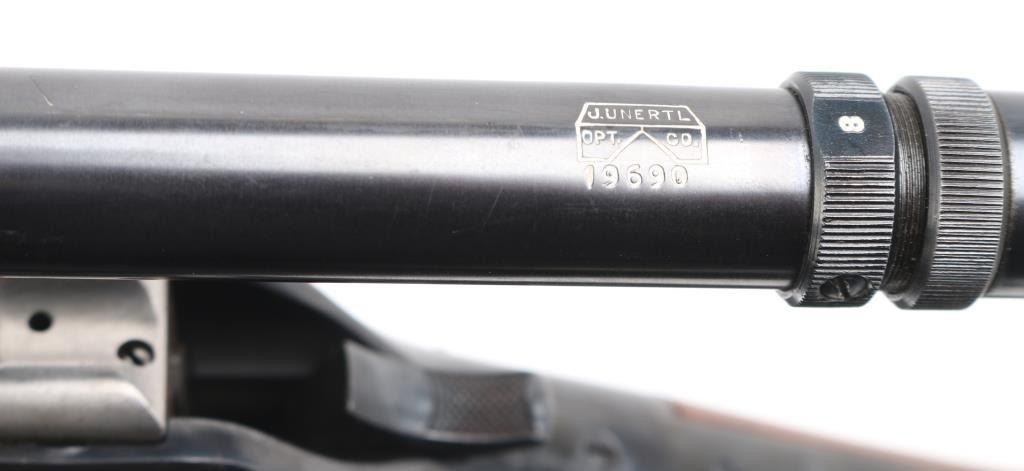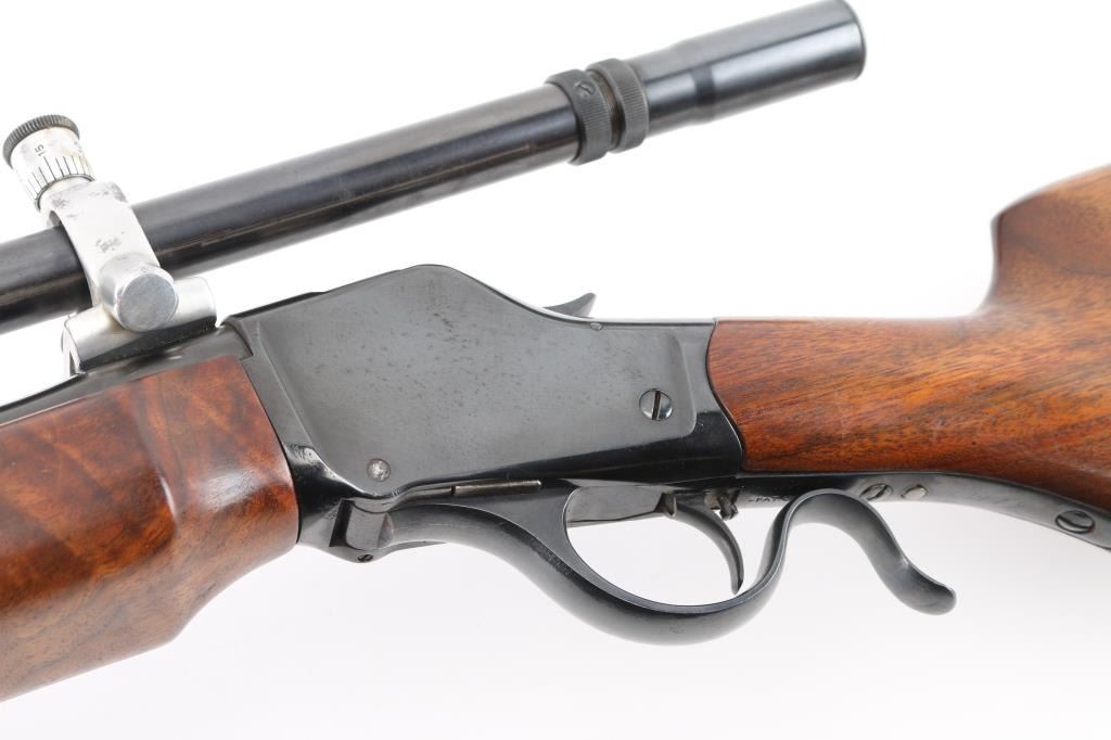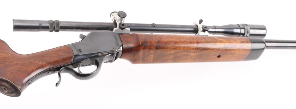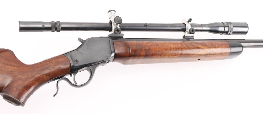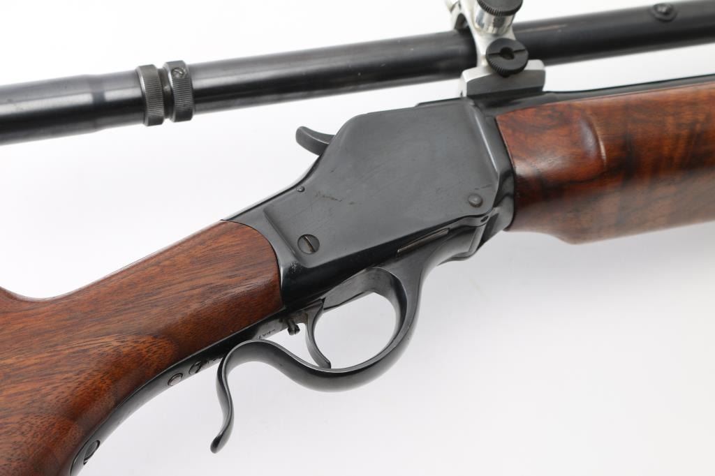 This is a custom target rifle built on a Winchester M1885 low wall receiver. Manufactured 1886. Re-barreled with a 26" heavy round barrel chambered in .219 Zipper. High polish re-blued finish, highly figured smooth American walnut stock with high comb, shadow line cheek piece, 'beaver tail forearm, contrasting black wood forearm tip,case hardened steel grip cap. A checkered steel 'Neidner' style buttplate .Mounted with a Unertl 8X target scope with Unertl adjustable target rings, recoil spring, fine cross hair reticle, clear optics, serial number 19690 Falling block action is smooth, locks up tight, blue & wood stocks are excellent, bore is excellent/bright. Comes with approx. 50 rounds of reloads and a partial box of vintage ammo. NRA Condition-Excellent. Antique Firearm.