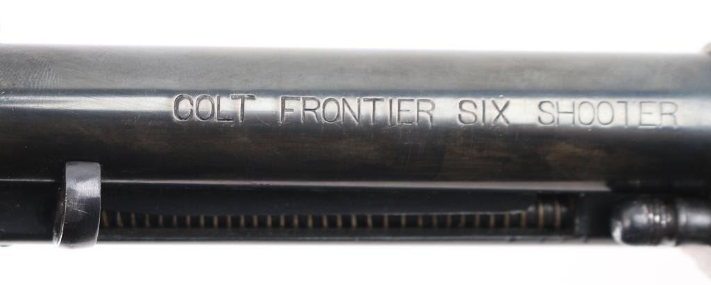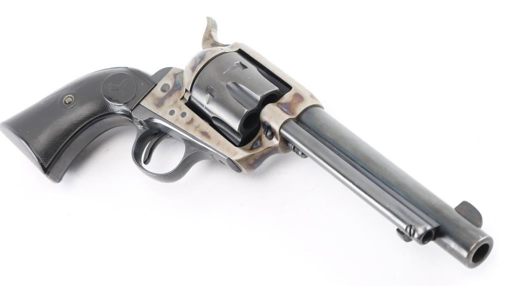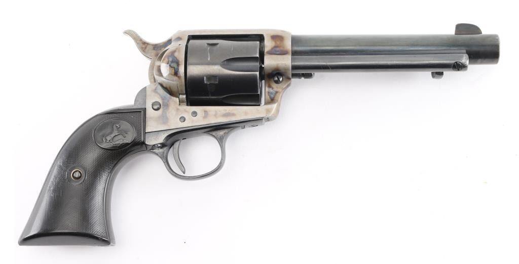 Professionally restored 1st Generation Colt SAA. 5 1/2" barrel. Manufactured 1902. Blue refinish, case hardened frame, checkered black hard rubber grips with 'Rampant' Colts. Matching serial numbers on frame, triggerguard, & back Strap. Assembly number "689" on loading gate. One line Colt address on top of barrel, "Colt Frontier Six Shooter" on left side. Bore is excellent/bright, action is crisp/tight,. Blue is very good with minor edge/muzzle wear, tracking lines on the cylinder. Grips are good, handling wear to the Rampant colts & checkering. Case hardened frame is good with some pitting under the refinish making the patent dates & rampant colt a little feint, mainly on the left side of frame & right side of trigger. NRA Condition-Very Good as restored. C&R Firearm.