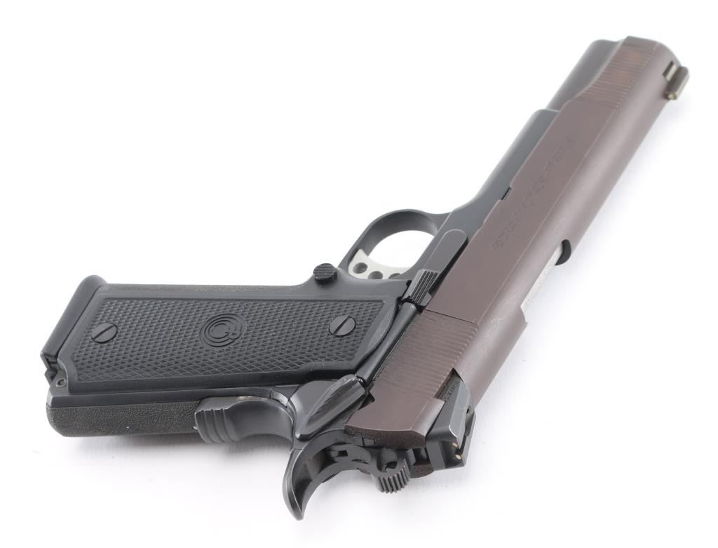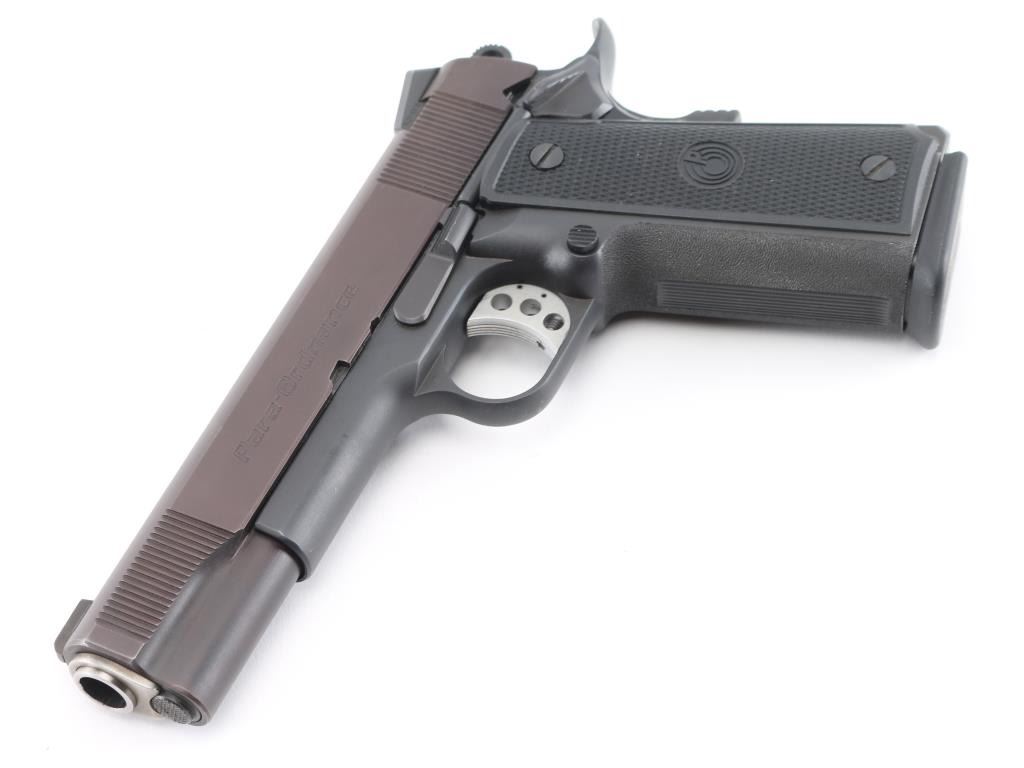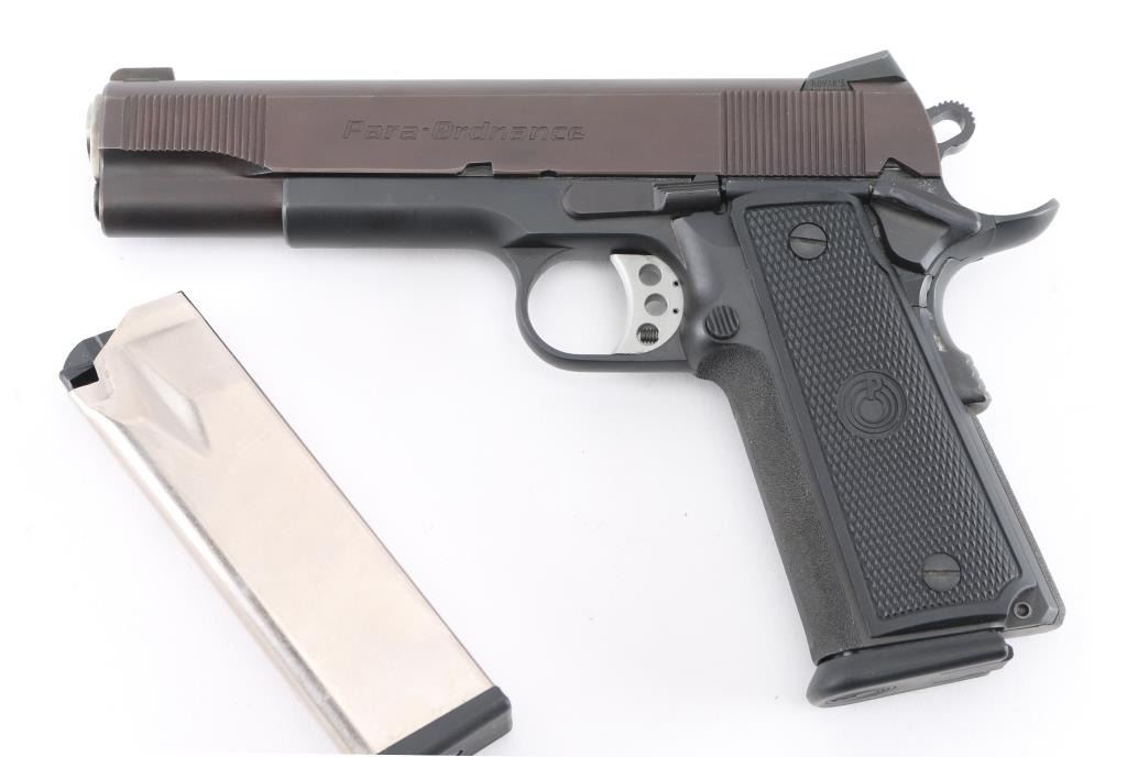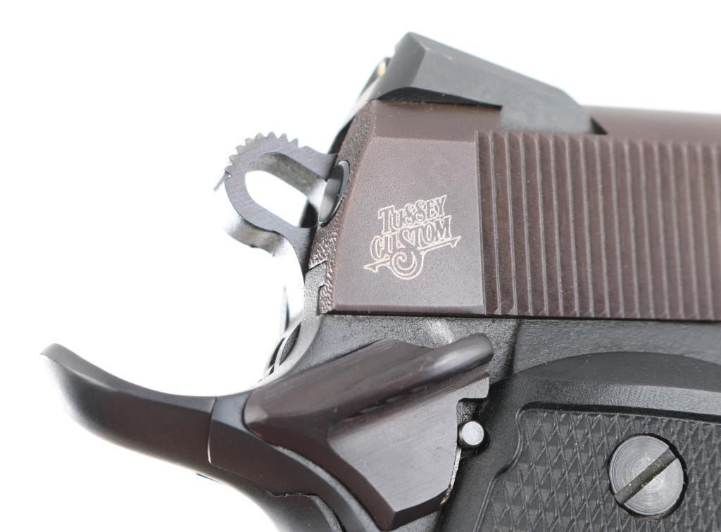 Canadian-made single action 1911 pistol, engraved "Tussey Custom" on the right side of the slide, approximately 5" barrel, barrel is marked "BAR STO 45 ACP" at ejection port, bore is bright, slide has been refinished, serrated hammer spur and trigger, textured grip, black polymer grip panels with Para-Ordnance logo. Includes two Para-Ordnance double-stack magazines. **NRA Perfect** Modern Firearm