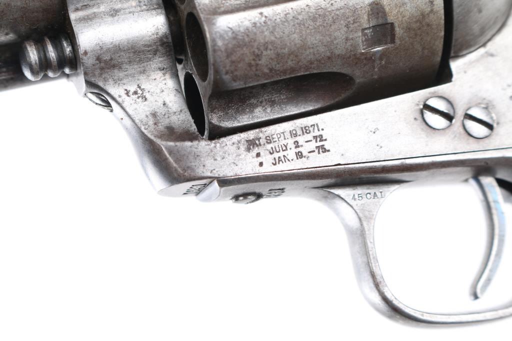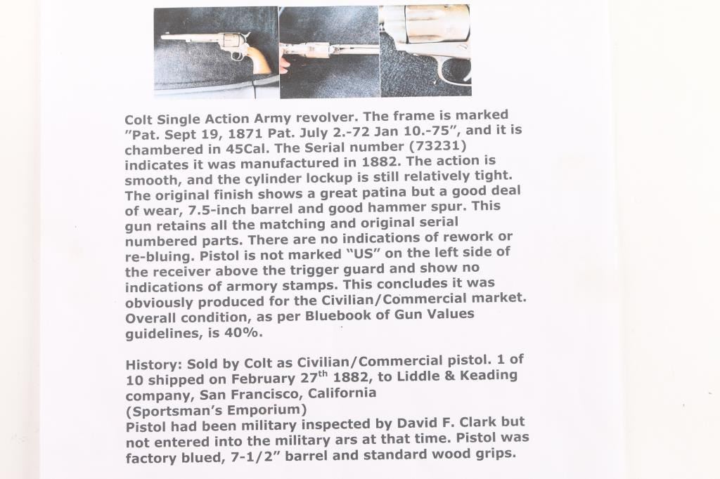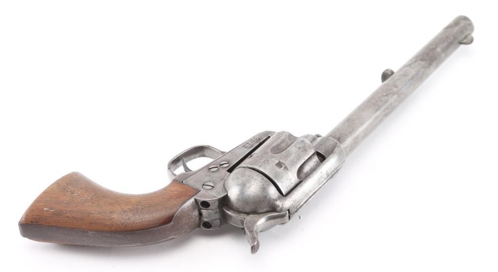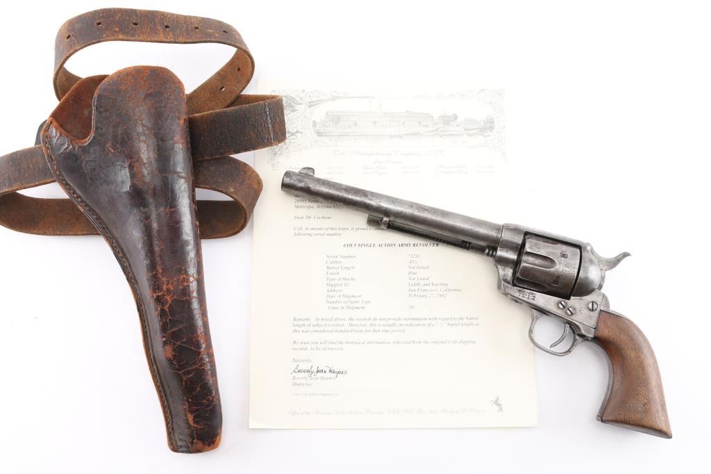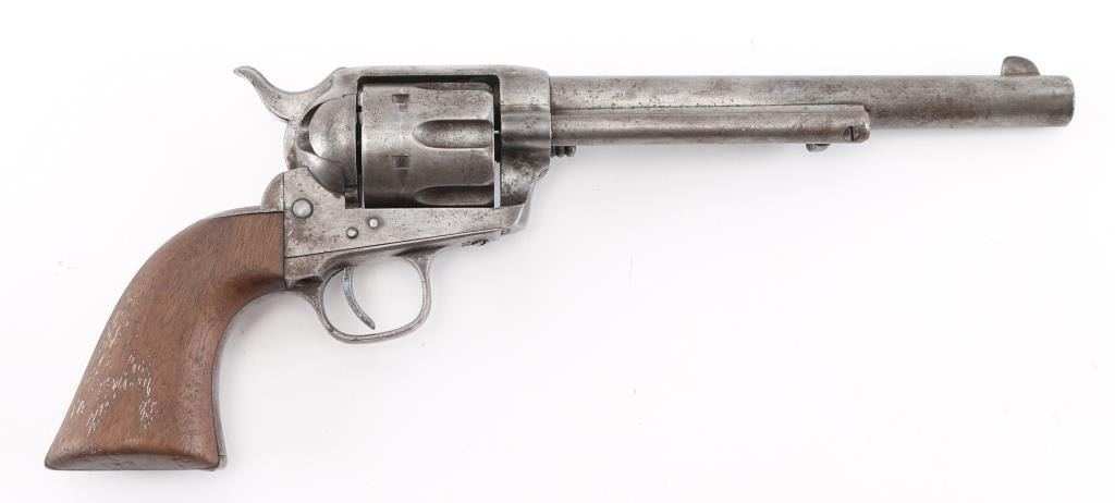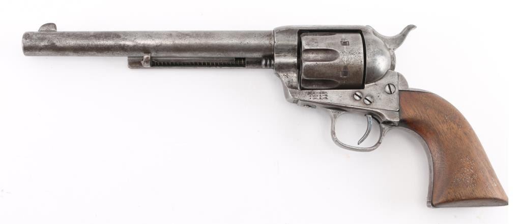 1st Generation' Single action revolver manufactured circa 1882. Features 7-1/2" barrel, fixed sights, single piece walnut grip, center pin held by screw, contoured ejector rod head. Bore is good condition, several pitted areas, some strong rifling present. Charge holes are very good. Metal surfaces are a slightly mottled brown with some gray color, some small traces of blue in protected areas, some bare metal on edges. Wood grip is good condition, with some small traces of what appears to be white paint, should clean off. Serial number matched on frame, triggerguard, back strap, and cylinder. Assembly number "7699" on the loading gate. One line Colt address on top of the barrel, 3 line patent dates on the left frame, and left triggerguard marked "45 CAL". Matching cylinder stamped "D.F.C.", which shows this pistol was inspected for Military use at one time, no U.S. stamp, sold commercially by Colt. Action is smooth, all markings clear/readable. Comes with a great holster rig, a California style "Slim Jim" brown leather holster with period belt. Some separation on the upper right of the holster, both belt and holster are intact, have seen hard use. Includes Colt factory letter that confirms the configuration of this revolver. It was one of ten revolvers shipped to Liddle & Keading Company, San Francisco, California on February 27th, 1882. Also included with the letter is a history of this Company. (Wells Fargo shotguns were obtained from Liddle & Kaeding) Condition is NRA Very Good. Antique Firearm.