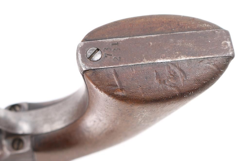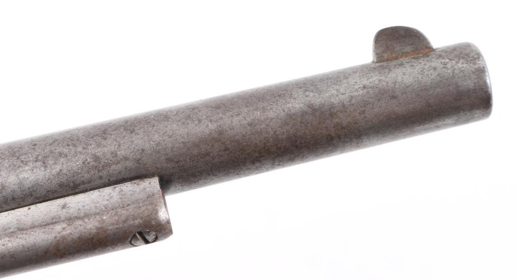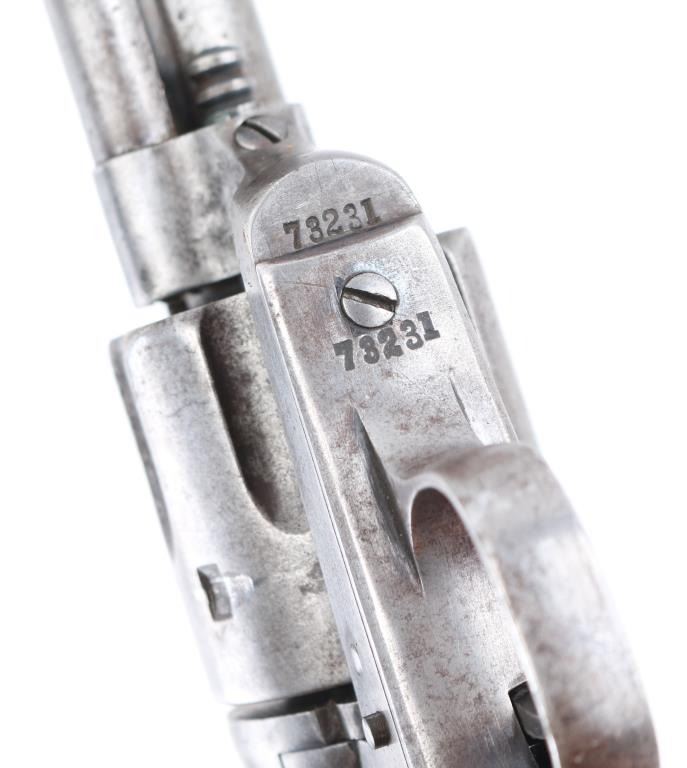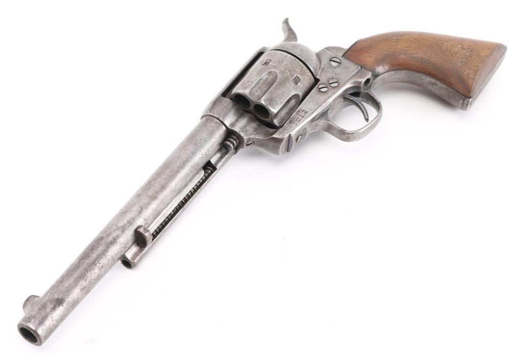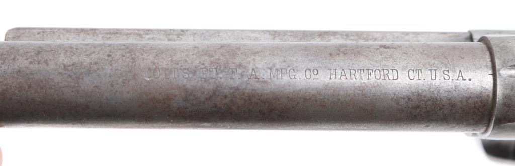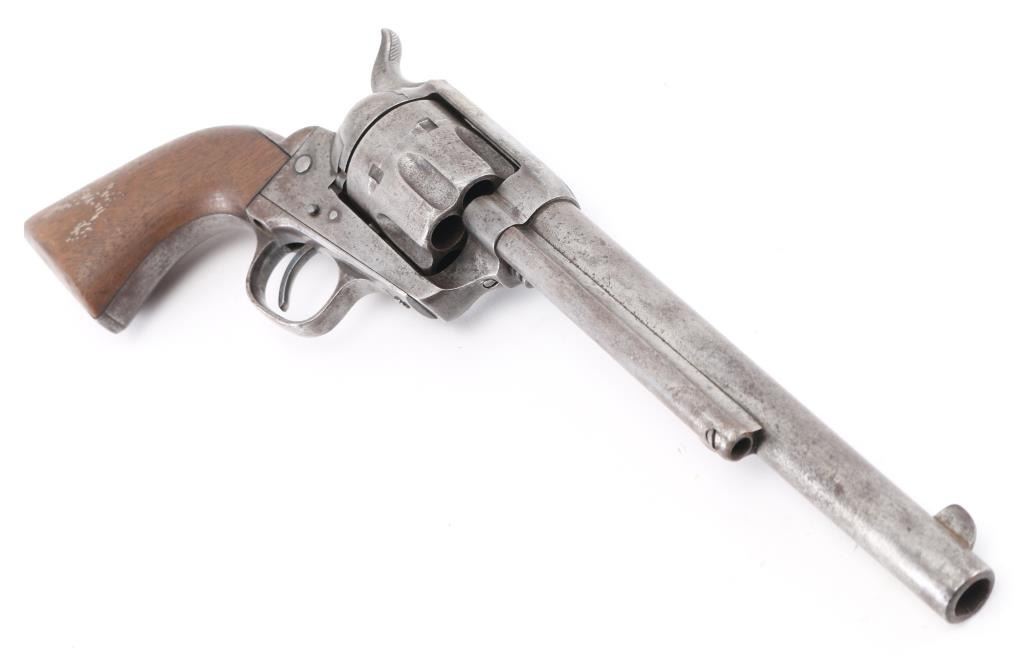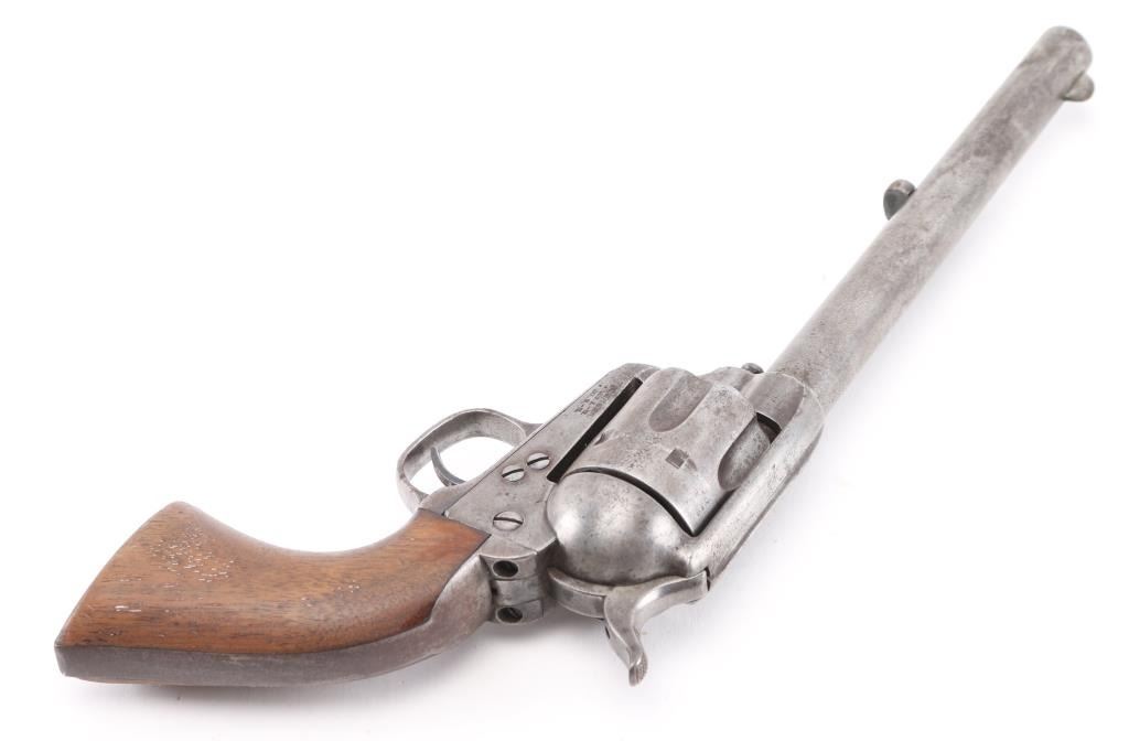 1st Generation' Single action revolver manufactured circa 1882. Features 7-1/2" barrel, fixed sights, single piece walnut grip, center pin held by screw, contoured ejector rod head. Bore is good condition, several pitted areas, some strong rifling present. Charge holes are very good. Metal surfaces are a slightly mottled brown with some gray color, some small traces of blue in protected areas, some bare metal on edges. Wood grip is good condition, with some small traces of what appears to be white paint, should clean off. Serial number matched on frame, triggerguard, back strap, and cylinder. Assembly number "7699" on the loading gate. One line Colt address on top of the barrel, 3 line patent dates on the left frame, and left triggerguard marked "45 CAL". Matching cylinder stamped "D.F.C.", which shows this pistol was inspected for Military use at one time, no U.S. stamp, sold commercially by Colt. Action is smooth, all markings clear/readable. Comes with a great holster rig, a California style "Slim Jim" brown leather holster with period belt. Some separation on the upper right of the holster, both belt and holster are intact, have seen hard use. Includes Colt factory letter that confirms the configuration of this revolver. It was one of ten revolvers shipped to Liddle & Keading Company, San Francisco, California on February 27th, 1882. Also included with the letter is a history of this Company. (Wells Fargo shotguns were obtained from Liddle & Kaeding) Condition is NRA Very Good. Antique Firearm.
