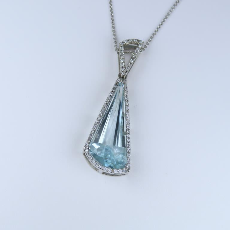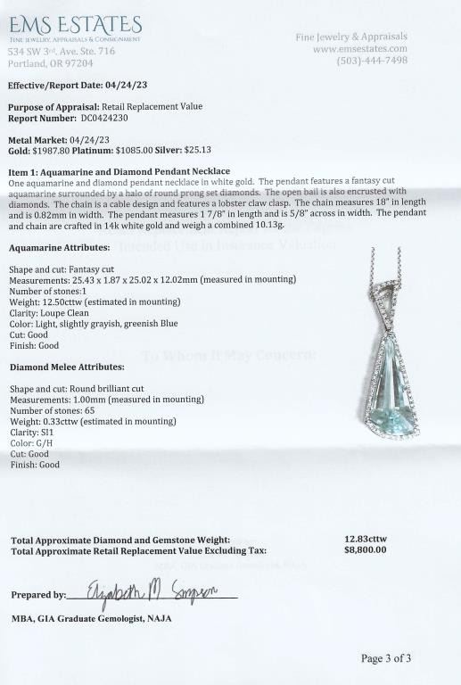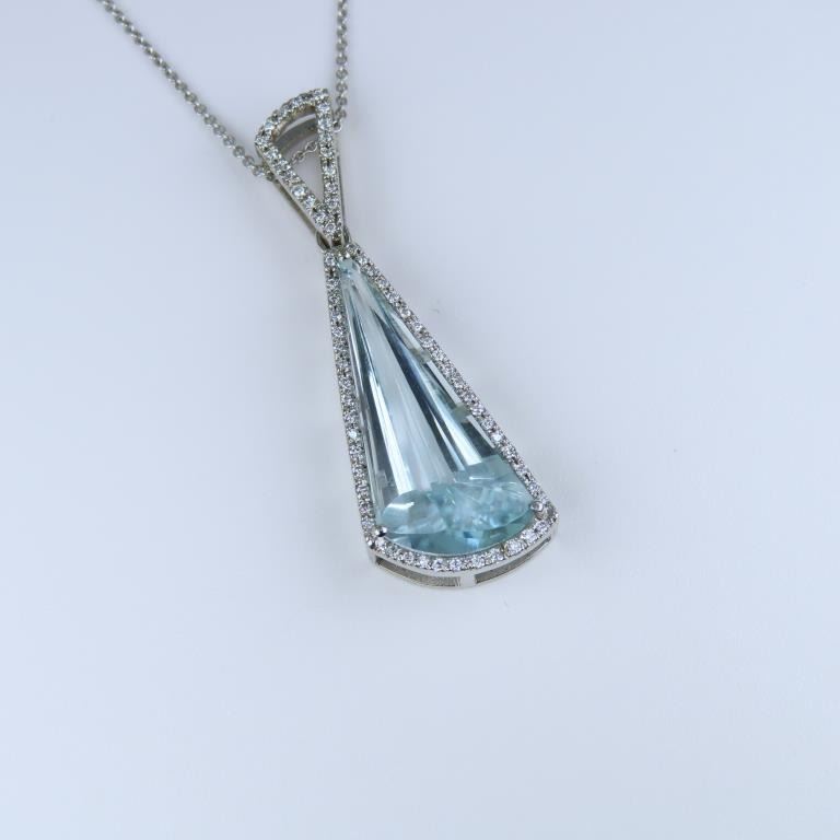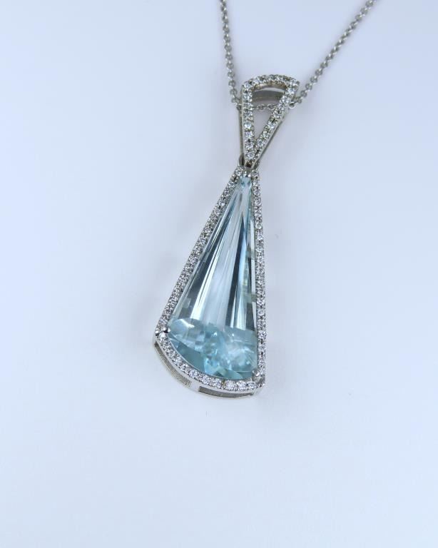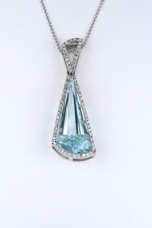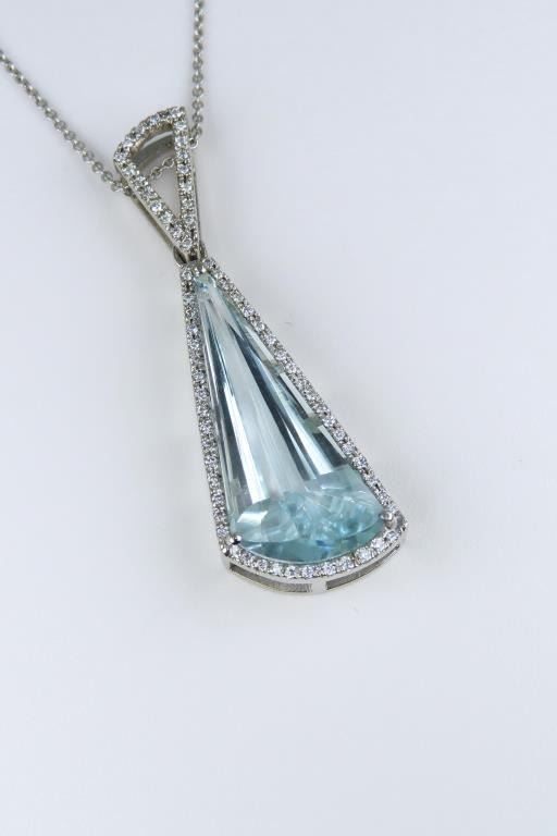 and Diamond Pendant featuring an Aquamarine weighing approx. 12.50 carats with Greenish Blue color accented with 65 round Diamonds weighing approx. 0.33 carats with G-H colors set in a custom crafted 14 karat white gold designer setting. Full Retail Appraisal - $8,800.00