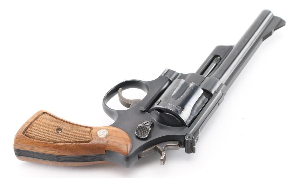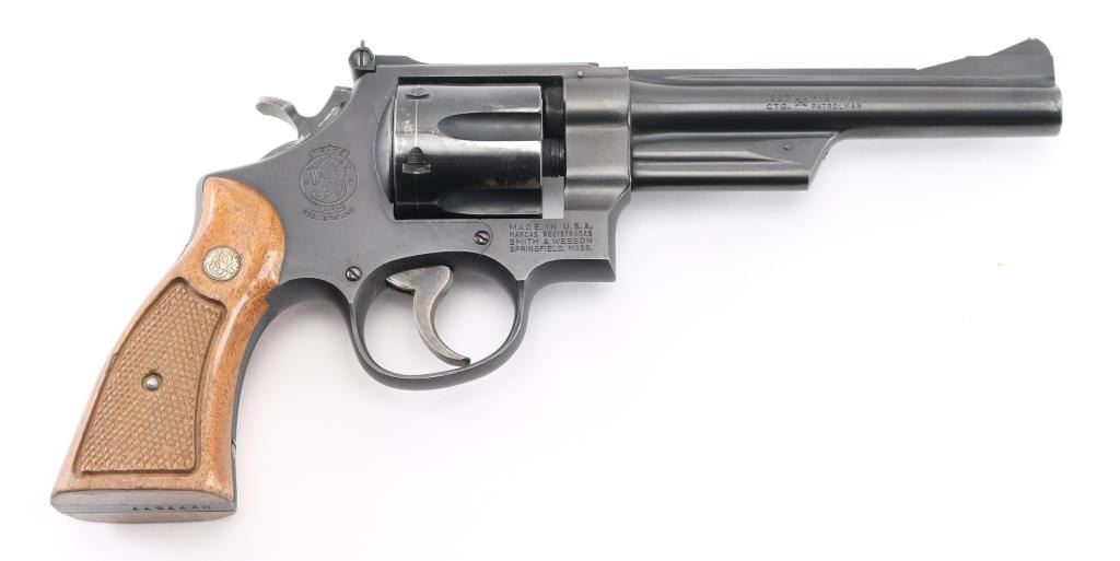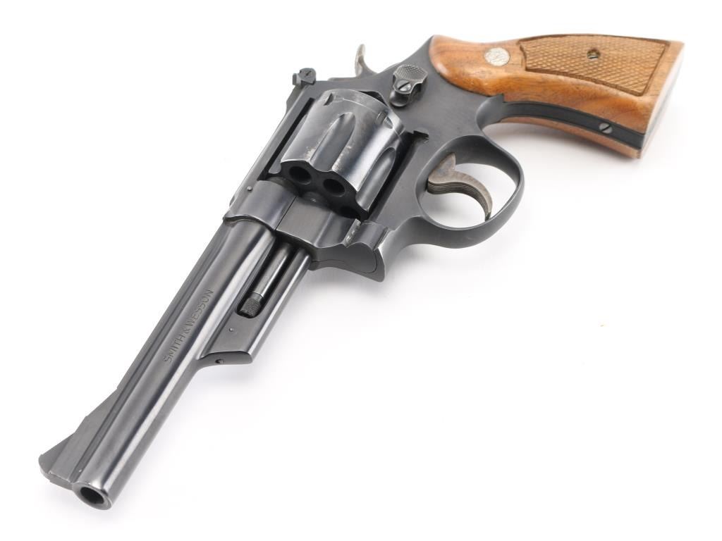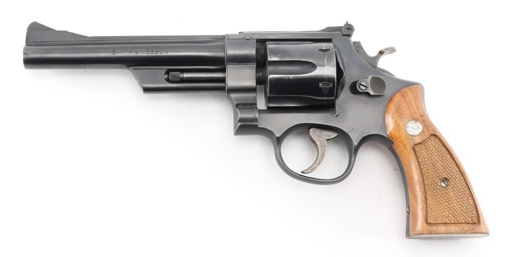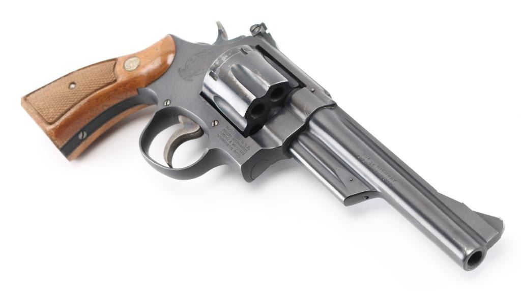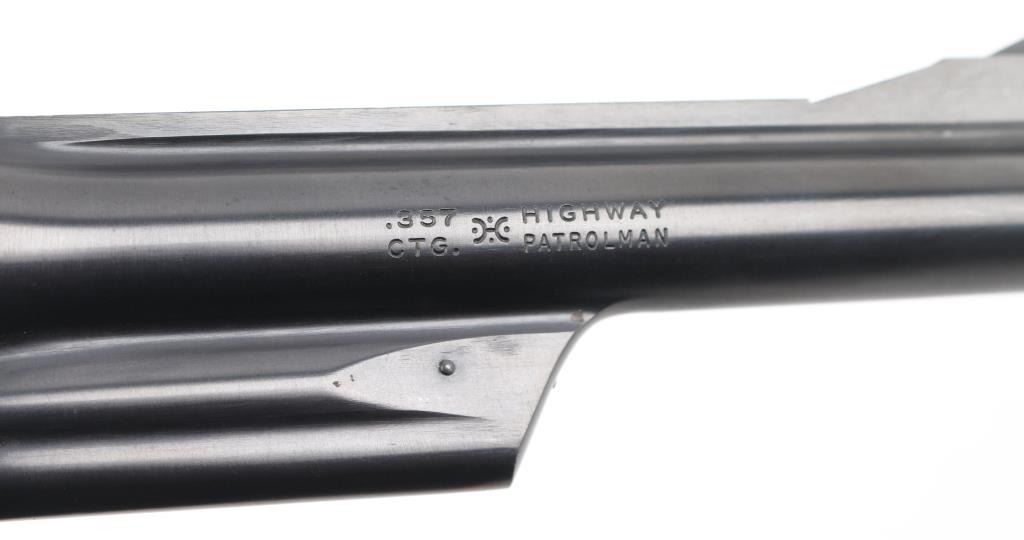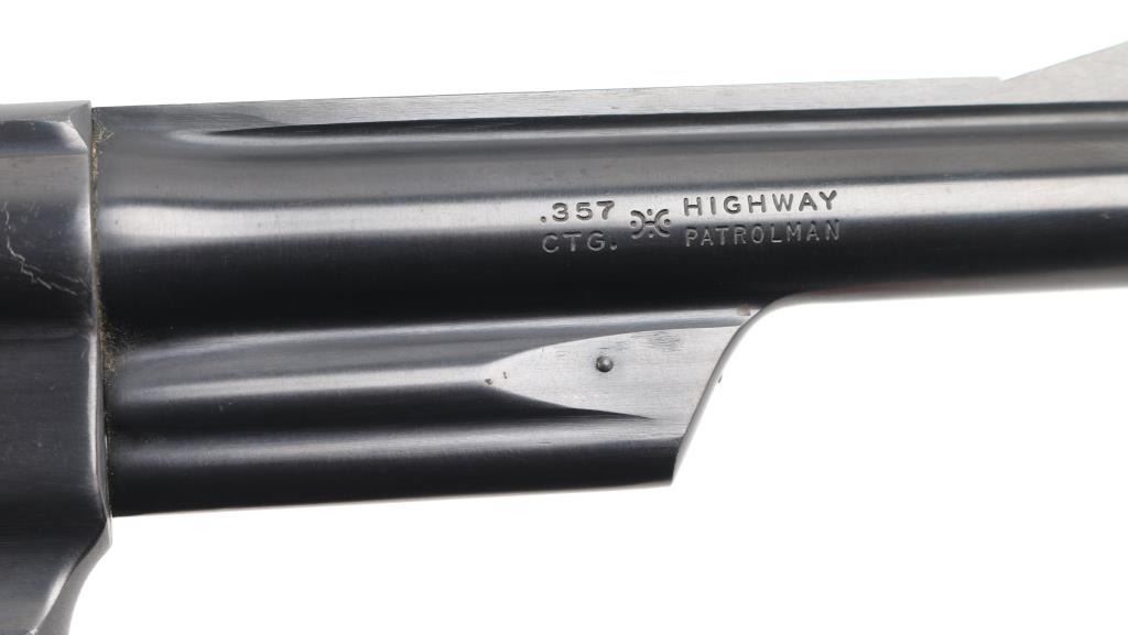 The Highway Patrolman" is a DA/SA revolver with pinned barrel & recessed cylinder for cartridge rims .Built on the square butt N target frame with 5 screws. Produced 1954-86. Features service grade blued finish, walnut Magna grips with S&W medallions, 4" pinned barrel, 3/4 length under lug, serrated raised ramp front sight, adjustable rear sight, serrated narrow trigger, knurled hammer spur, and fluted cylinder. Bore is excellent/bright. Blue is about 90% with minor scratches, slight muzzle wear, tracking & handling wear on the cylinder. Grips look great. Action is smooth/tight. NRA Condition-Very good. Modern Firearm.