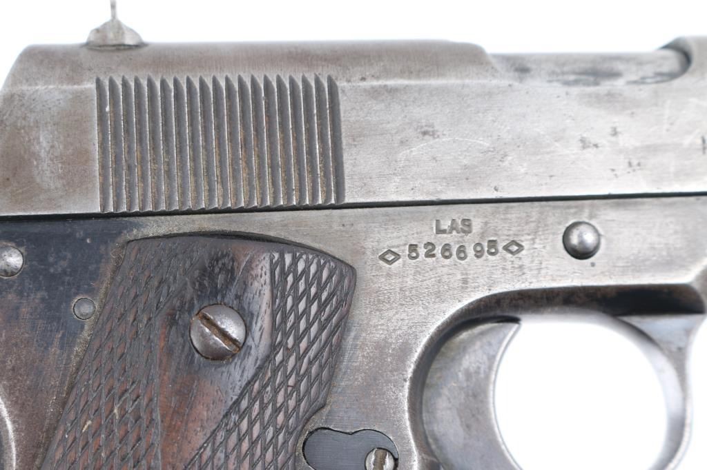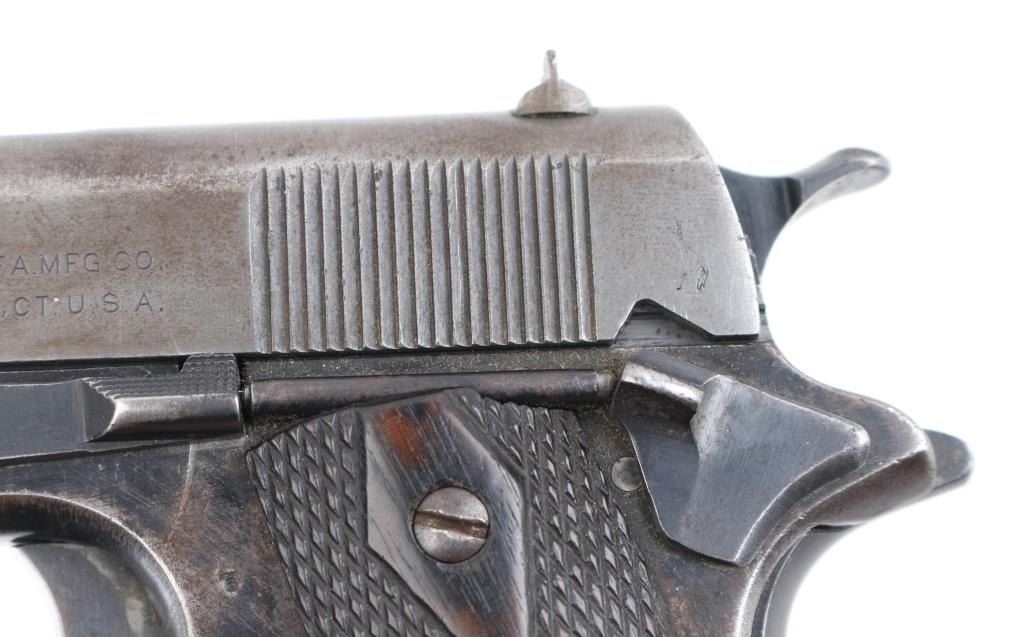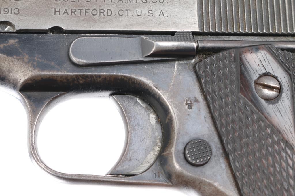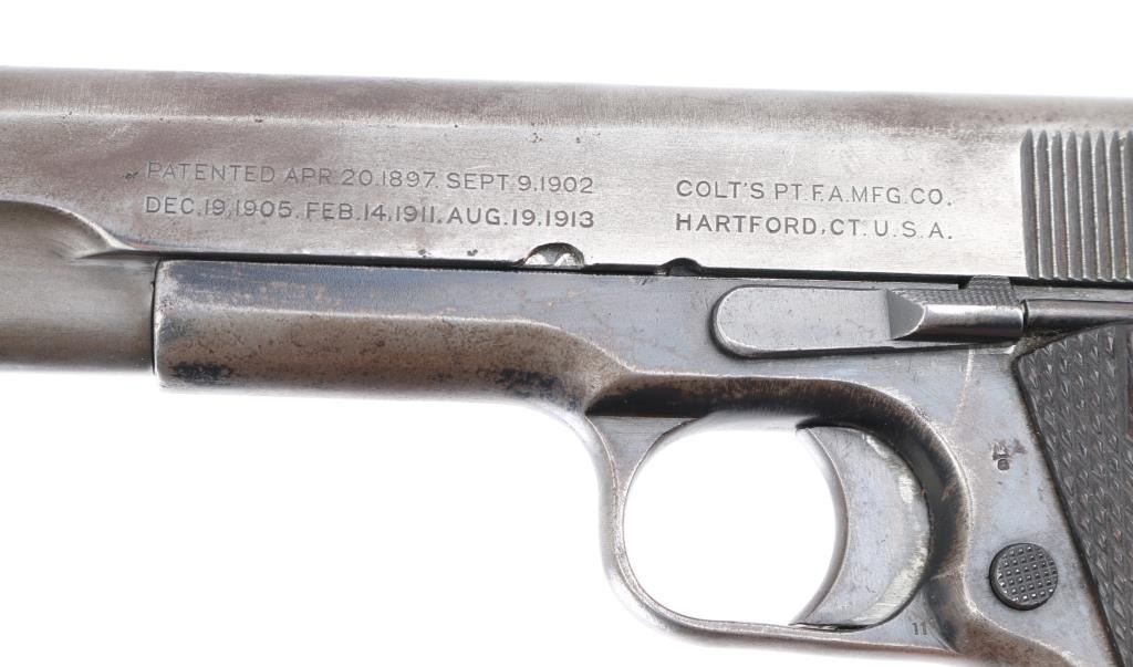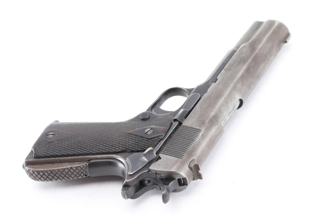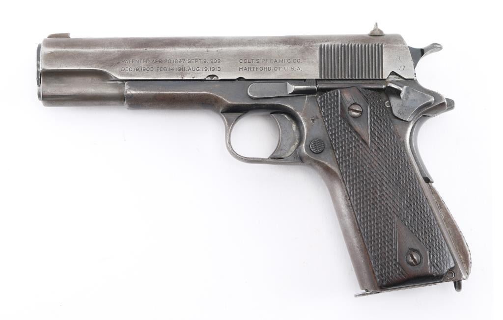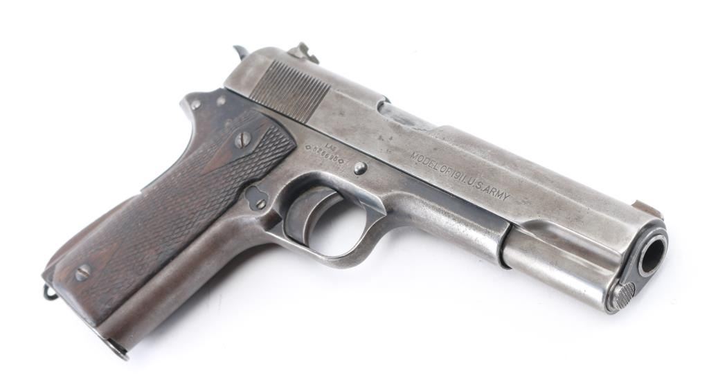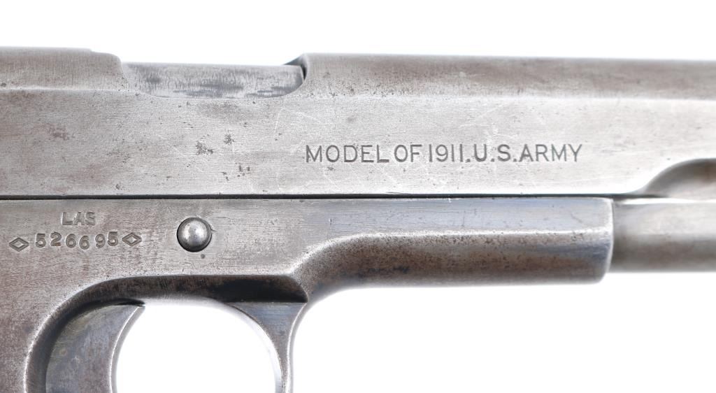 U.S. military contract semi-automatic service pistol chambered in .45 Auto, Manufactured in Hartford, CT circa 1918. The frame is unusually marked “LAS/[diamond]526695[diamond] on the right side, [eagle head]/6 on the left side & “11” on the trigger guard. Specs: 5" barrel marked “F," & "P", patridge front sight, dovetailed square notch rear sight, smooth long trigger, knurled wide hammer spur, manual safety on the left side of the frame, grip safety, push button magazine release, “R” marked 7 round magazine, steel frame, crudely checkered arched mainspring housing with lanyard loop and two piece double diamond checkered walnut grips. The slide is marked "PATENTED APR 20,1897.SEPT. 9,1902/ DEC19,1905. FEB.14,1911.AUG.19,1913," "COLT'S PT. F.A. MFG. CO./HARTFORD,CT. U.S.A." & [rampant colt] on the left side and "MODEL OF 1911. U.S. ARMY." on the right side. Pistol retains approximately 15% bluing with the balance of the metal surfaces displaying an aged grey/brown patina. Action is smooth, the bore shows worn rifling & pitting, markings are fair and the wood grips are fair with wear. Condition is NRA Good. ***C&R Firearm***