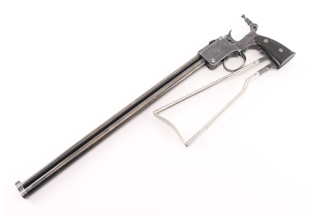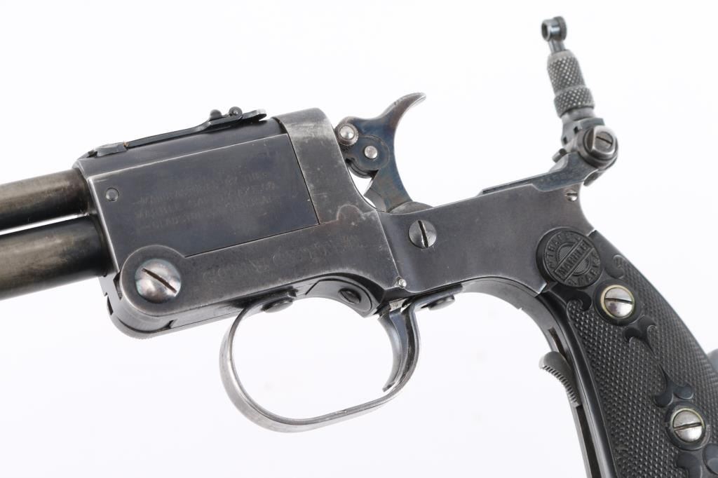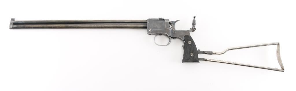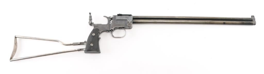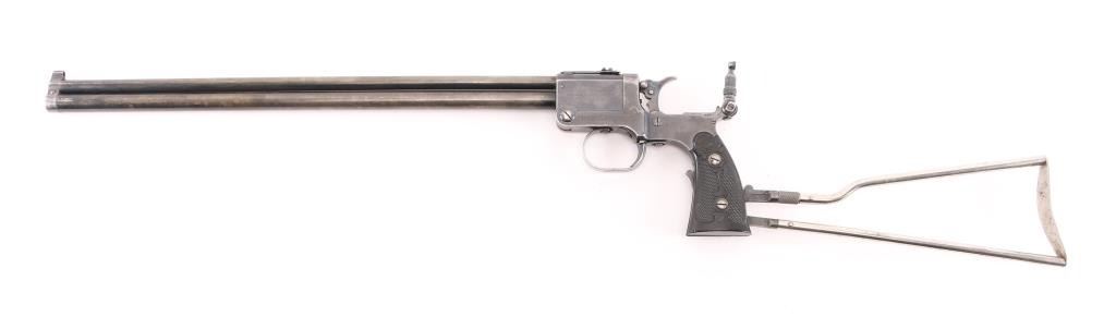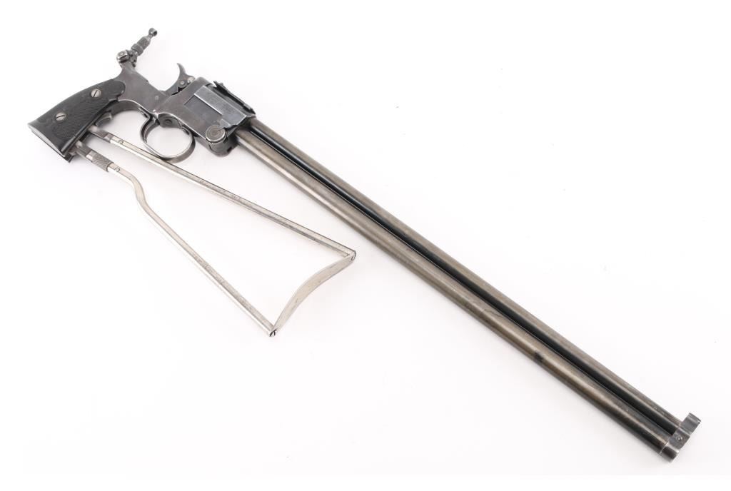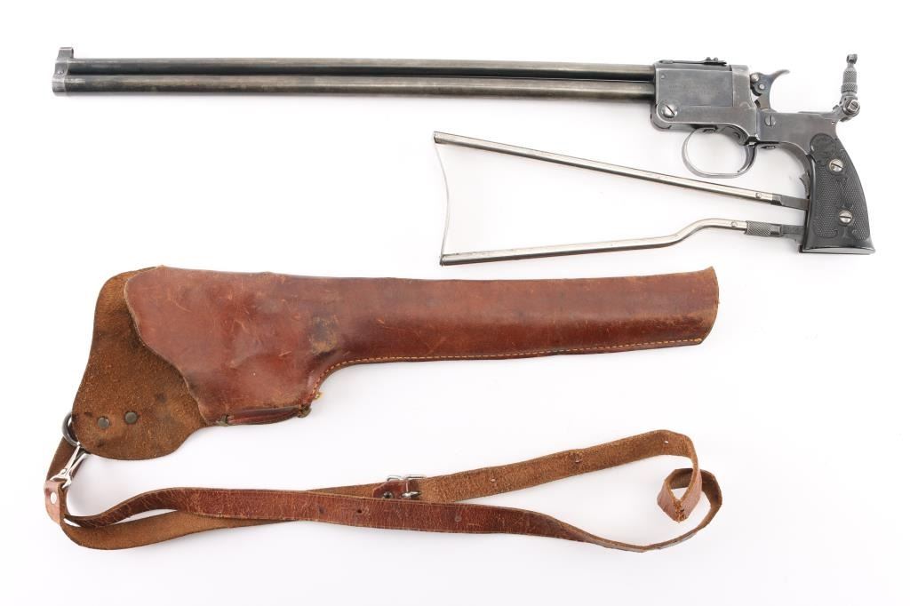SN: 1259. Produced 1908-62. Combination gun features rifle barrel for 22 S/L/LR over 410 shotgun barrel for 2" shells, or for .44 Game Getter cartridges. Barrels are 18", brass bead blade front sight, adjustable rear sight over chambers, Marbles peep tang sight. Shotgun barrel has CYL choke. Barrels are selected by moving the hammer nose. Action is opened by sliding the triggerguard, the adjustable under folding stock folds by depressing a lever on the fore strap Rifle bore is good condition/bright. Shotgun bore is fair, strong rifling, has some pitting above the chamber. Retains about 30% blue, fading to brown in many places, edge losses, patina. Checkered black hard rubber grips are excellent. Folding wire stock retains 90% or better nickel or chrome finish. Markings are crisp, Action is crisp, tight. Comes with the original brown leather holster with strap & paperwork. Condition is NRA Good. C&R Firearm