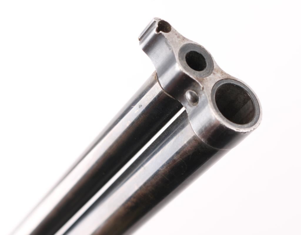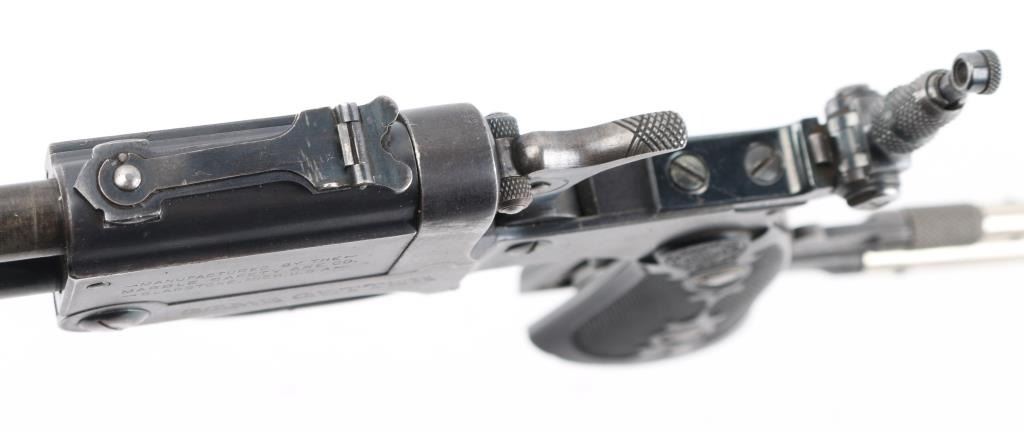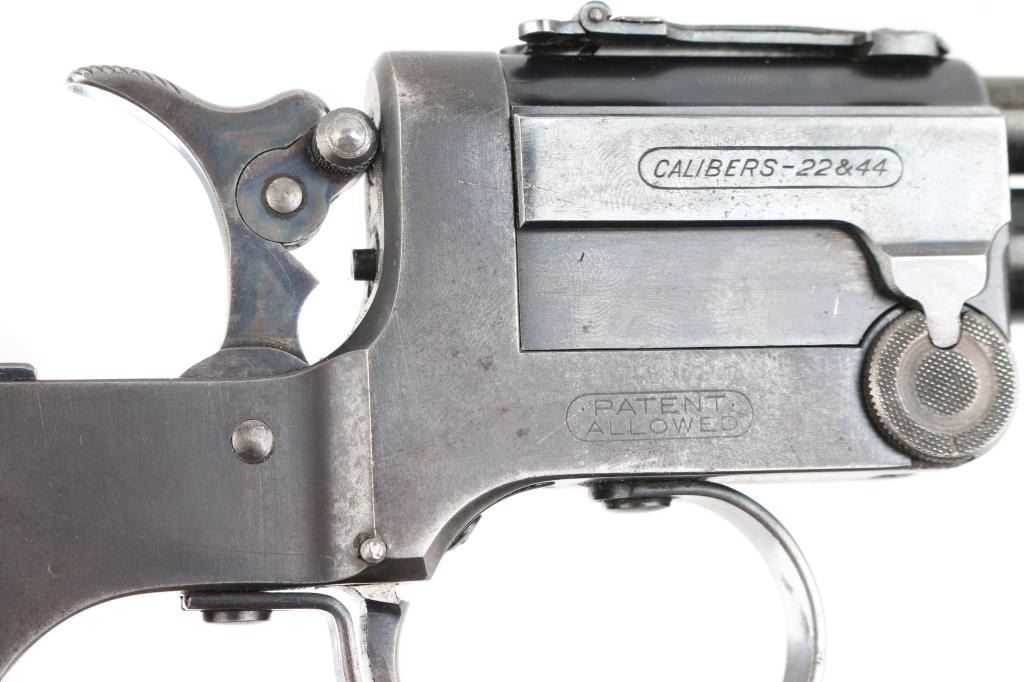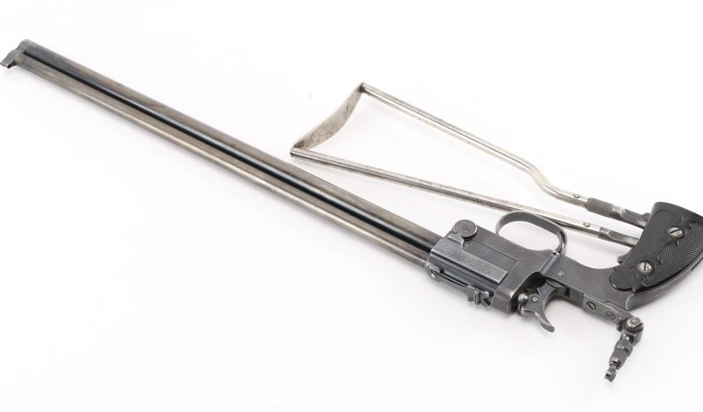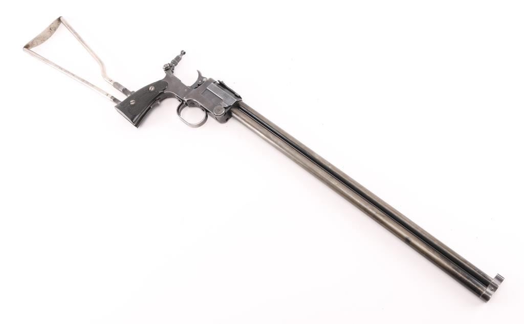 SN: 1259. Produced 1908-62. Combination gun features rifle barrel for 22 S/L/LR over 410 shotgun barrel for 2" shells, or for .44 Game Getter cartridges. Barrels are 18", brass bead blade front sight, adjustable rear sight over chambers, Marbles peep tang sight. Shotgun barrel has CYL choke. Barrels are selected by moving the hammer nose. Action is opened by sliding the triggerguard, the adjustable under folding stock folds by depressing a lever on the fore strap Rifle bore is good condition/bright. Shotgun bore is fair, strong rifling, has some pitting above the chamber. Retains about 30% blue, fading to brown in many places, edge losses, patina. Checkered black hard rubber grips are excellent. Folding wire stock retains 90% or better nickel or chrome finish. Markings are crisp, Action is crisp, tight. Comes with the original brown leather holster with strap & paperwork. Condition is NRA Good. C&R Firearm