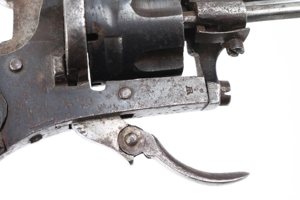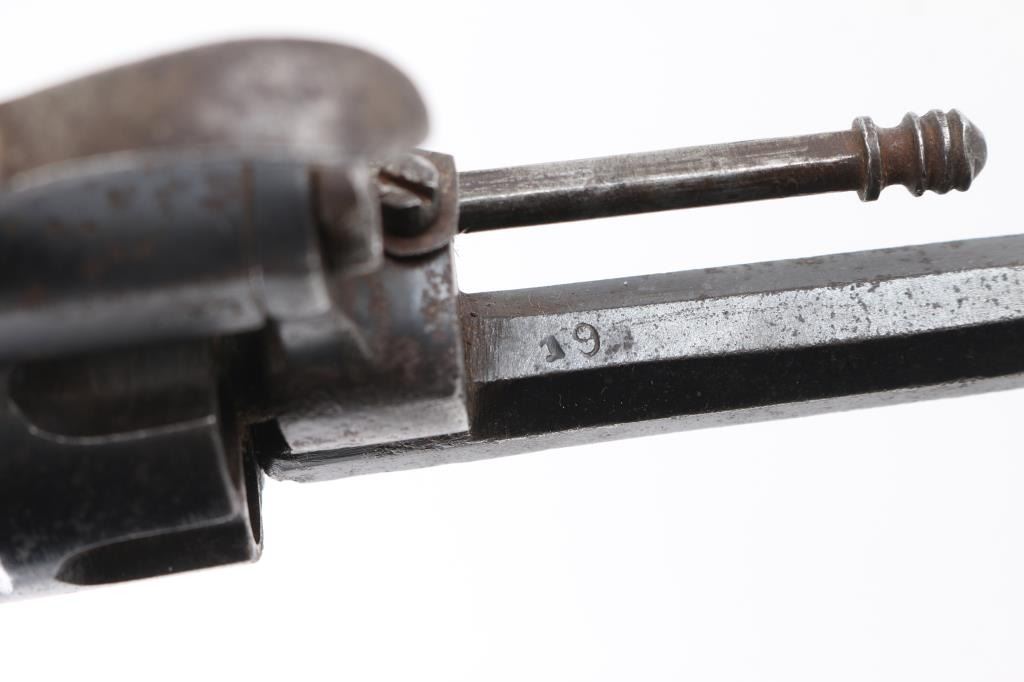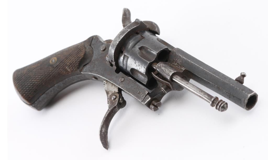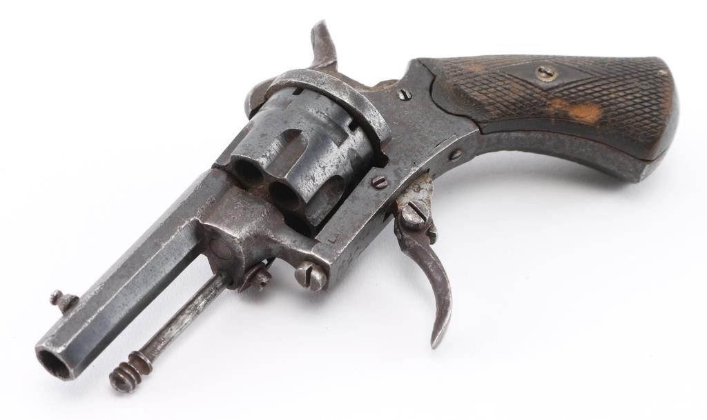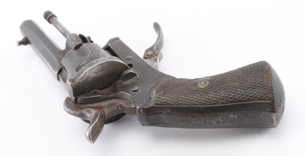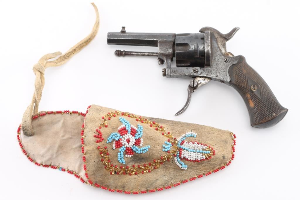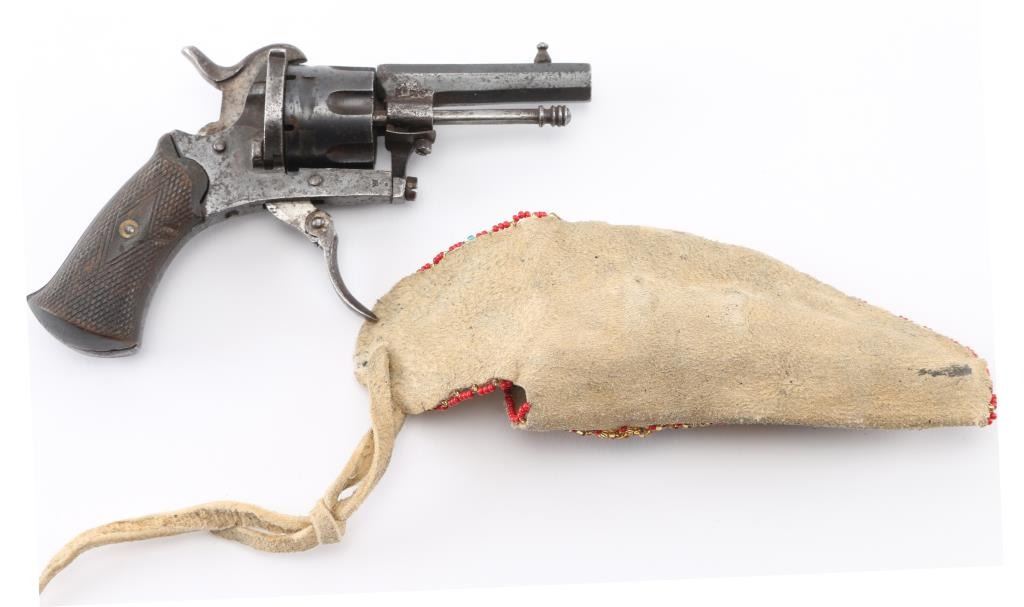 Vintage Sioux leather beaded with multi-colored geometric motifs containing a antique 7mm Lefaucheux type pinfire revolver. S/D action, 2.1/4" octagonal barrel, British proofed, serial number 19 matched on frame & cylinder, 'LEM' marked on left frame. folding trigger,open top frame. Retains about 60% of its blue finish, scattered light pin-prick pitting, action works well. Checkered wood grips. Condition is NRA very good.., The revolver is a perfect fit in the holster and appear to be together for a long time. Holster is very good with no tears, or missing beads. Antique Firearm