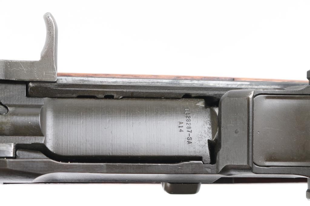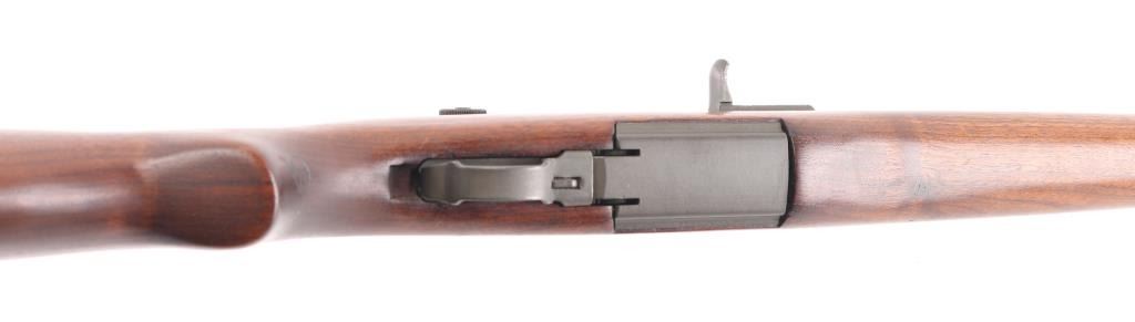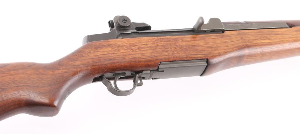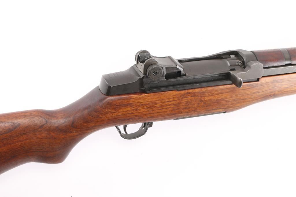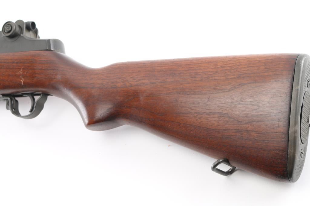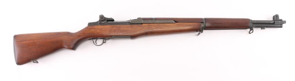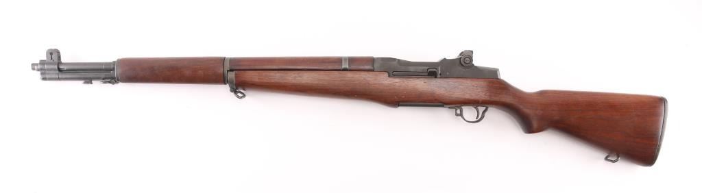 US military semiautomatic rifle manufactured circa 1955. Features parkerized finish, wood stock & hand guards, 24" barrel, adjustable sights with protected front blade & protected rear peep, fixed magazine for en-bloc clip, manual safety. Rear sights and triggerguard are later style. Bore is very good condition. Metal parts retain 85% medium gray finish, some variations in color on various parts, with edge losses & handling marks, scratches on op rod. Wood is very good, fairly close color match among the stock and handguards, appears to have a tung oil type finish applied. Observed trigger group parts are "SA" marked, op rod is "SA", barrel is "SA F6535448 8 55 A221A" marked. Retains "P" (in circle) stamp in wood under wrist. Markings are crisp. Includes approx 20 empty Garand clips. Condition is NRA Very Good++ *** C&R Firearm ***