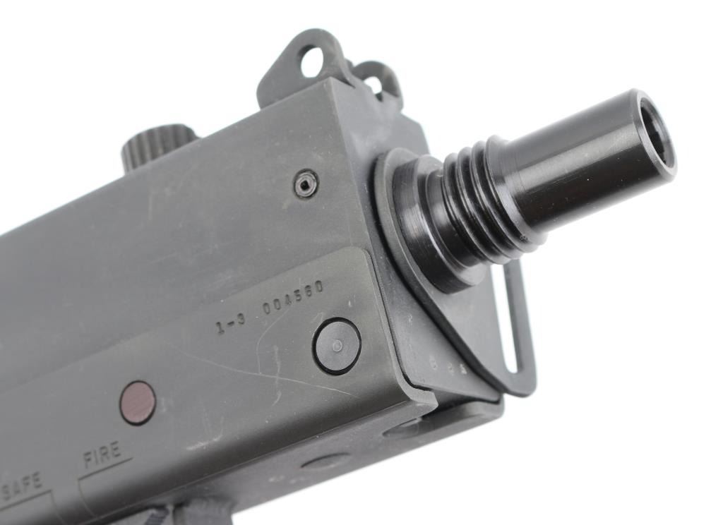 Fully transferable selective fire machine gun. A consecutive numbered machinegun is also in this auction, see other lot. Features dark gray parkerized finish, black polymer backstrap on grip, approx 6" threaded barrel, fixed sights, collapsing steel wire stock, sling slot swivel between barrel & receiver, manual safety, mode selector for semi or full. Bore is pristine. Metal is in excellent condition, nearly perfect, with few minor handling marks. Includes a steel 30 rd magazine. Condition is near NRA Perfect ***NFA Firearm*** ***Fully Transferable***