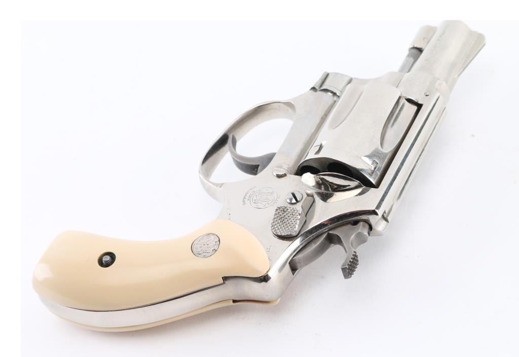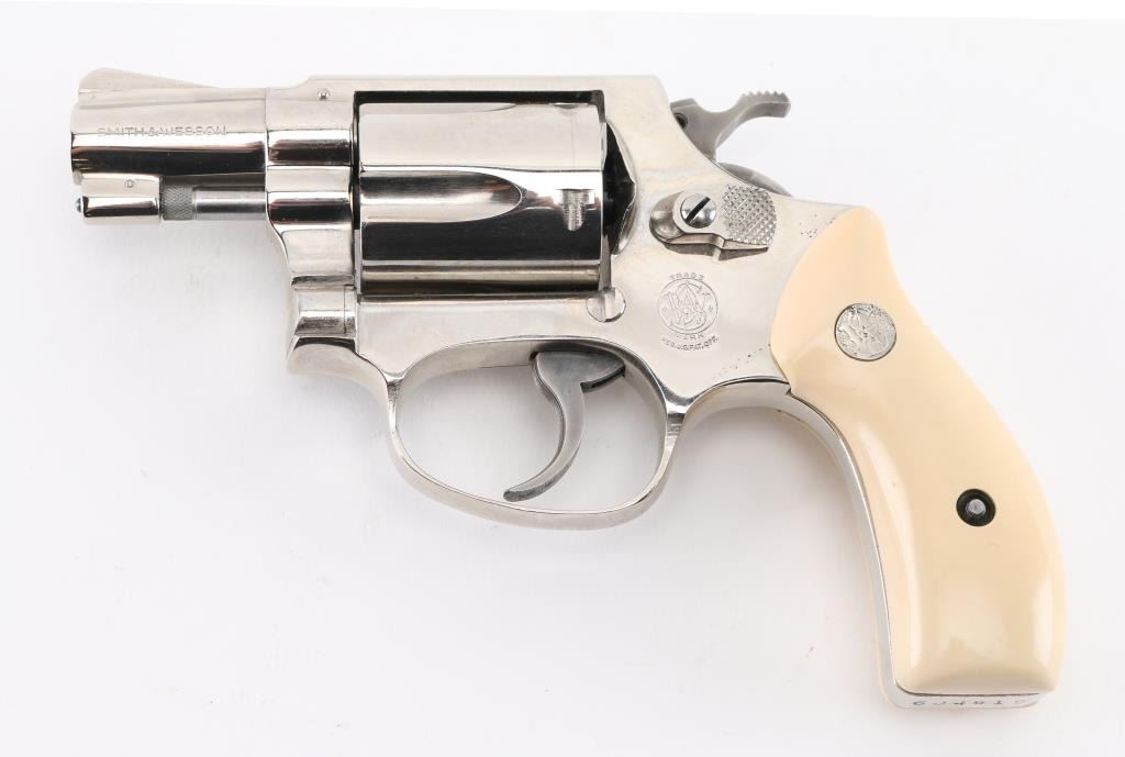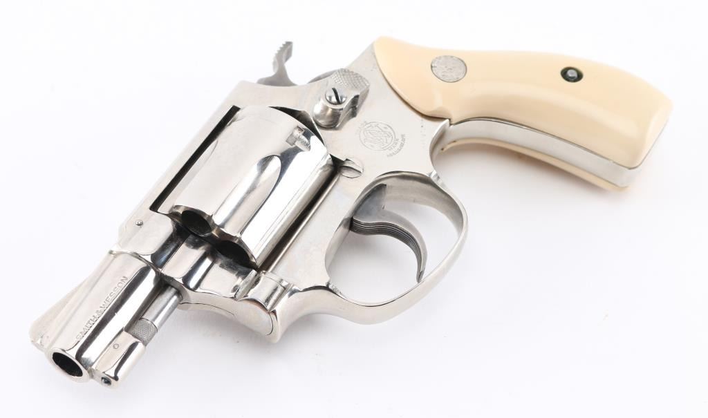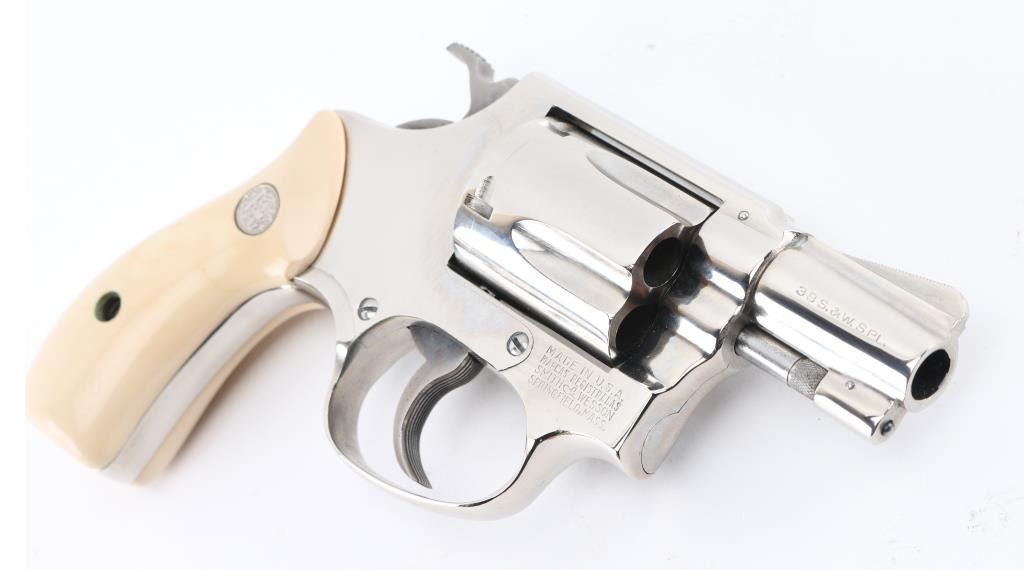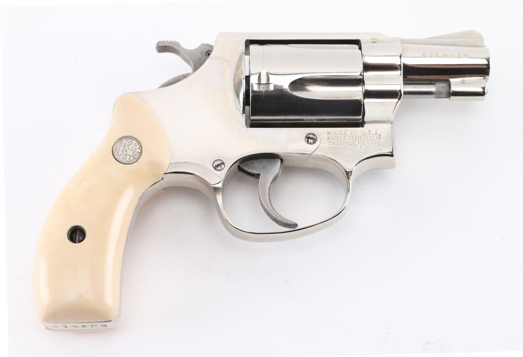 American made revolver,SA/DA, polished nickel finish, approximately 1 3/4" barrel, bore and cylinders are bright, serrated ramp front sight, notch in top strap for rear sight, three screw sideplate, serrated hammer spur, checkered barrel release, serrated trigger, S&W logo on left side of frame, smooth metal backstrap, square butt, ivory-colored grips with S&W logo, grip screw extrudes through the left grip, drag marks on cylinder, finish is excellent. The floating "J" series began in 1970 at 1J1. The ones from that first series shipped in 1969, 1970, and some in 1971, overlapping with the roving "J" series by a wee bit. Since S&W didn't ship in serial number order, there was always a bit of overlap when the series changed. **NRA Very Good** Modern Firearm