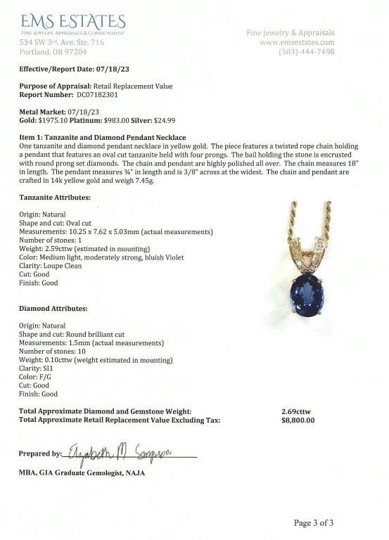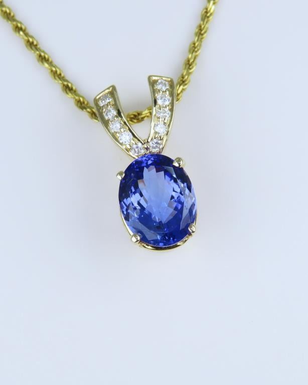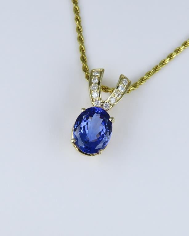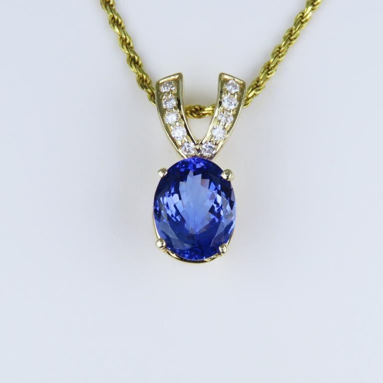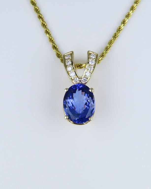 and Diamond Pendant featuring an oval cut AAA Tanzanite weighing approx. 2.59 carats with extra vivid Blue Violet color accented with 10 round cut Diamonds in 14 karat yellow gold custom setting. Full Retail Appraisal - $8,800.00