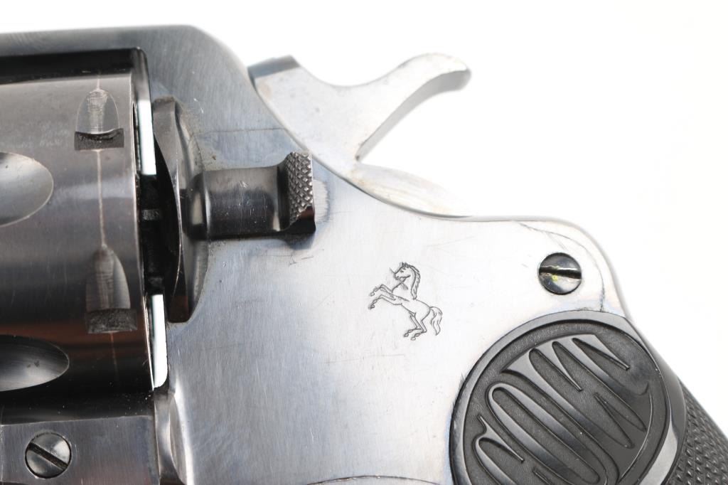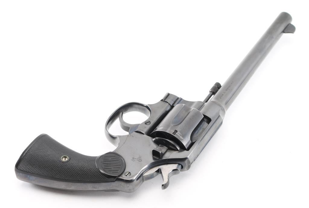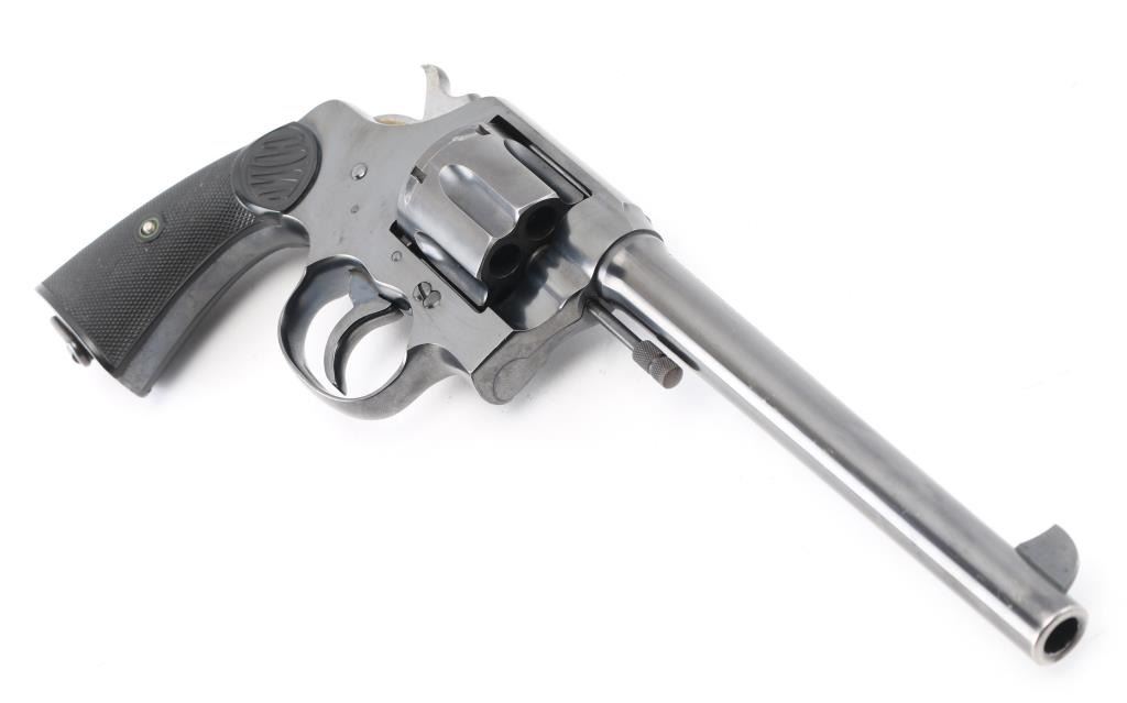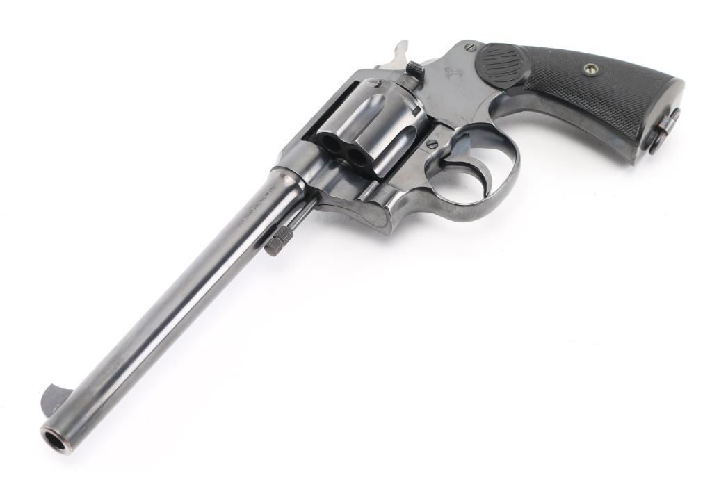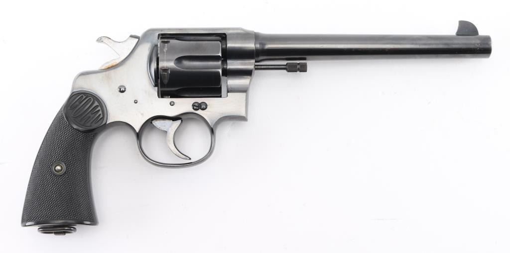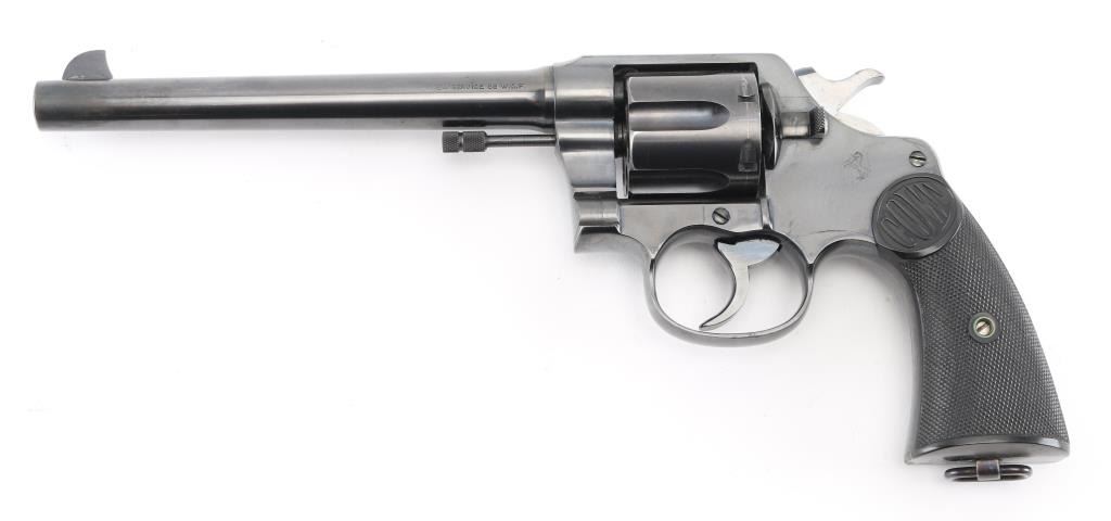 Large frame pre-war revolver, D/S-Action. 6-rd capacity. Manufactured 1928. Produced 1898-1941. This model was adopted by the U.S. Military as the Model 1909. 7.5" round barrel with fixed front blade, and rear notch sights. 2-Line Colt address, patent dates on top of barrel. "Rampant Colt" on sideplate. "New Service 45 Colt .38 W.C.F." (38-40) on left side of barrel. Smooth trigger. Lanyard ring present. Action is smooth/tight. Bore/cylinders are excellent/bright, Checkered hard rubber grips with "Colt" are excellent. Blued finish is about 98% with very minor drag lines, and a small area on the left muzzle that appears to have been touched up. All markings are crisp clear. It would be hard to find a Pre-War New Service in condition. NRA Condition-Excellent. C&R Firearm.