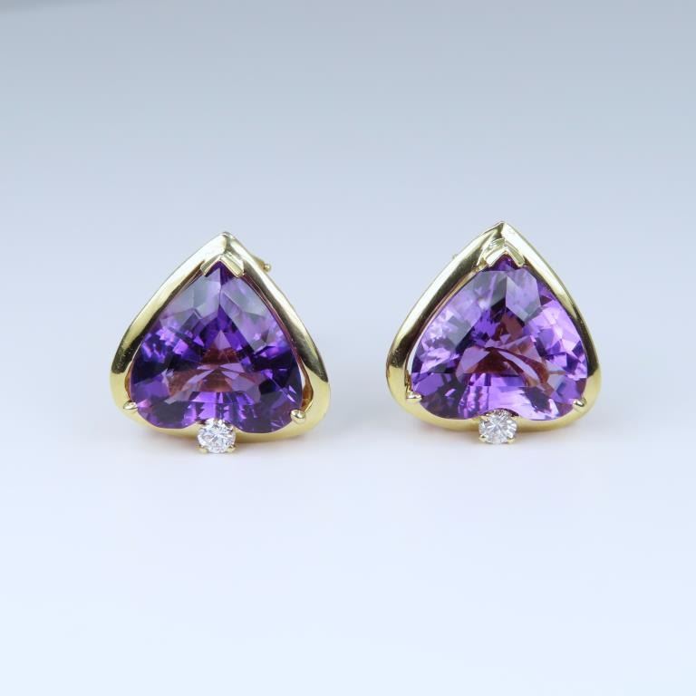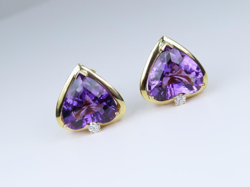 featuring 2 matching heart shaped Amethyst weighing approx. 20.00 carats total with 2 accent Diamonds. Custom crafted 14 karat yellow gold settings with pierced Omega backs. Retail $5,000-$6,000