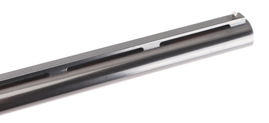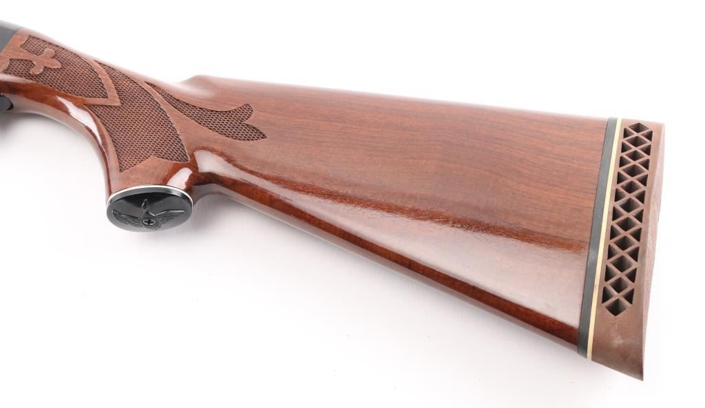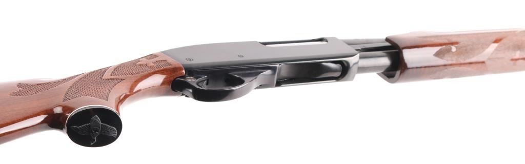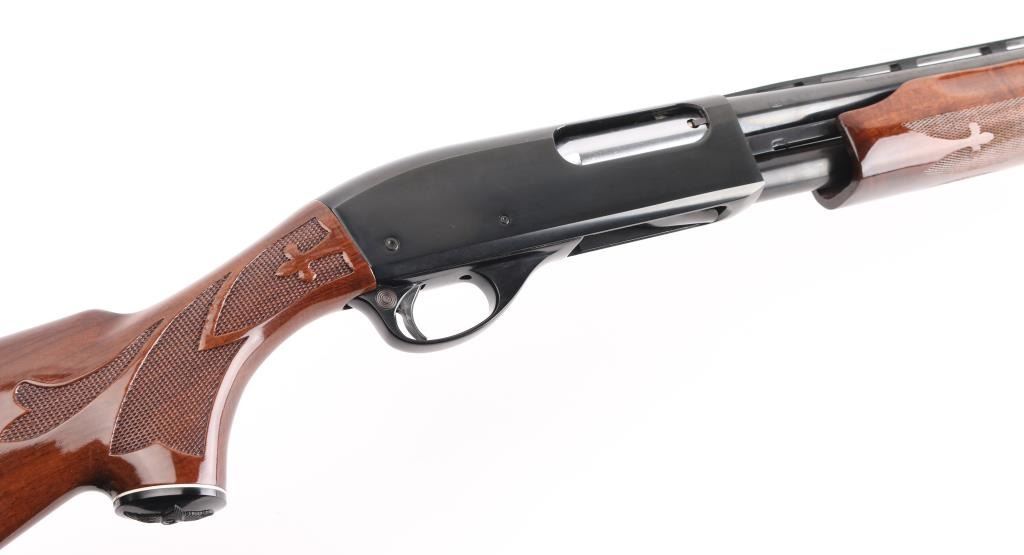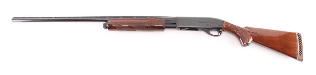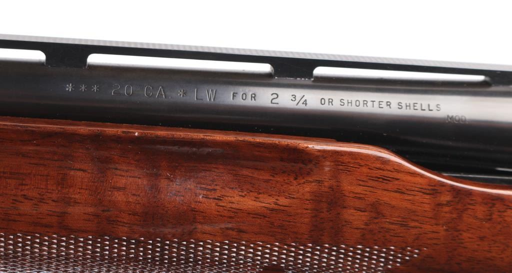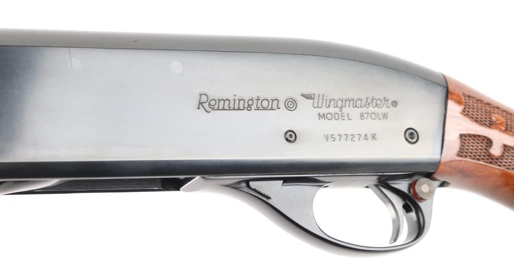 Wingmaster pump action shotgun, chambered for 2 3/4" or shorter shells, approximately 28" vent rib barrel, bore is bright, bead front sight, smooth trigger, checkered forend stock, checkered wrist and grip, Remington rubber recoil pad, barrel scratched on right side. LOP is 14". "LW" means that it is built on the 20 gauge frame rather than the earlier 12 gauge frame. **NRA Excellent** Modern Firearm