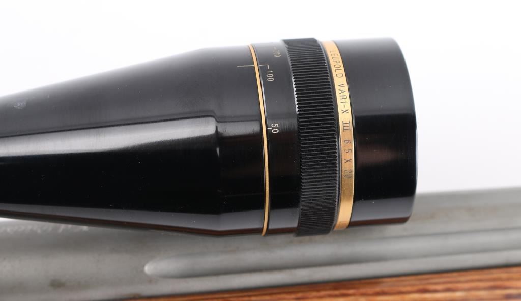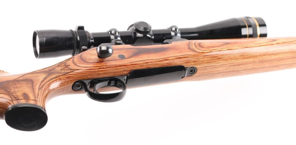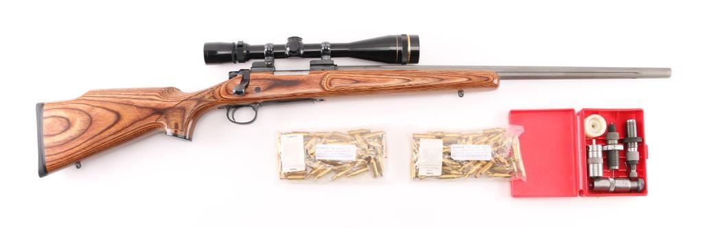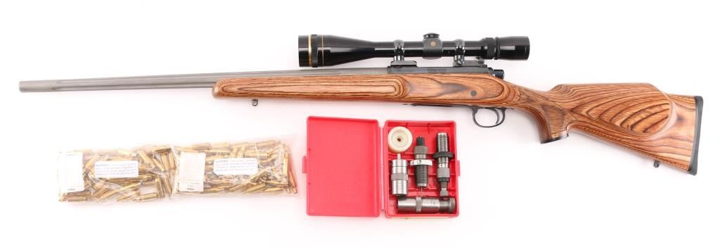 This is a custom sporting rifle built on a Remington model 700 receiver. Rebarreled with a 24" matte stainless steel fluted barrel chambered in .22 PPC. Monte Carlo highly figured pistol grip stock, shadow line cheek piece, checkered grip with black cap, thin factory recoil pad. Manual safety, machine turned 'jeweled' bolt Mounted with a Leupold Vari-X III 6.5x20 scope, clear view, Redfield bases, rings. Bore is excellent/bright, action is smooth, finish and wood are excellent. Comes with 2 bags of 50 .22 PPC new pieces of brass (110 total) and a Bonanza complete set of reloading dies for .22 PPC. NRA Condition-Excellent. Modern Firearm.