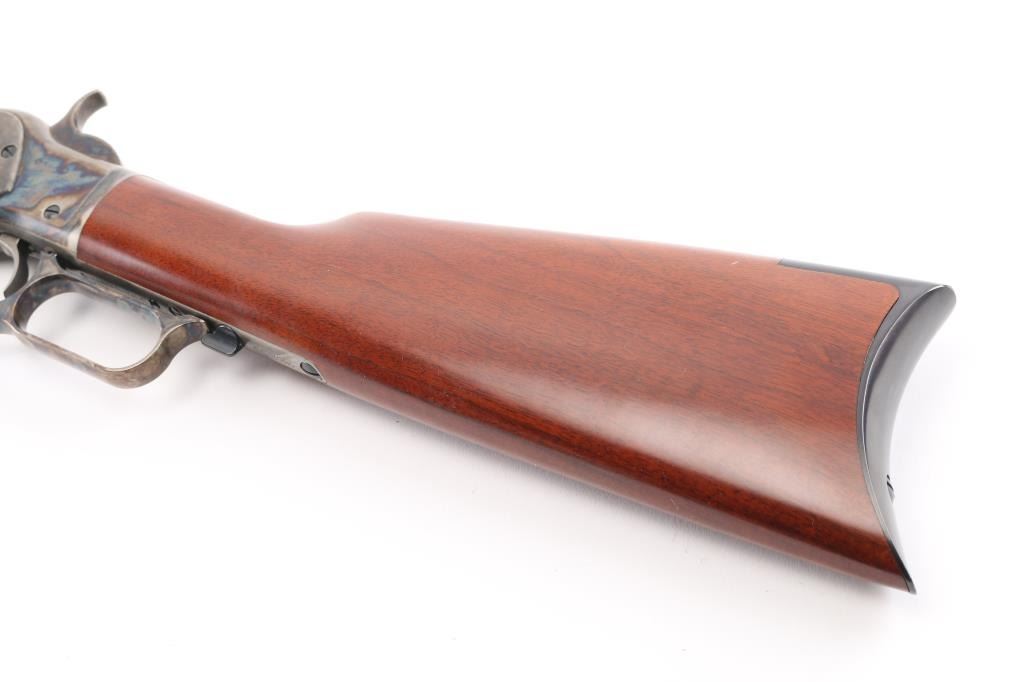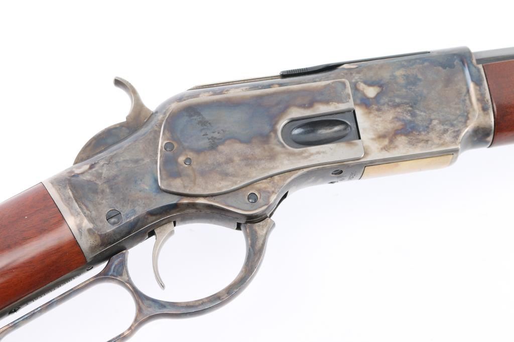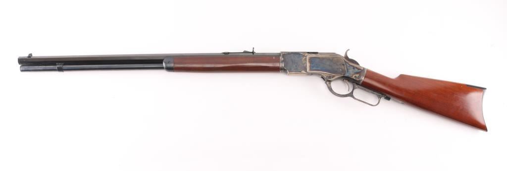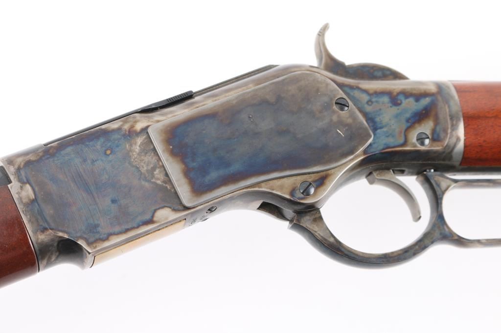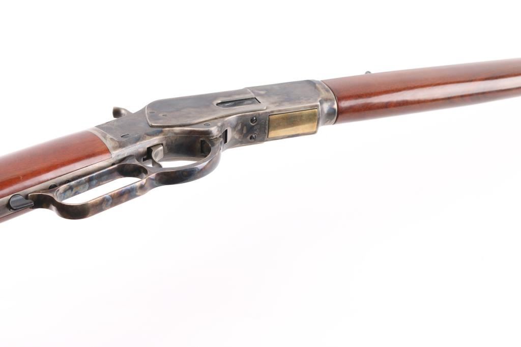 Italian made replica of the Winchester lever action repeating rifle, imported by Navy Arms, Union City NJ. Features a blued/case hardened finish, 24" octagon barrel, dovetailed blade front sight, adjustable semi buckhorn rear sight, full length tube magazine, sliding dust cover, smooth trigger, knurled hammer spur, grip safety, lever locking latch, smooth walnut forend with metal cap and straight grip shoulder stock with crescent metal buttplate. Bore is pristine. Retains 95% finish with minor handling marks. Case colors are bright. Wood shows few small blemishes from handling and use. Condition is NRA Excellent *** Modern Firearm ***