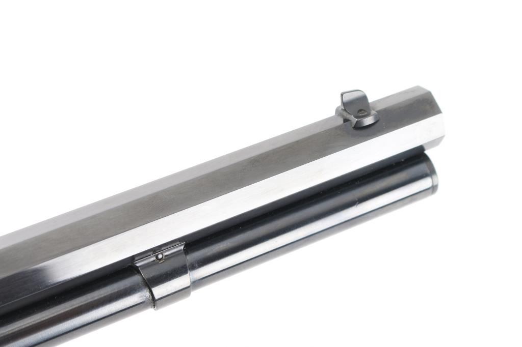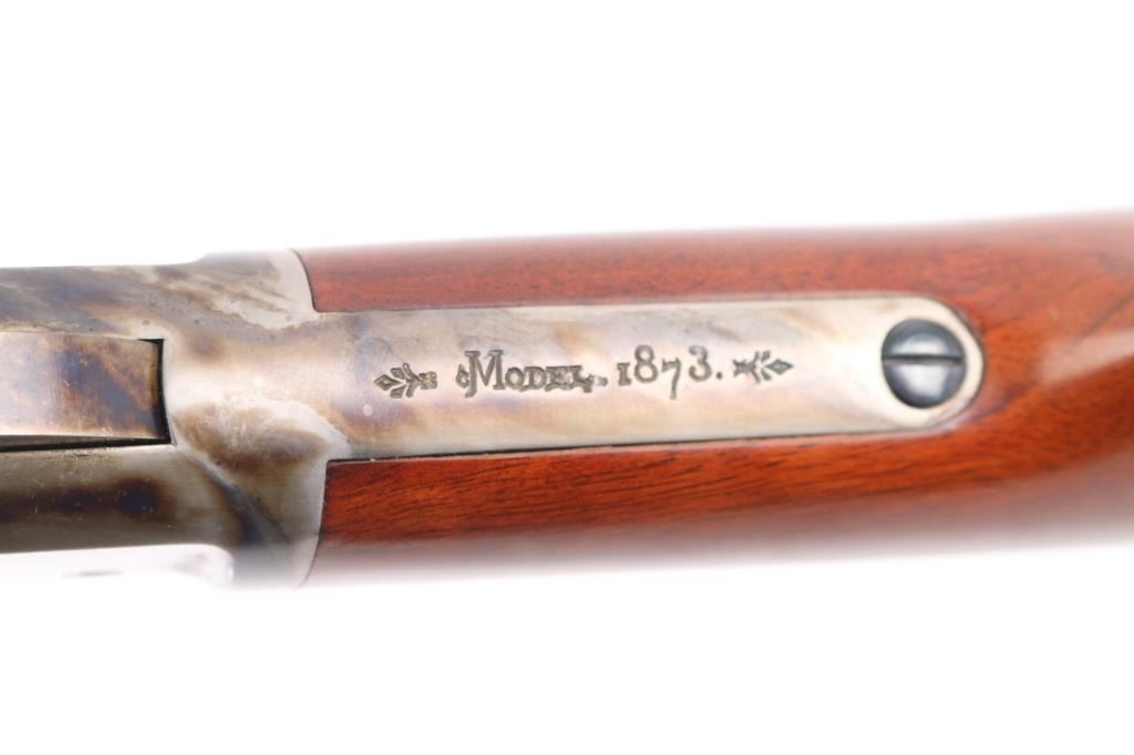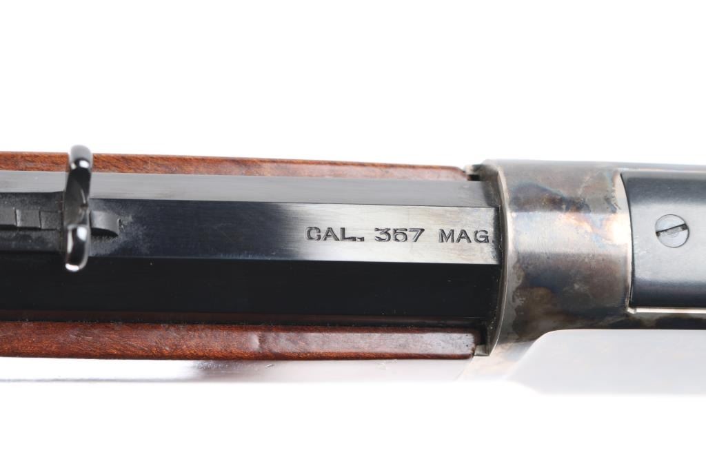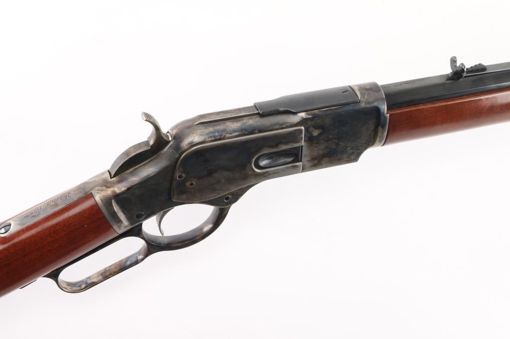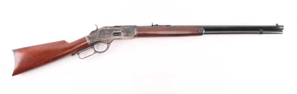 Italian made replica of the Winchester lever action repeating rifle, imported by Navy Arms, Union City NJ. Features a blued/case hardened finish, 24" octagon barrel, dovetailed blade front sight, adjustable semi buckhorn rear sight, full length tube magazine, sliding dust cover, smooth trigger, knurled hammer spur, grip safety, lever locking latch, smooth walnut forend with metal cap and straight grip shoulder stock with crescent metal buttplate. Bore is pristine. Retains 95% finish with minor handling marks. Case colors are bright. Wood shows few small blemishes from handling and use. Condition is NRA Excellent *** Modern Firearm ***