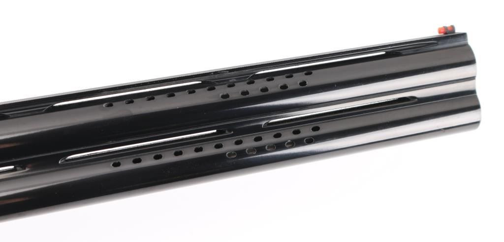 Italian made under/over double barrel trap shotgun chambered for 2 3/4" 12 gauge shells. Imported by Bergen Corp. NY. Features blued 29.5" ventilation rib ported barrels with Full/ CYL chokes, automatic ejectors, red bead front sight, silver bead mid-sight, silver finished receiver, adjustable knurled trigger, sliding tang selector/safety, high gloss checkered walnut semi-beavertail forend and pistol grip shoulder stock, 'Trapdude' adjustable recoil pad, gold tone monogram oval on underside of butt engraved "CDC". Shotgun exhibits approximately 98% of it's original finish showing only slight muzzle wear and a few very light handling marks. Action is crisp, bores are pristine and wood stocks are fine. There is on the extended recoil pad posts. Condition is NRA Near Excellent. Modern Firearm.