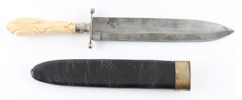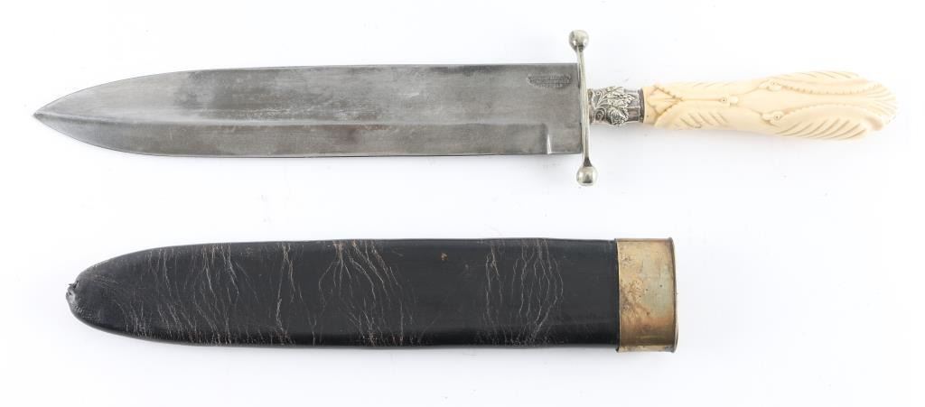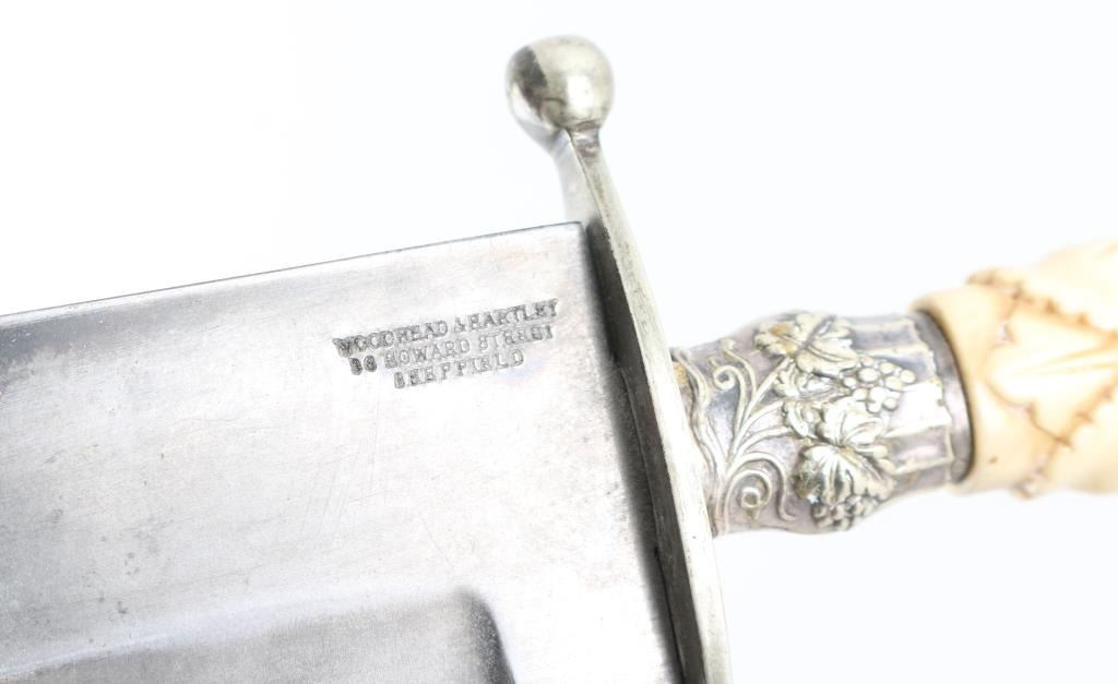 with carved ivory handle, sterling fitting with oak leaf motif, maker marked 15" overall with 9 5/8" blade. Includes black leather sheath. Age uncertain. Marked "WOODHEAD & HARTLEY HOWARD STREET SHEFFIELD"