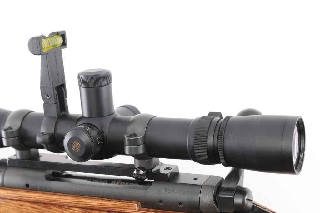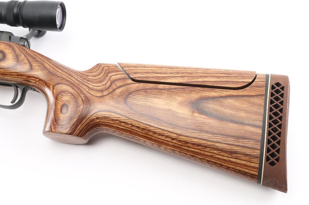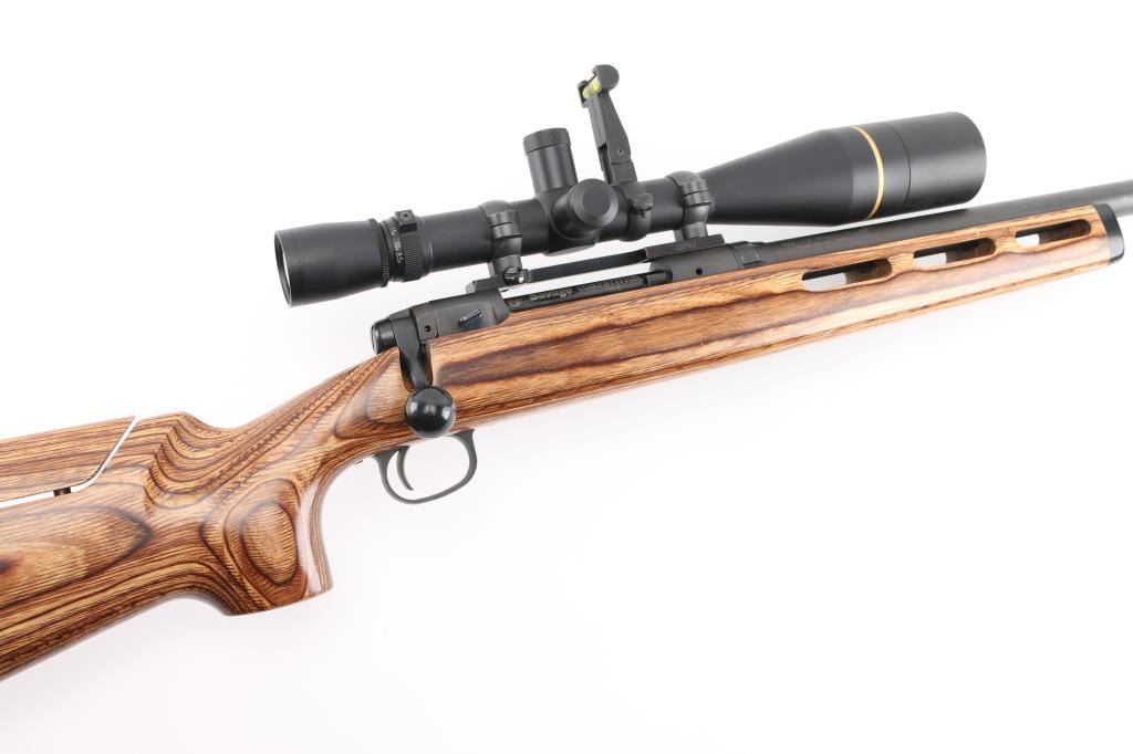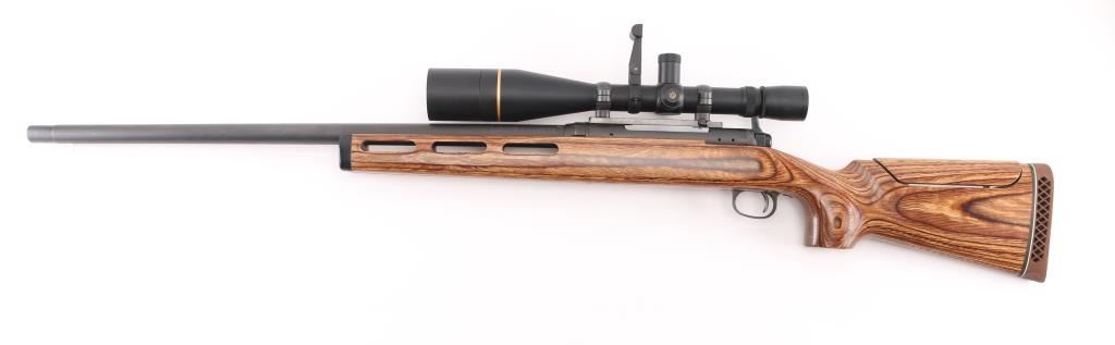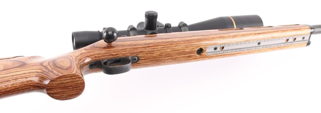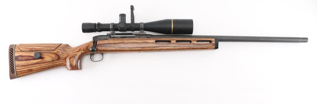 Magazine fed bolt action rimfire rifle chambered in .223 Rem. Features a matte finish, tapered 26" carbon steel barrel without provisions for sights, installed Leupold scope base, serrated trigger, sliding safety on the rear of the receiver, internal 3-rd magazine, and stripped wood laminate, ventilated, bench rest stock with underside accessory rail and adjustable comb, rubber recoil pad & 13” LOP, mounted with a Leupold Vari-X III 4.5X14x50MM Scope with prism, clear optics. Rifle shows little sign of use, bore appears excellent. Action is smooth/tight. Finish & wood are excellent, NRA Condition-Excellent. Modern Firearm.