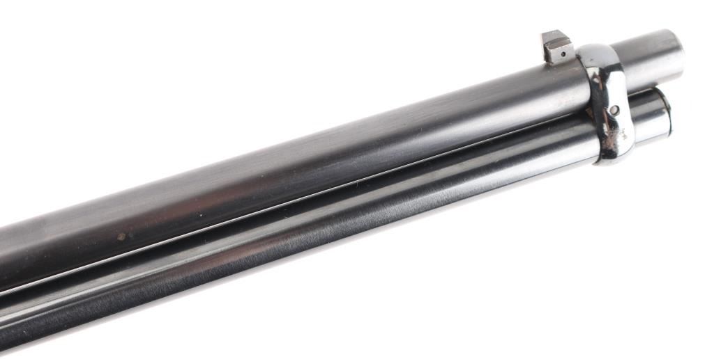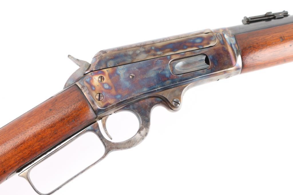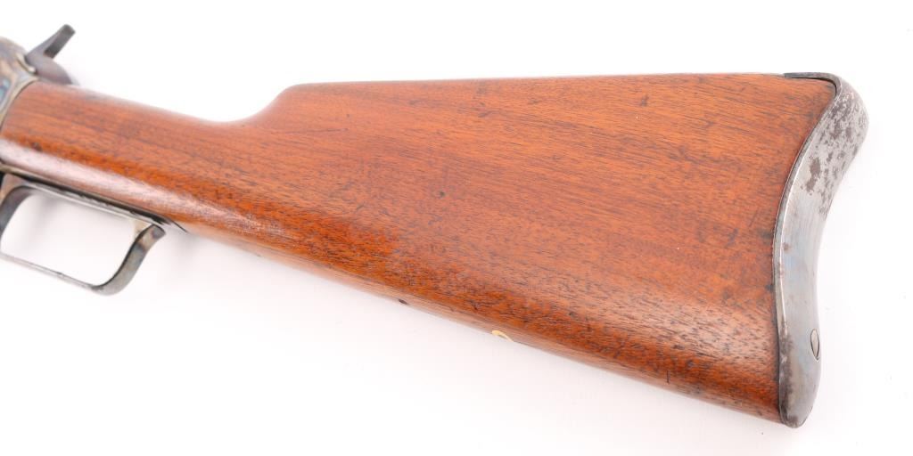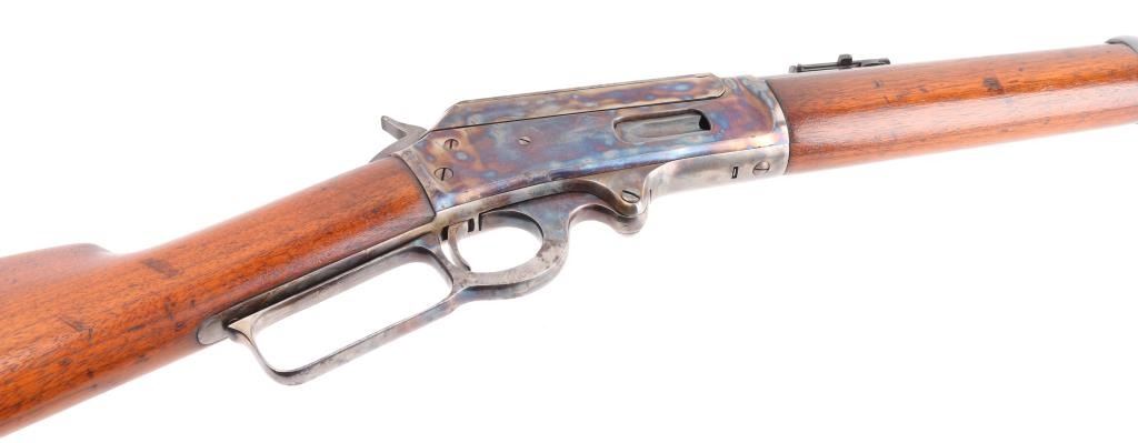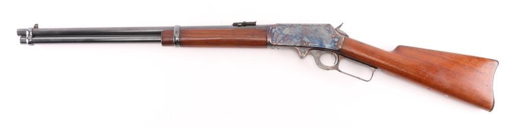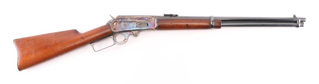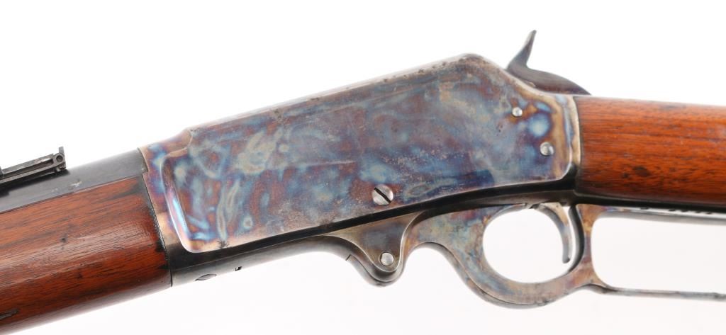 Refinished antique lever action rifle chambered for 32-40 cartridges circa 1985. Carbine configuration with a 20" reblued barrel, full length magazine tube, blade front sight, adjustable rear, smooth trigger and knurled hammer spur. Refinished two piece wood stocks have a barrel band and metal butt plate. Receiver is refinished color case hardened. Reblue on barrel & tube looks good. Receiver retains pretty good color but there is scratches and small areas of pitting/rust mostly on the left receiver edges.. Wood looks good as refinished, no cracks, a few small dings or scuffs. A little rust on the butt plate. Bore is very good/bright. Condition is NRA Very Good as Refinished. Antique Firearm.