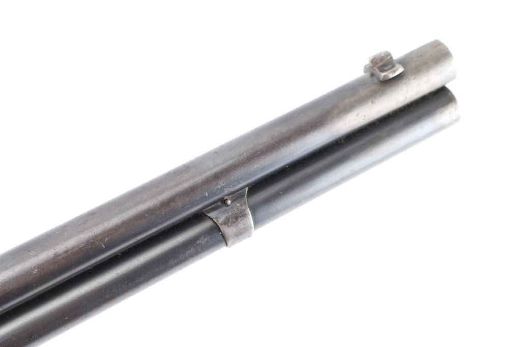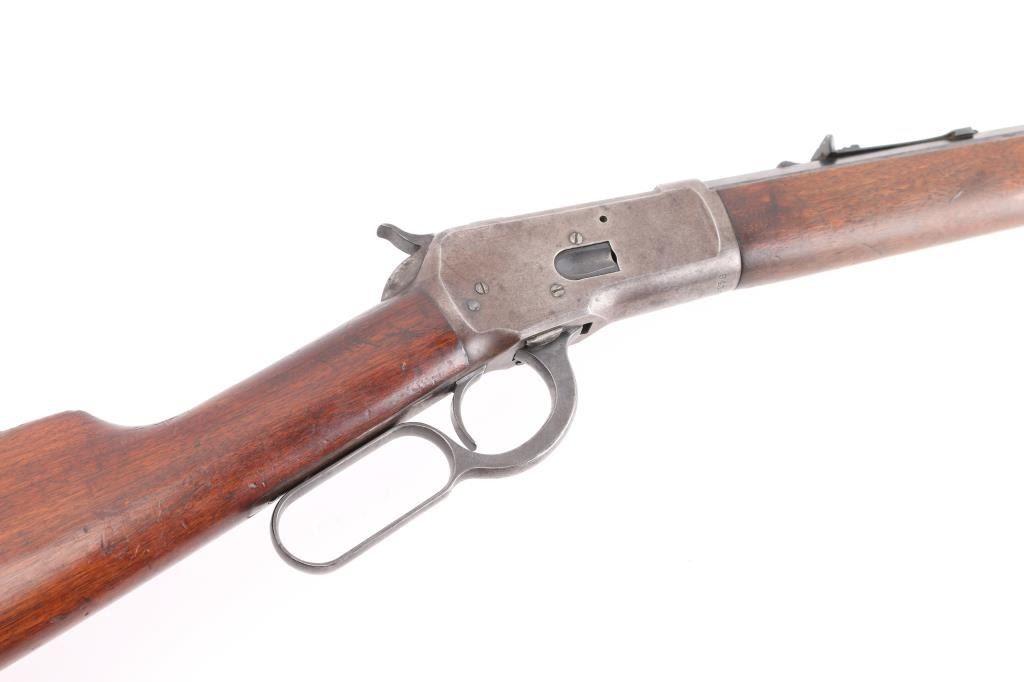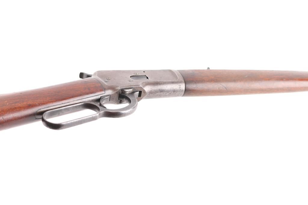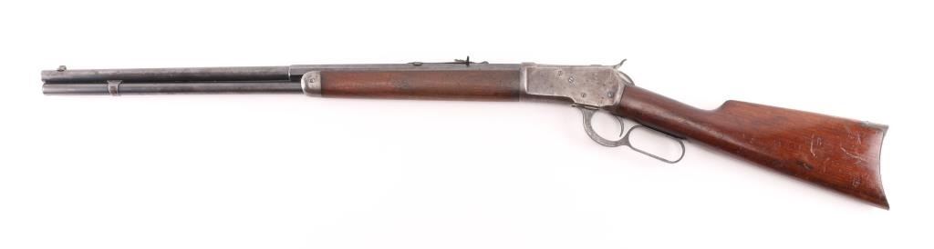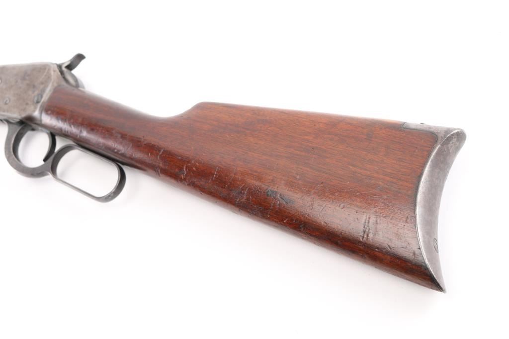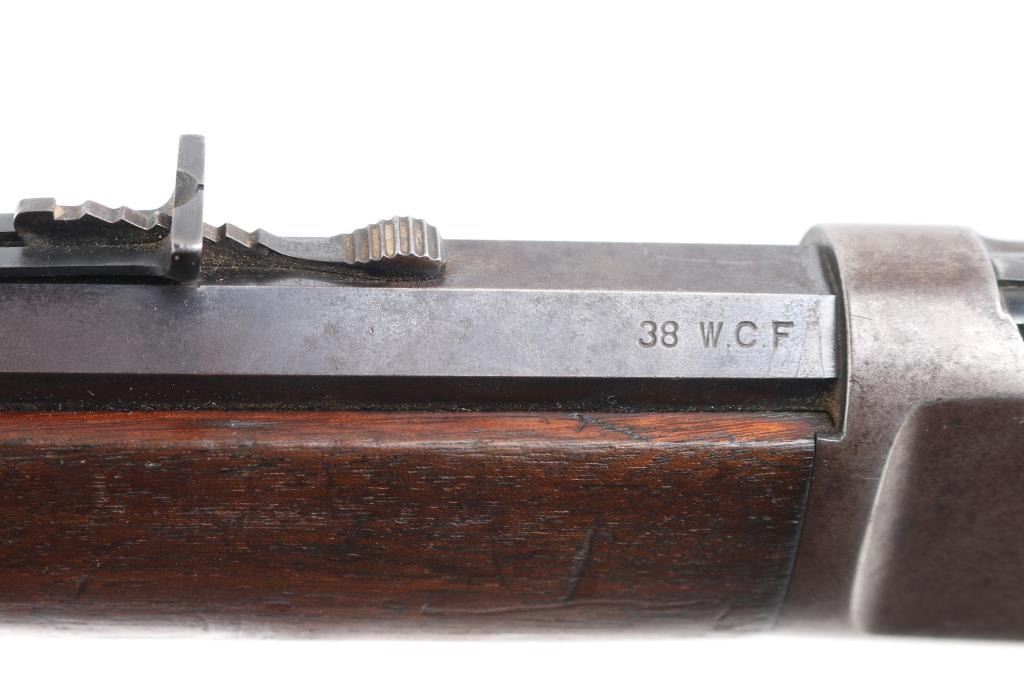 Vintage lever action rifle chambered for .38 Winchester Center Fire ammunition circa 1916. It has a 24" half octagon, half round barrel, full length magazine tube, blade front sight, adjustable rear sporting sight, smooth trigger and knurled hammer spur. Two piece smooth wood stocks have a metal forend cap and a metal butt plate. Blue is about 40% with the rest a gray/brown patina, some light scattered pin prick pitting, mostly on the barrel/tube, wood is very good with minor scratches/dings, action is crisp/tight, bore is good with some very light areas of pitting. NRA Condition-Fair to Good. C&R Firearm.
