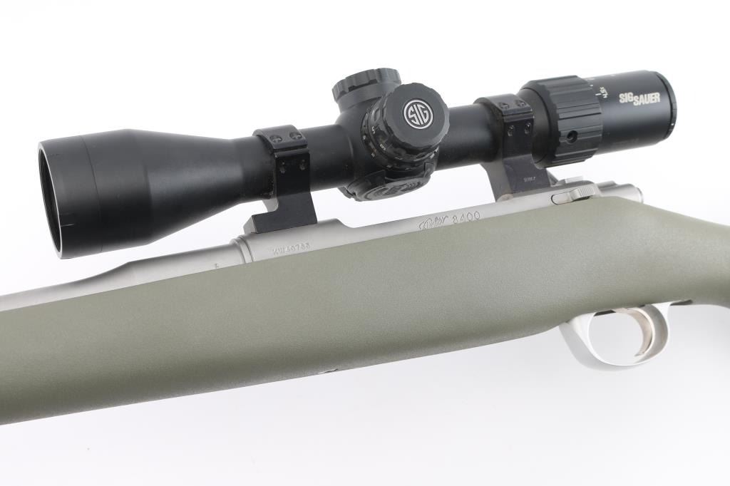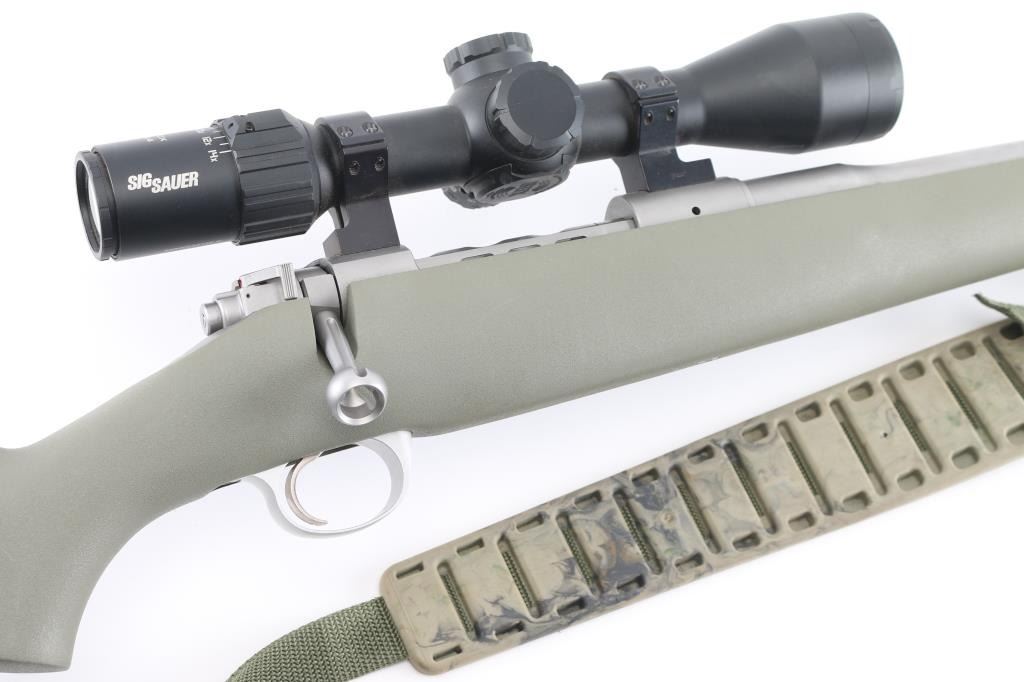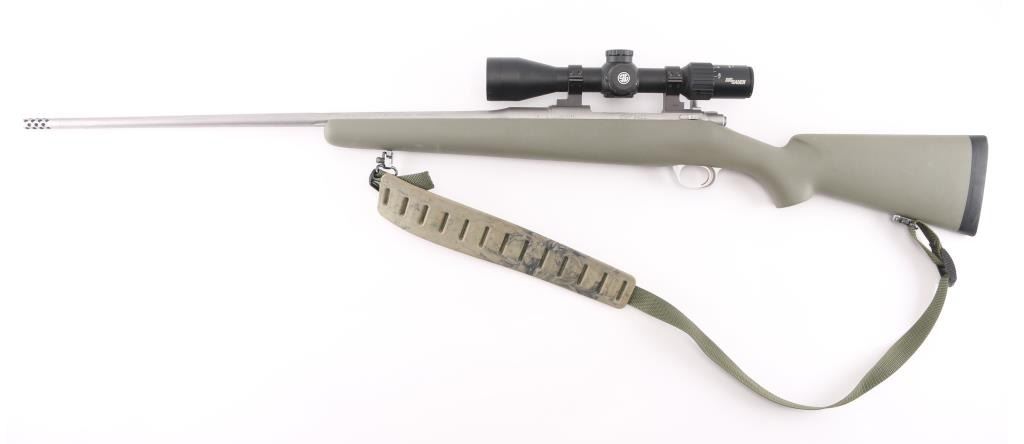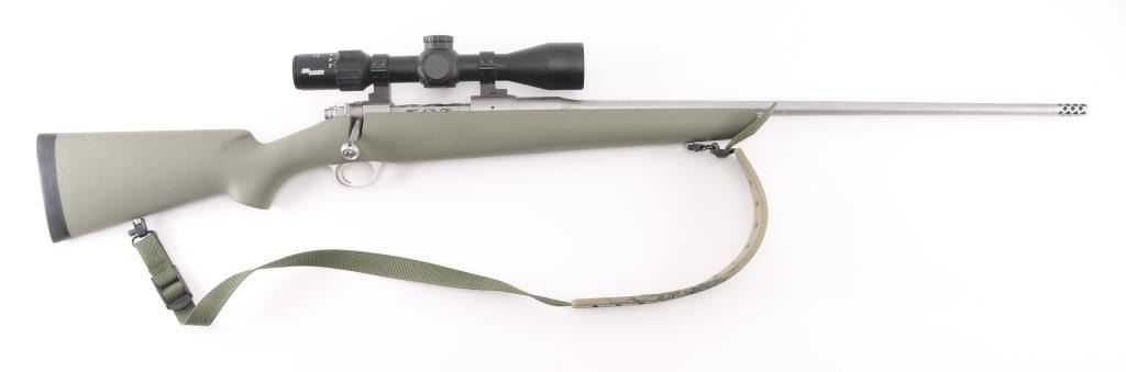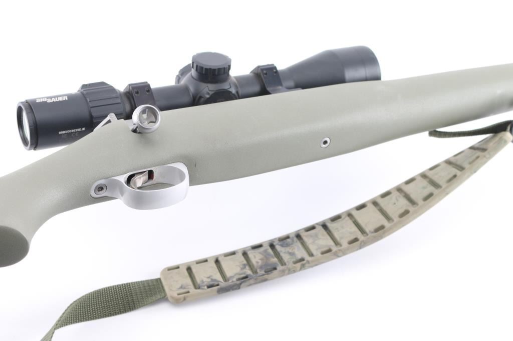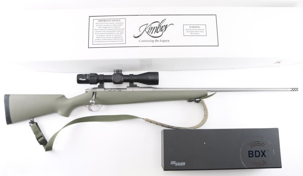 Ultra lightweight bolt action "Mountain Ascent" model ,25" fluted barrel with ported muzzle brake, no provisions for sights, spiral fluted bolt with fluted and hollow handle, LW triggerguard, plain pistol grip green synthetic stock, solid factory rubber recoil pad, padded green nylon sling. Mounted with a Sig Sauer Sierra 3 BDX 4.5-14x44 scope, clear optics. 3 position safety on bolt. Bore is very good, action is smooth/tight, stock and finish are excellent. Includes matching Kimber factory box, and the Sig Sauer scope box. NRA Condition-Excellent. Modern Firearm.