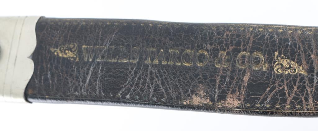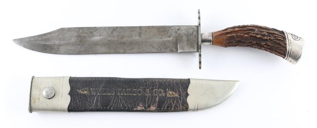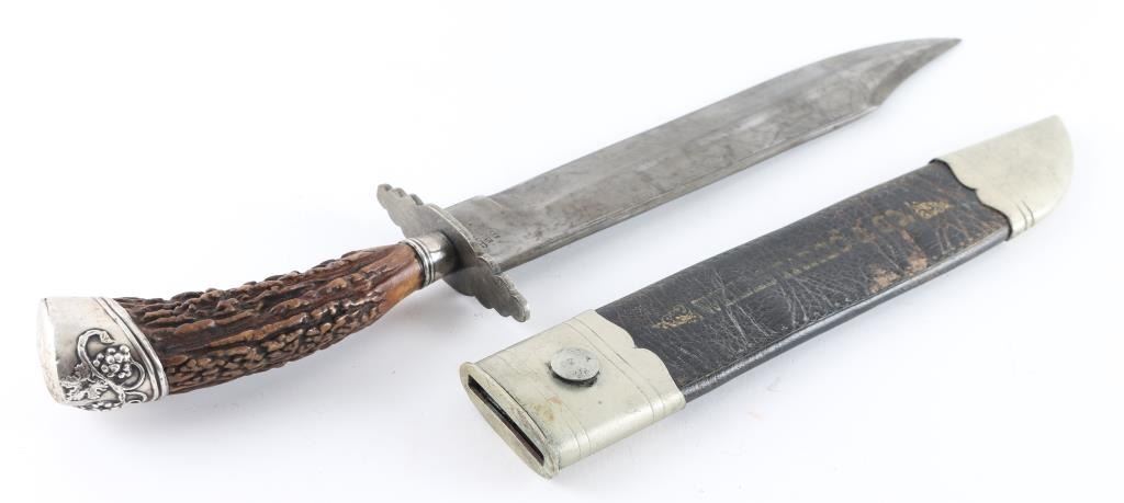 Bowie Knife maker marked with antler handle, sterling cap with grape motif, 16" overall with a 10", with leather sheath which has a "Wells Fargo". In the style of 1860s but age uncertain.