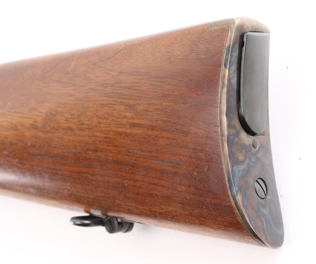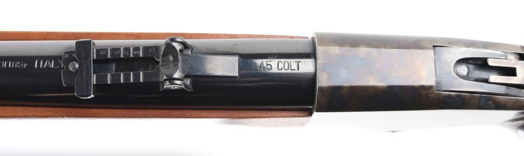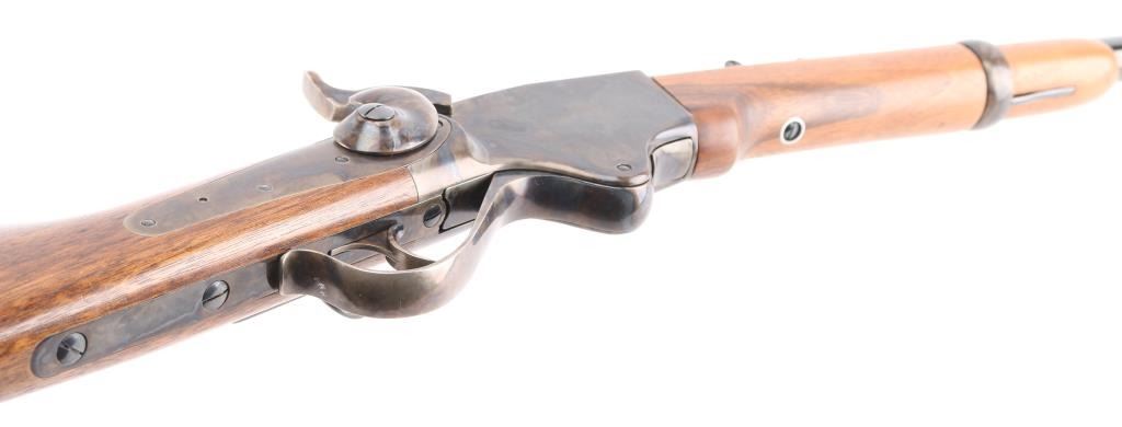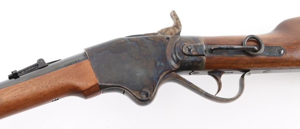 SN: M52101Manufactured in Italy and imported by Taylor & Co. Winchester VA. Copy of the Civil War Cavalry saddle ring carbine. Lever action fed from a 7-rd tube magazine in the buttstock, 20" round blued barrel with blade/adjustable ladder sights, case hardened receiver, buttplate, hammer, barrel band & lever. hand oiled stock & forearm, saddle ring. High polish blue barrel & case colors are excellent, two cock action is crisp/tight, bore is pristine, wood is near excellent with a couple of minor scratches. Appears unfired. NRA Condition-Excellent. Modern Firearm.
