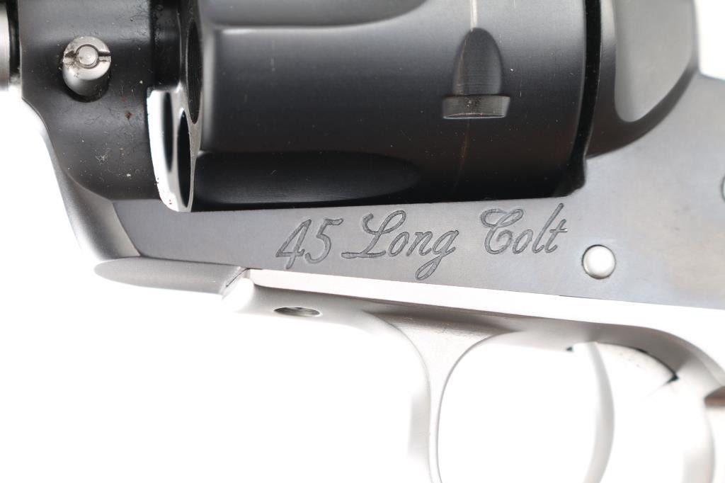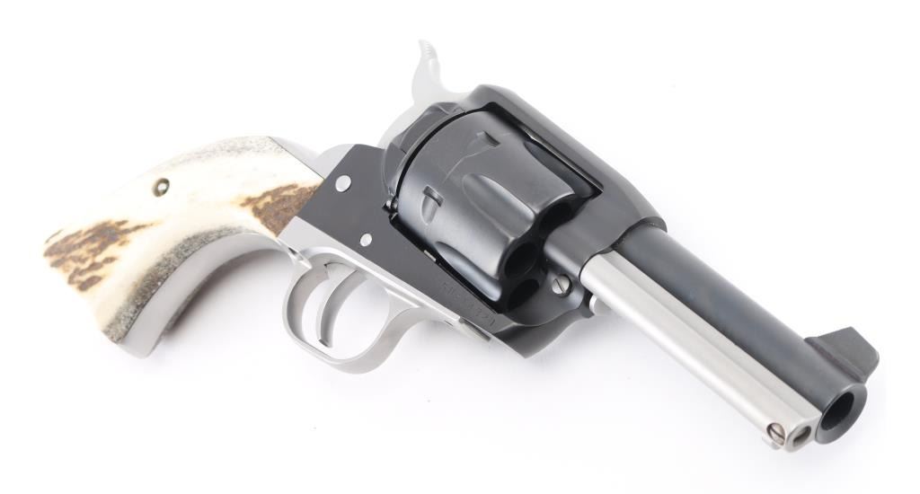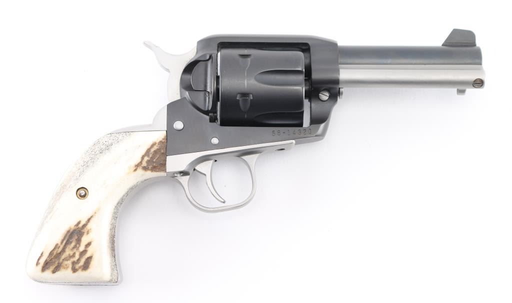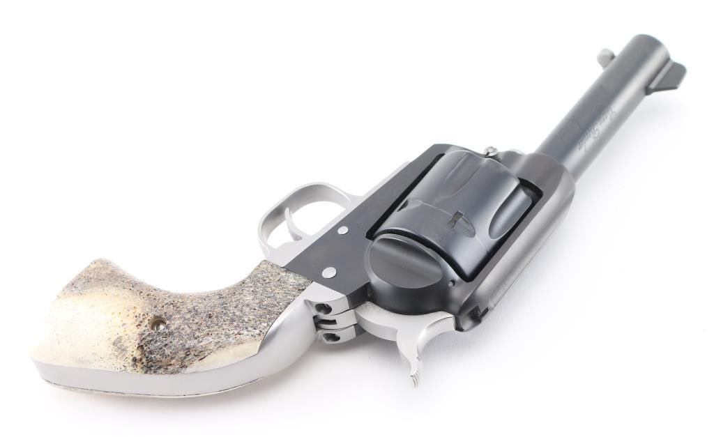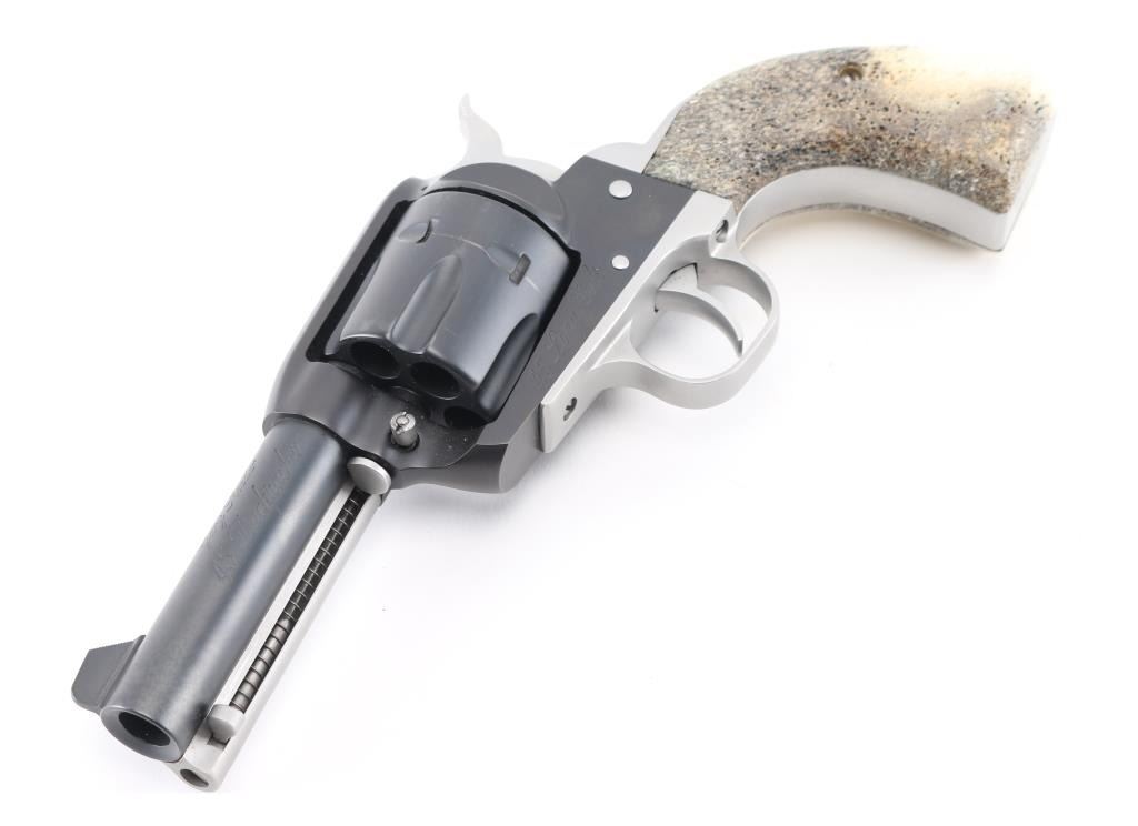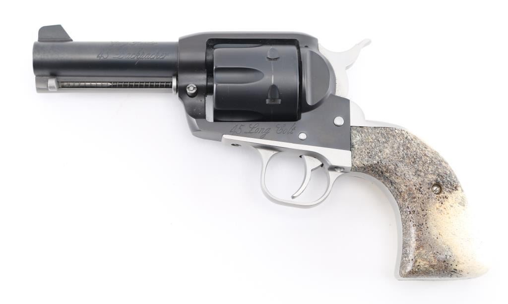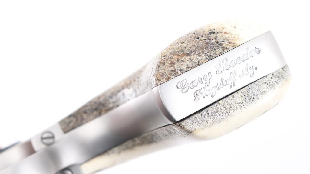 SN: 58-14320. Custom revolver by Gary Reeder of flagstaff, Arizona, Built on a Ruger Vaquero revolver. Manufactured 2001. 3 3/4' barrel with fixed notch/blade sights, two tone finish matte black finish with matte stainless cylinder, screws, ejector rod, and hammer. Stag grips. "Gary Reeder 45 Backpacker" engraved on left barrel. "45 Long Colt" on left frame, & "Gary Reeder Flagstaff, AZ" on heel. Bore is pristine, action is crisp, grips are excellent, finish is about 98% with minor tracking on cylinder. Comes with the original factory case with manual & lock, and Gary Reeder gun sock. NRA Condition-Excellent. Modern Firearm.