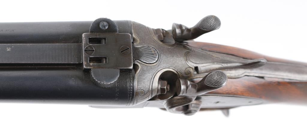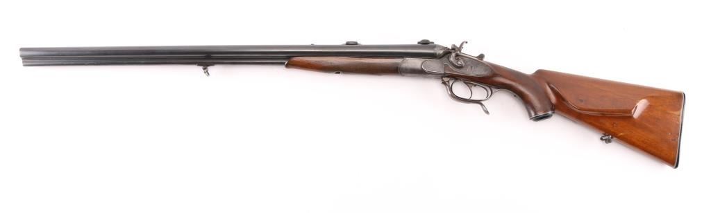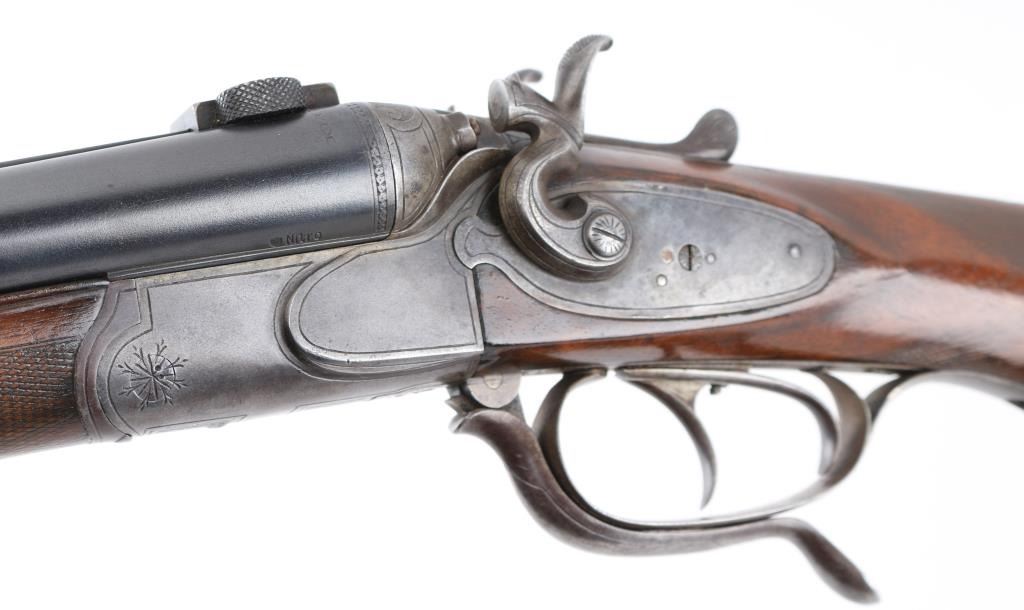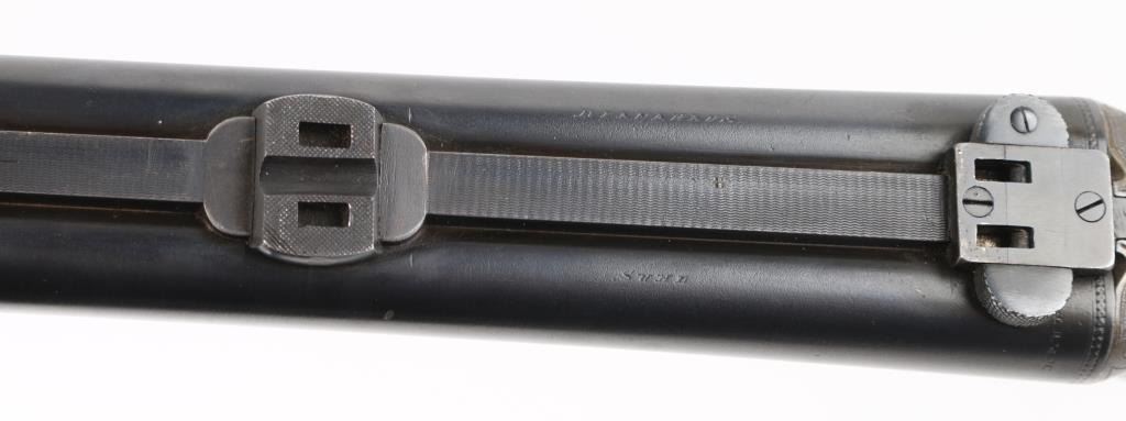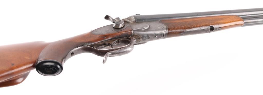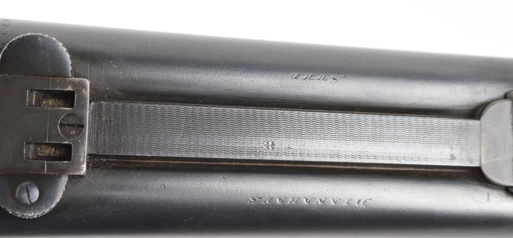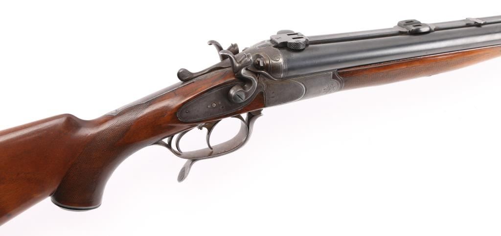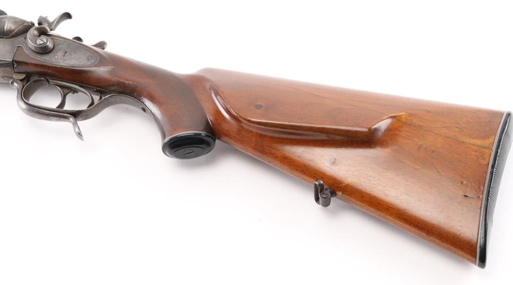 SN: 139. German made combination rifle/shotgun by Dianahaus, Suhl. could not find any reference to this maker. Features 26 3/4" barrels with post/bead, and flip notch sights, knurled rib, scope base, external hammers, tang selector lever, double triggers, bottom lever, checkered forearm, and pistol grip stock with German style cheek piece. Matched serial number on receiver, and barrel, sling swivels. Barrels are maker marked along with "Krupp Stahl" & "Nitro", German proofs on receiver, & barrels, Underside of barrels marked "Flussstahl Krupp Essen".Bores are very good. action is crisp/tight, barrels lock up tight, wood is sound with wear to the checkering, and some minor scratches/dings, and a hairline crack in the left buttstock, barrels have been re-blued at some point, and the marker marks are feint. There is a very slight dent on the upper left barrel, does not interfere with bore. missing lower tang screw, and the single set trigger is not functioning. NRA Condition-Fair. C&R Firearm.