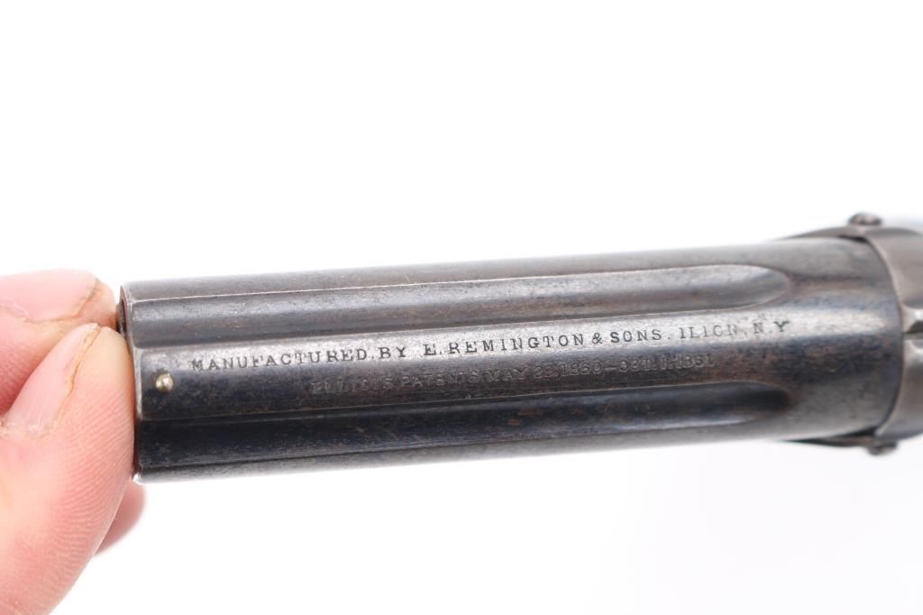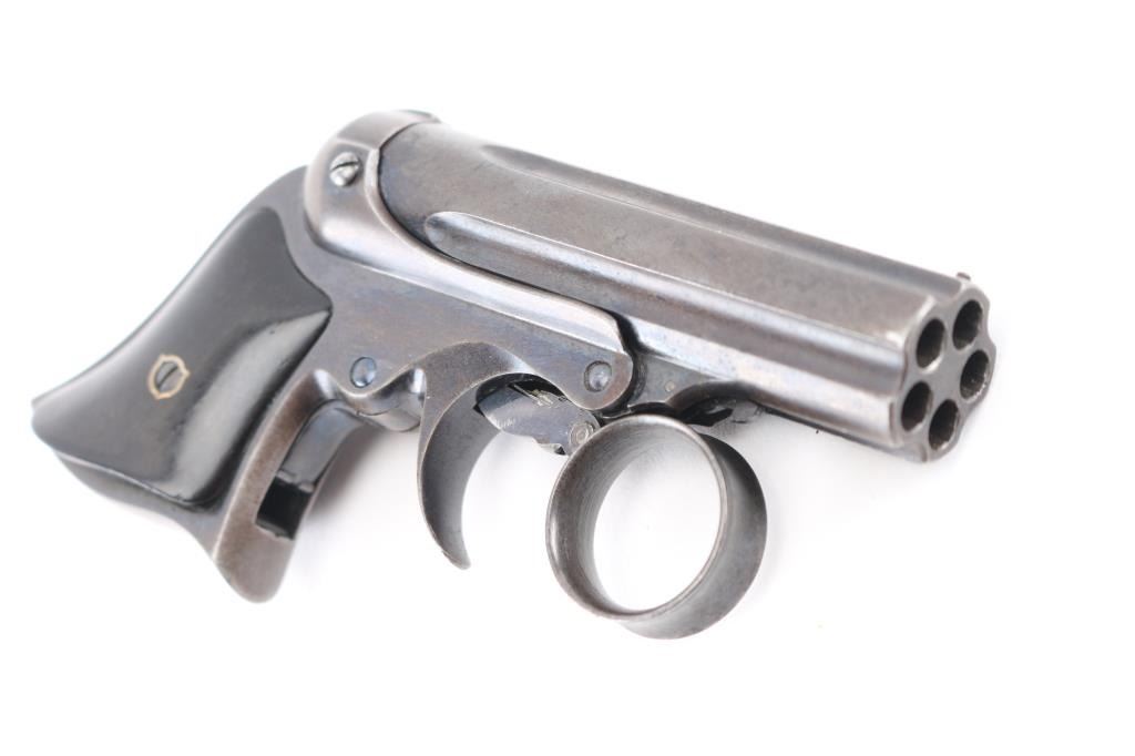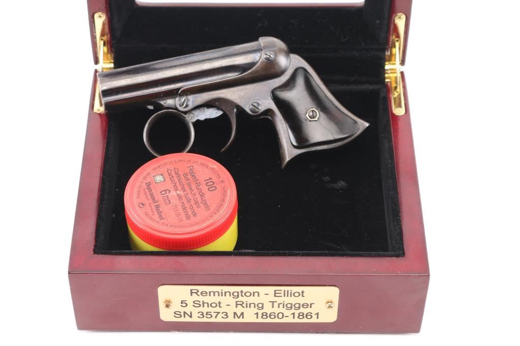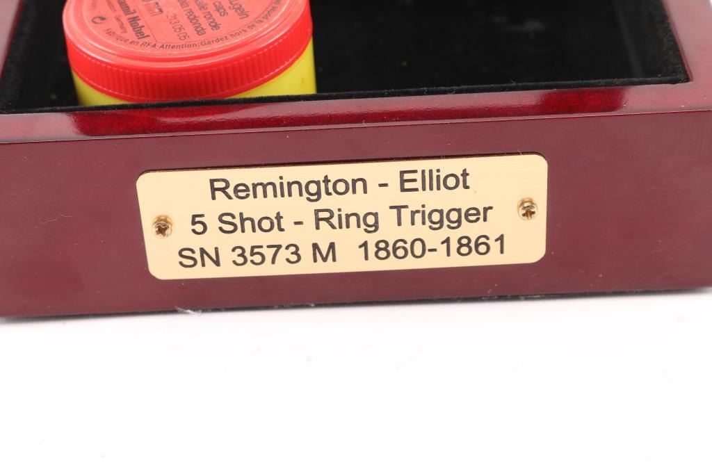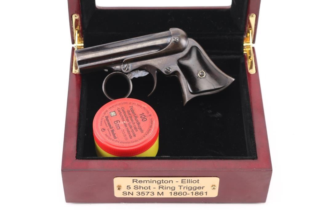 Rare Remington-Elliot "Pepperbox" Derringer, made 1863-1870's with estimated 30% in .22 caliber, blue finish brings premium, (Flayderman) Five shot stationary fluted 3" barrel with revolving firing pin, ring type trigger. Barrel tilts forward for loading. Smooth rosewood grips, matched serial numbers on the underside of barrel, & inside of frame, barrel lug marked "M". Barrel marked "Manufactured by Remington Sons, Ilion, NY Elliot's Patent May 29,1860, Oct 1, 1861.An improved version of the "Zig-Zag" derringer. Very fine condition as a antique firearm, rifled bores are very good/bright, need cleaning, about 40% of the blue finish remaining with handling loss, grips are good overall, except the left panel has a crack, mechanically excellent. Comes in nice felt lined glass topped display case with brass plate with info on this gun, including a box of German made 6mm Flobert/ 22 BB Cap bullets (Bulleted Breech Cap) which also fit this gun. Scarce in this condition. NRA Condition-Fine. Antique Firearm.