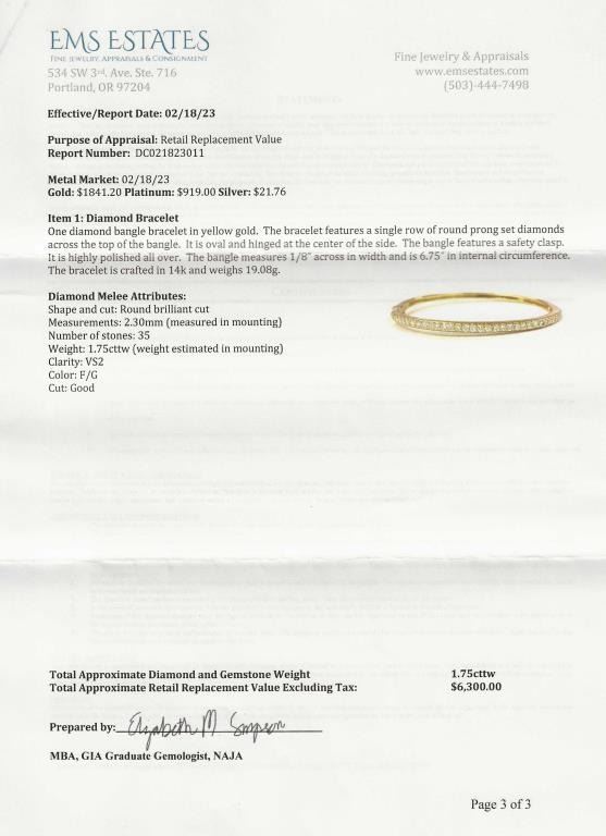 featuring 36 round ‘IDEAL’ cut Diamonds weighing approx. 1.75 carats with F-G colors and VS clarity crafted in heavy 18 karat yellow gold, with safety latch. Full Retail Appraisal $6,300.00