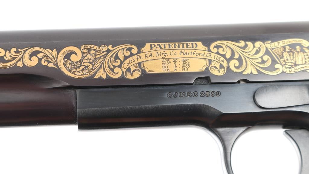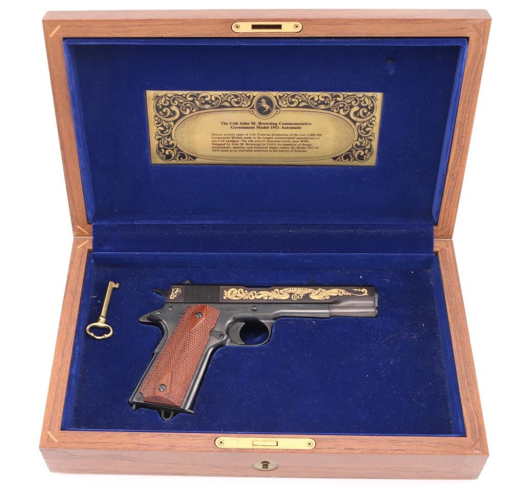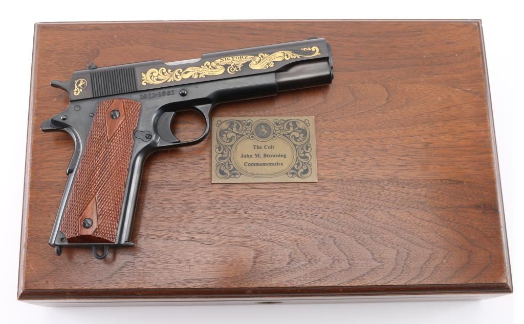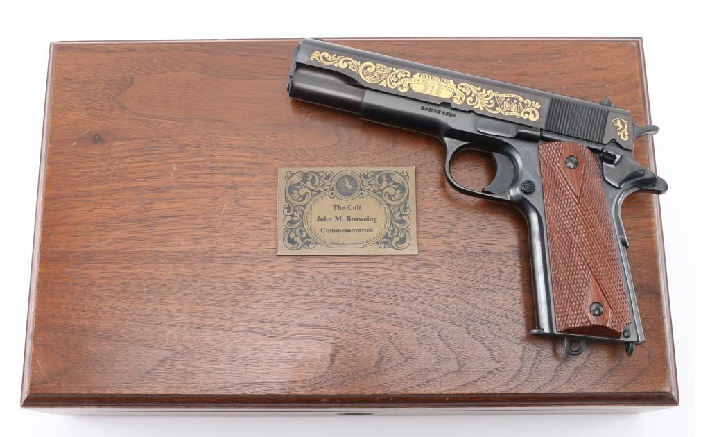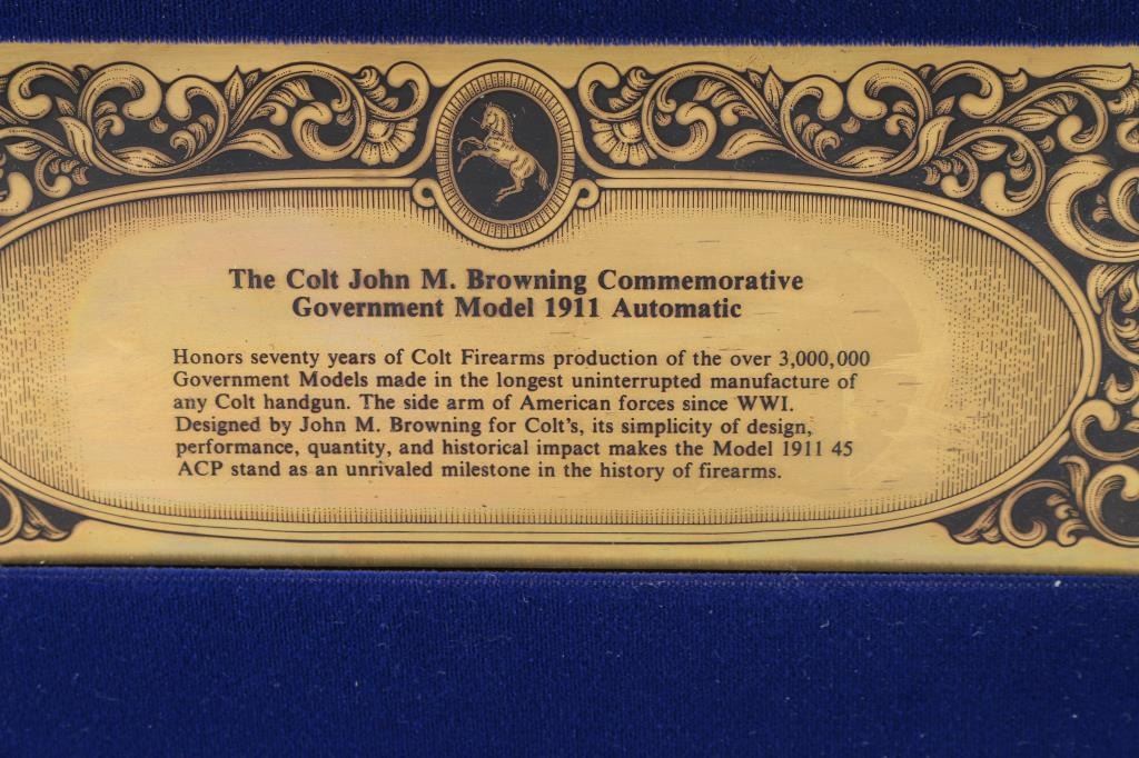 SN: CJMBC2589. John M. Browning Commemorative' 1911 style pistol, manufactured circa 1981 Based on the 1911 design with flat mainspring housing. Features blued finish with gold inlay accents on both sides of slide, 5" barrel, fixed sights, manual & thumb safeties, double diamond checkered walnut grips, lanyard loops on butt and on base of supplied 7 round magazine. Comes in a blue felt lined inletted locking walnut case (key inside) with commemorative plaque on lid, and inside. Retains 99% finish with minor handling marks. Condition is NRA Excellent,
