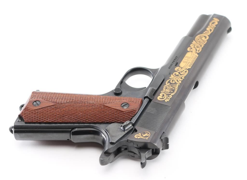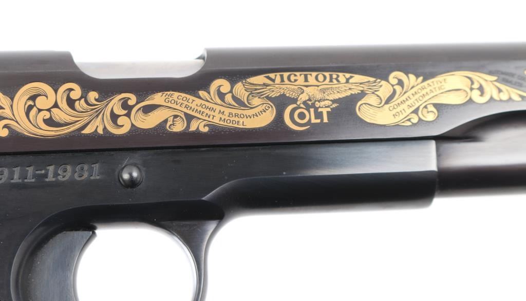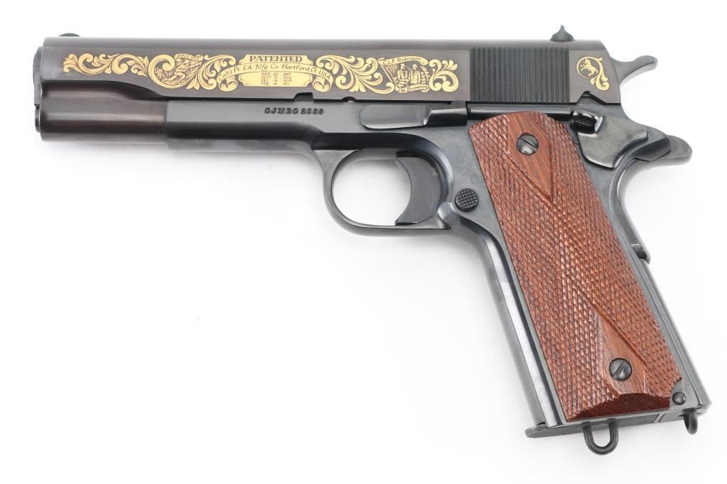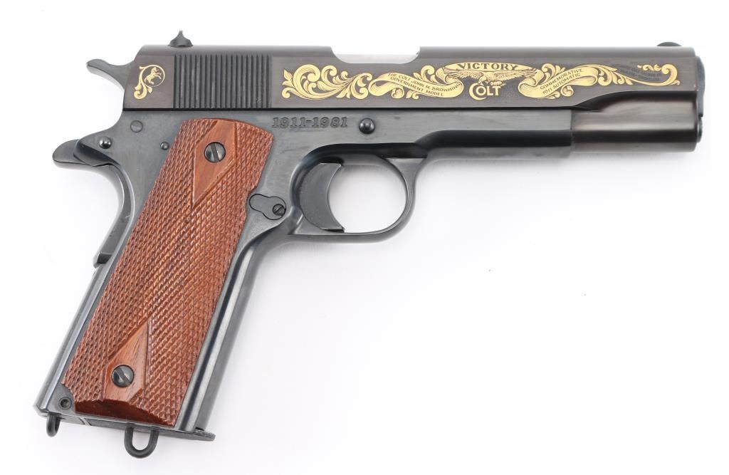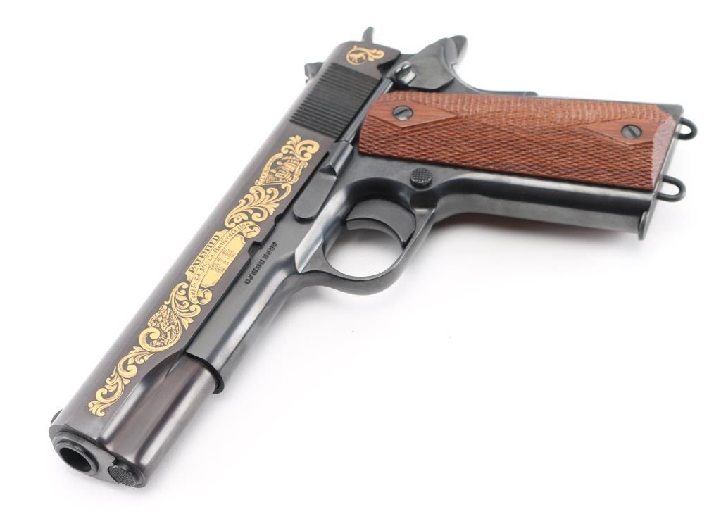 SN: CJMBC2589. John M. Browning Commemorative' 1911 style pistol, manufactured circa 1981 Based on the 1911 design with flat mainspring housing. Features blued finish with gold inlay accents on both sides of slide, 5" barrel, fixed sights, manual & thumb safeties, double diamond checkered walnut grips, lanyard loops on butt and on base of supplied 7 round magazine. Comes in a blue felt lined inletted locking walnut case (key inside) with commemorative plaque on lid, and inside. Retains 99% finish with minor handling marks. Condition is NRA Excellent,