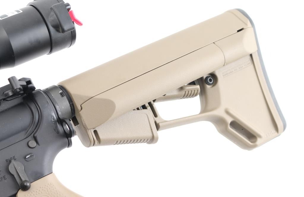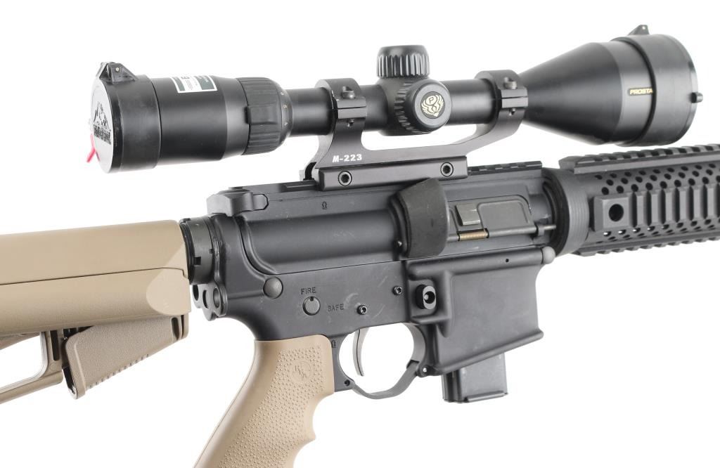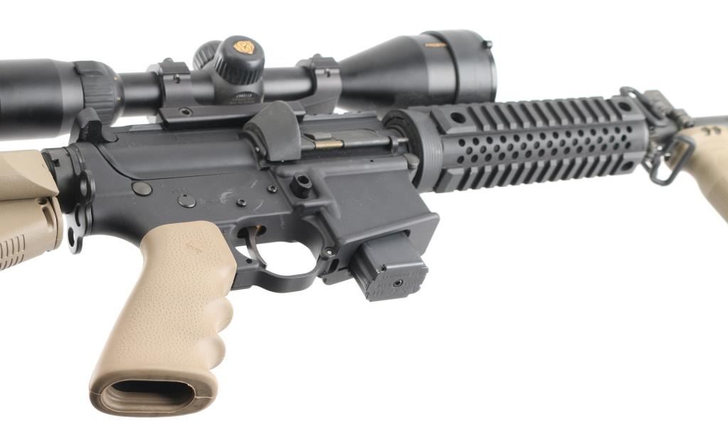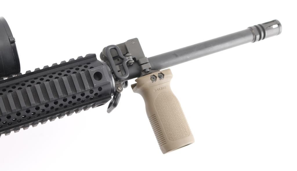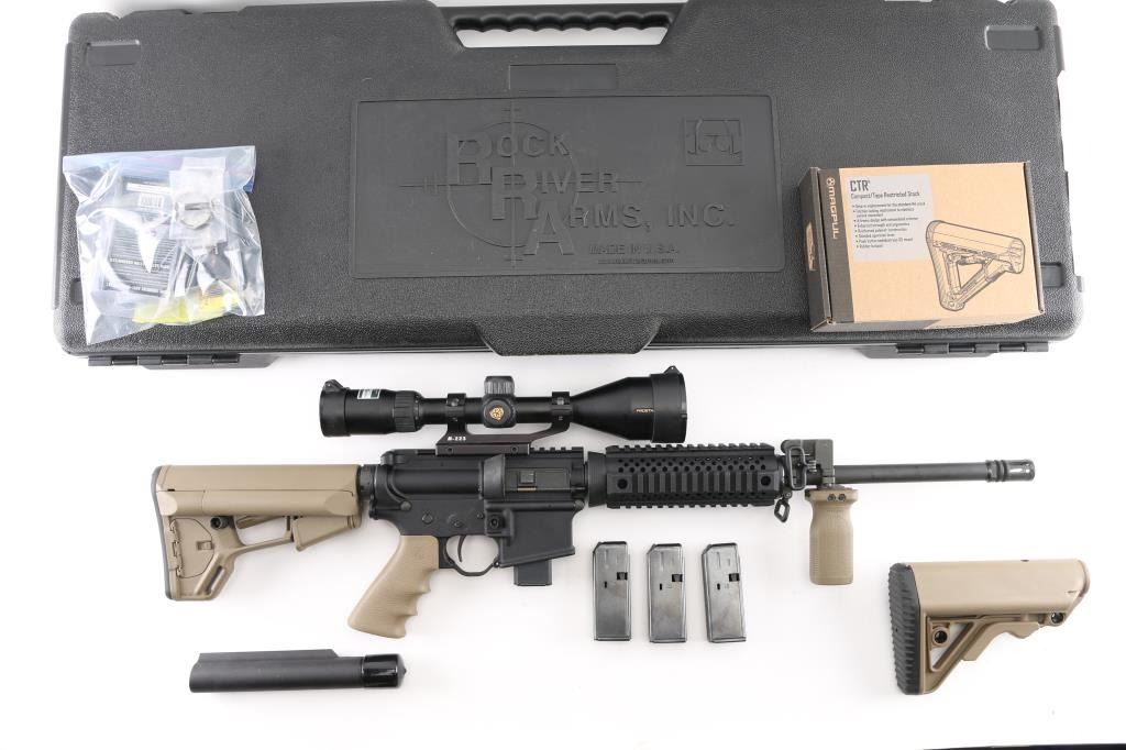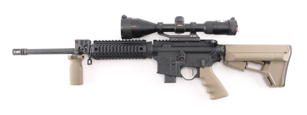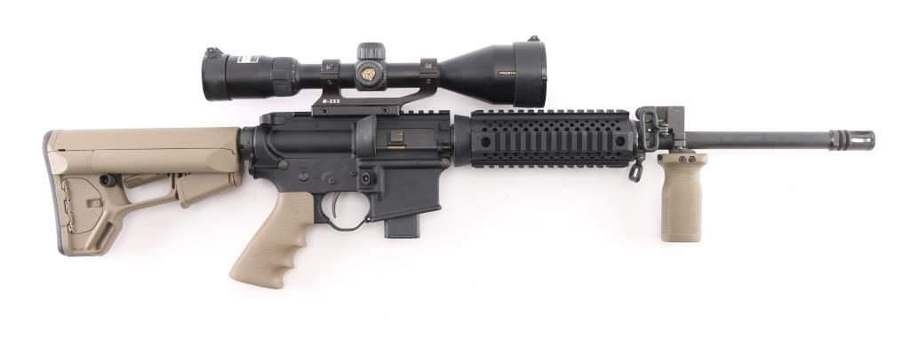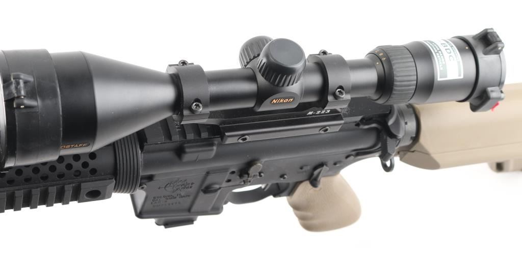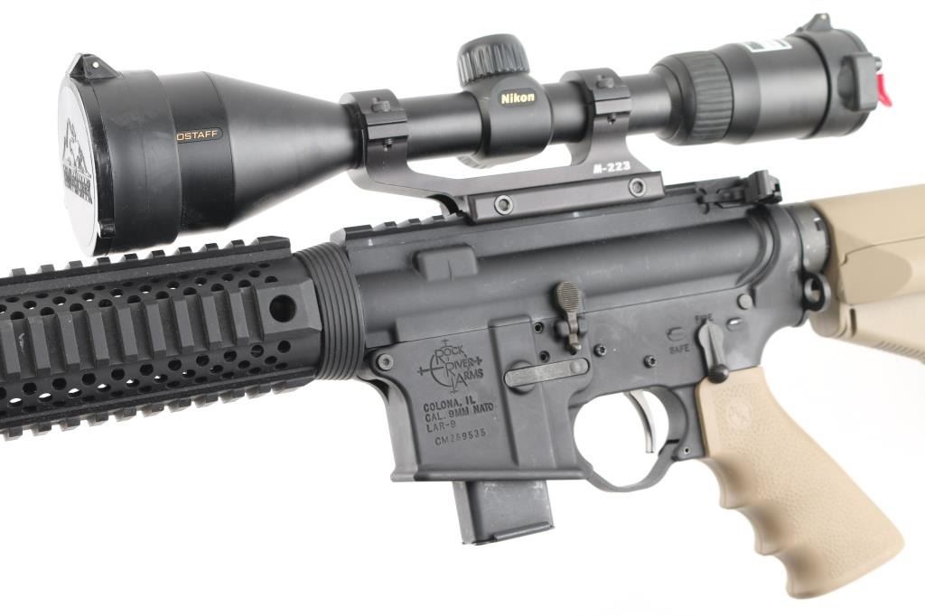 Upgraded semiautomatic mid-length carbine chambered in 9mm. 16" chrome Moly barrel A2 flash hider, forged A4 upper, standard bolt carrier group, RRA flip up front sight gas block assembly with 3 sling swivels, Timney trigger with winter triggerguard, RRA grip, Magpul ACS collapsible stock, RRA quad rail, free float handguard, Magpul MOE Vertical grip. BCM Gunfighter charging handle with extended latch. Matte black finish, shell deflector, dust cover. Bore is pristine, matte finish, and furniture are excellent. Mounted with a Nikon Prostaff 3-9x50 scope with long range hunting reticle on a M-223 base/rings. Clear optics. Includes one 10 rd magazine in rifle, three more in the RRA hard plastic case, Green tactical soft case with mag pouches, manual/documents, original RRA collapsible stock & tube, CMC trigger anti-walk pin set, KNS trigger group pin set, misc. springs/pins. NRA Condition-Excellent. Modern Firearm.